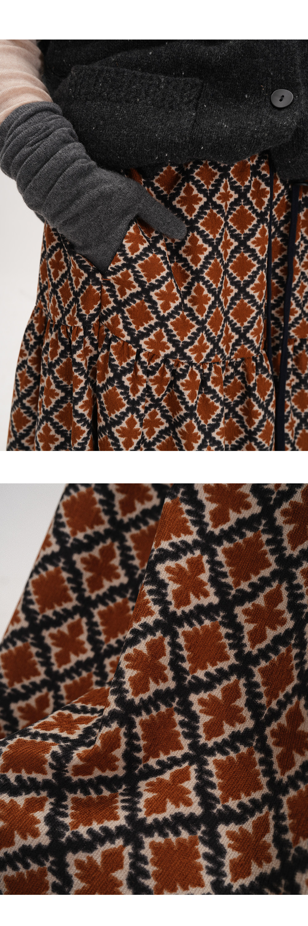【商品名】【ボトムス】秋冬らしい温もり素材 ⭐ プリントコーデュロイ ハイウエスト ゴムウエスト 学院風 シンプル ミモレ丈 スカート