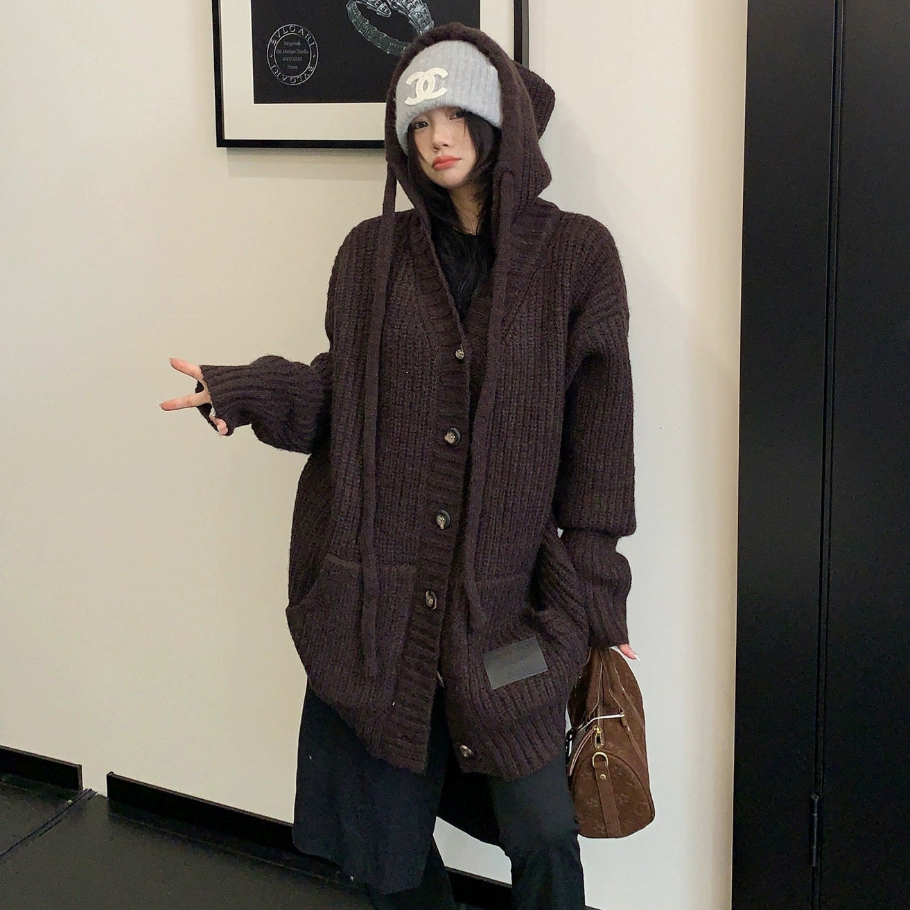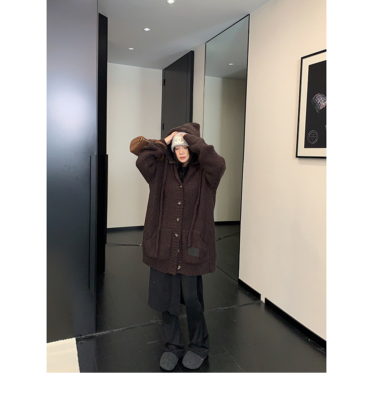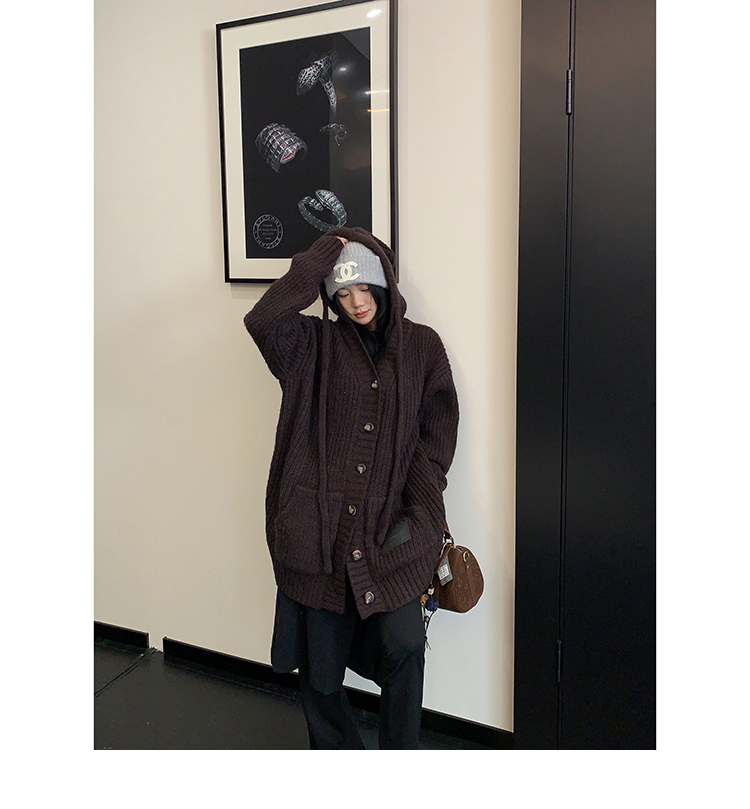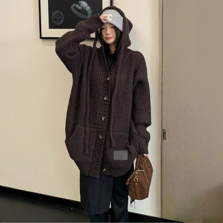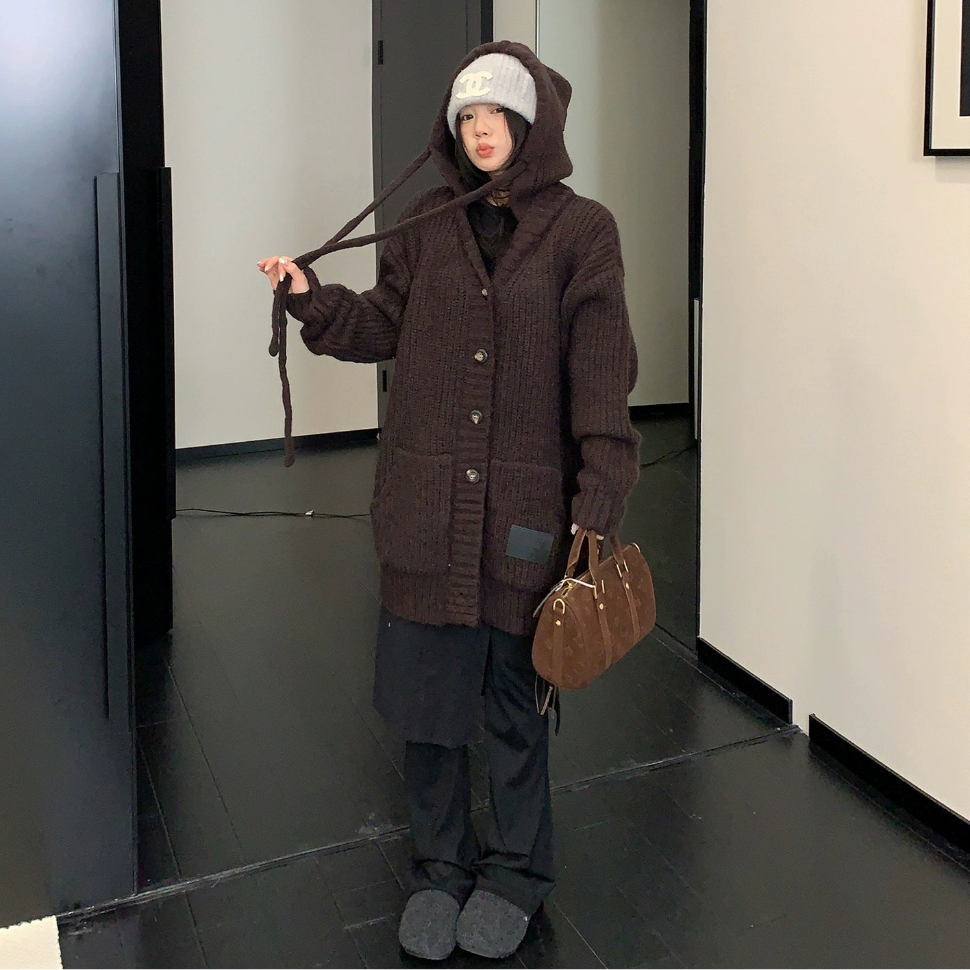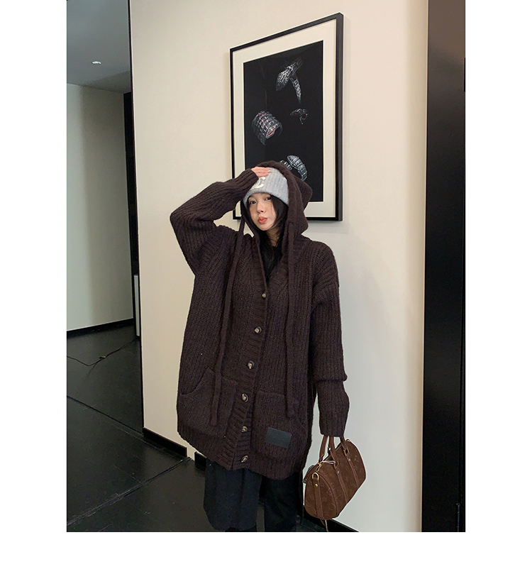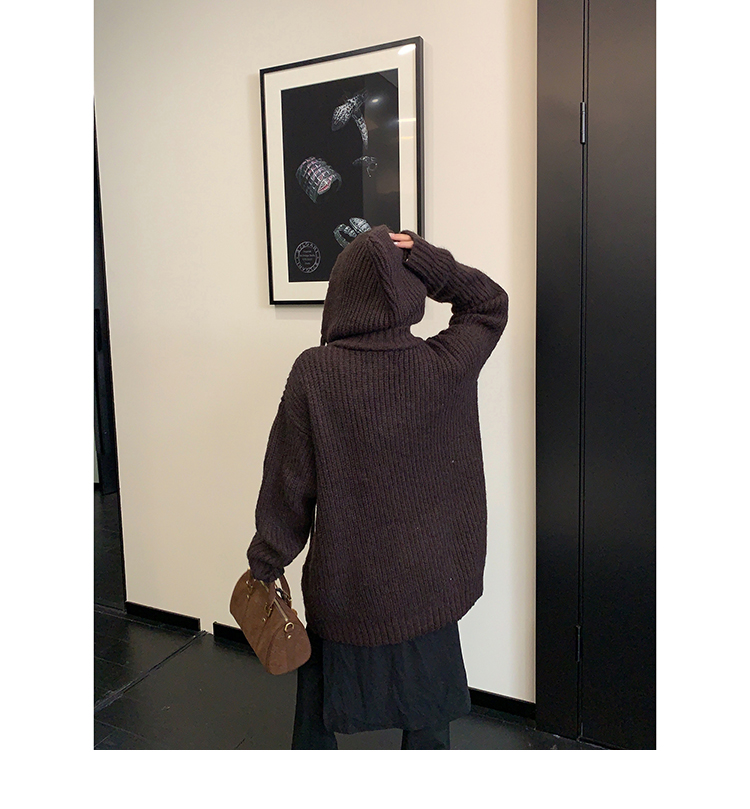 【商品名】【アウター】レトロ ヘビーゲージ 厚手 フード付き ニットセーター カーディガン