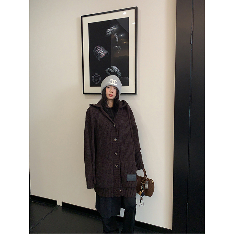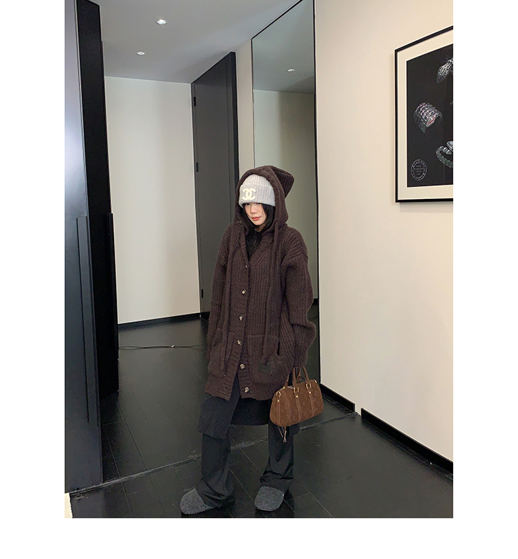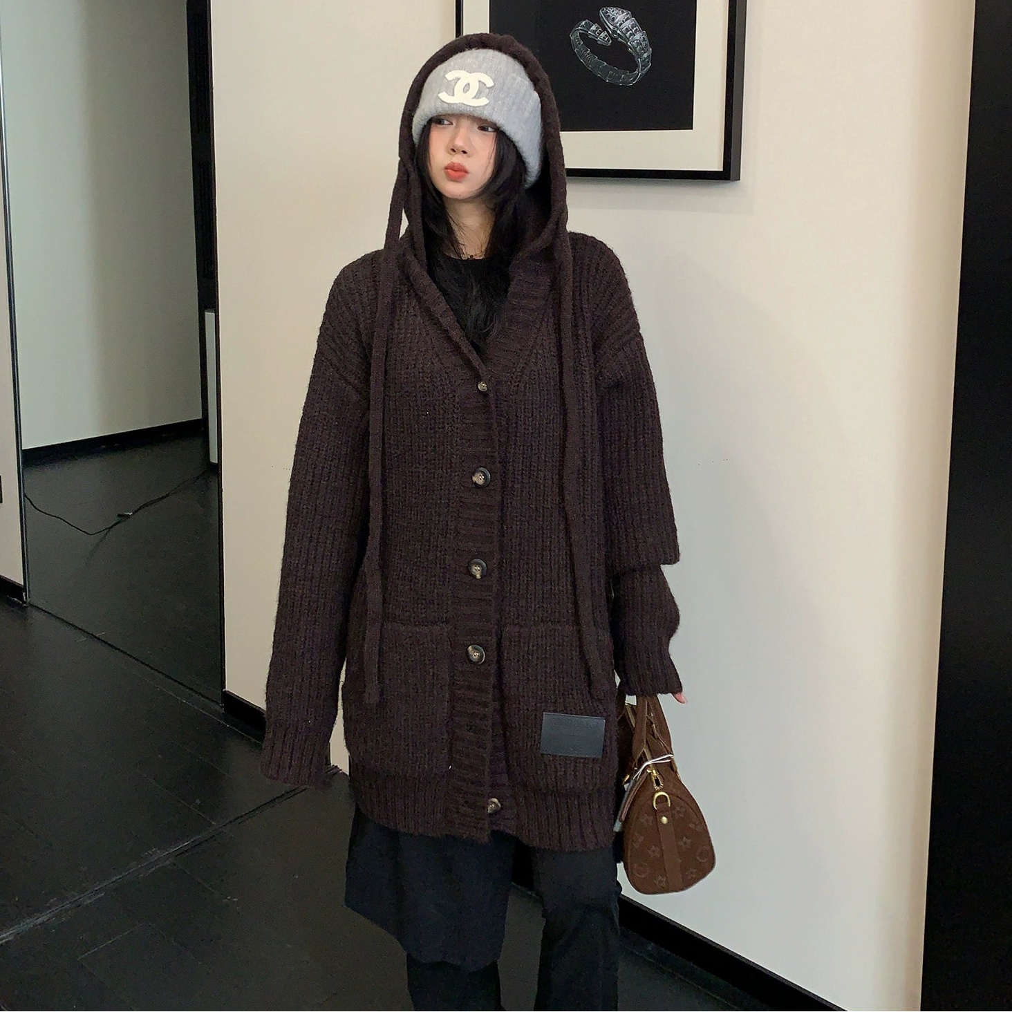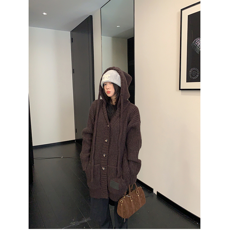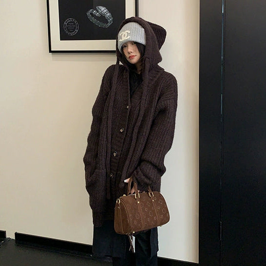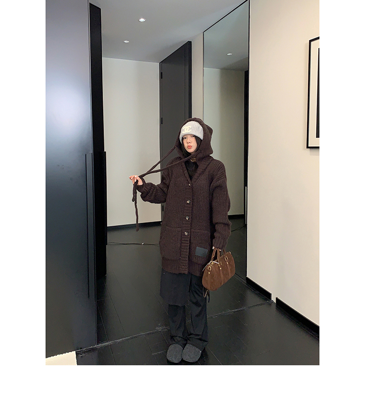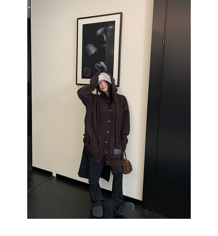【商品名】【アウター】レトロ ヘビーゲージ 厚手 フード付き ニットセーター カーディガン