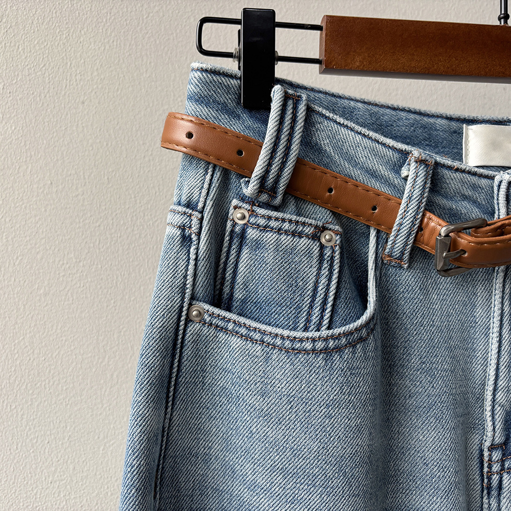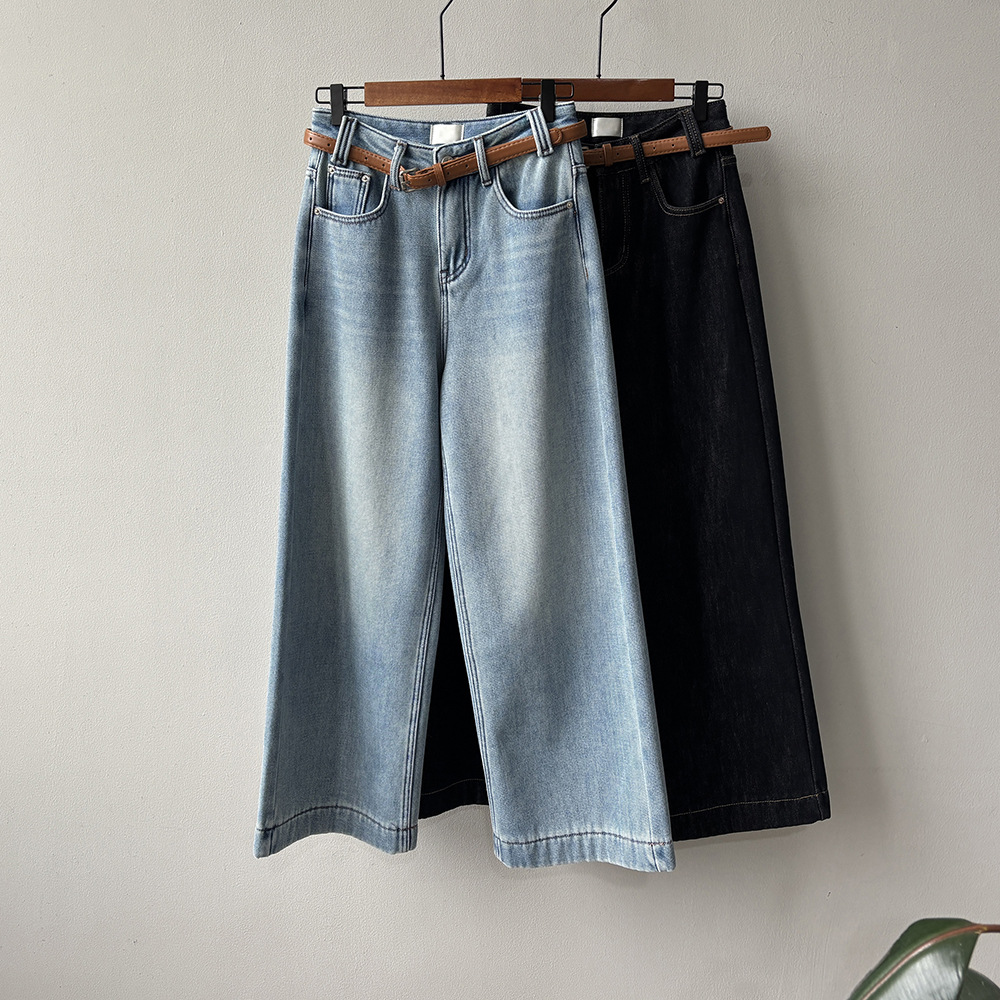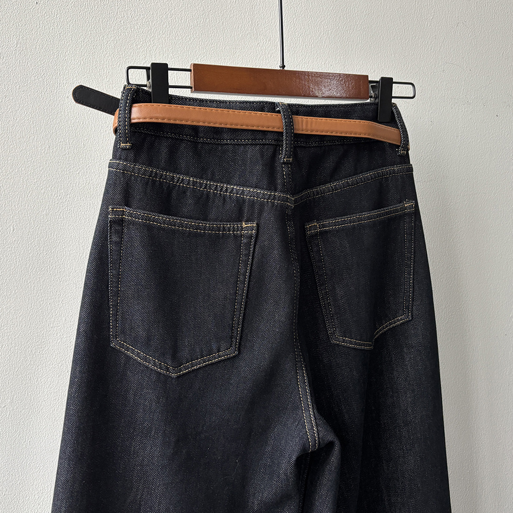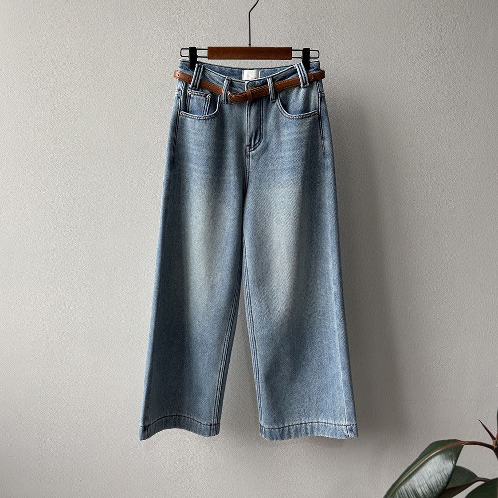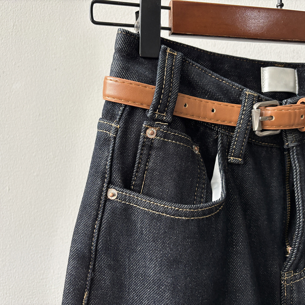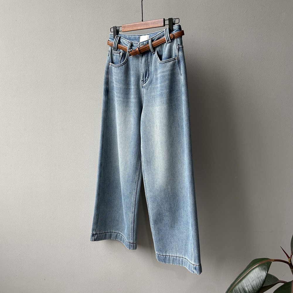 【ボトムス】ベルト付き!韓国風 ハイウエスト 裏起毛 ストレートデニムパンツ 冬 新作 ゆったりワイド カジュアル 【JZシリーズ】
