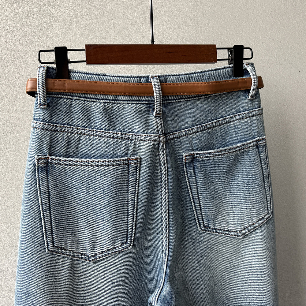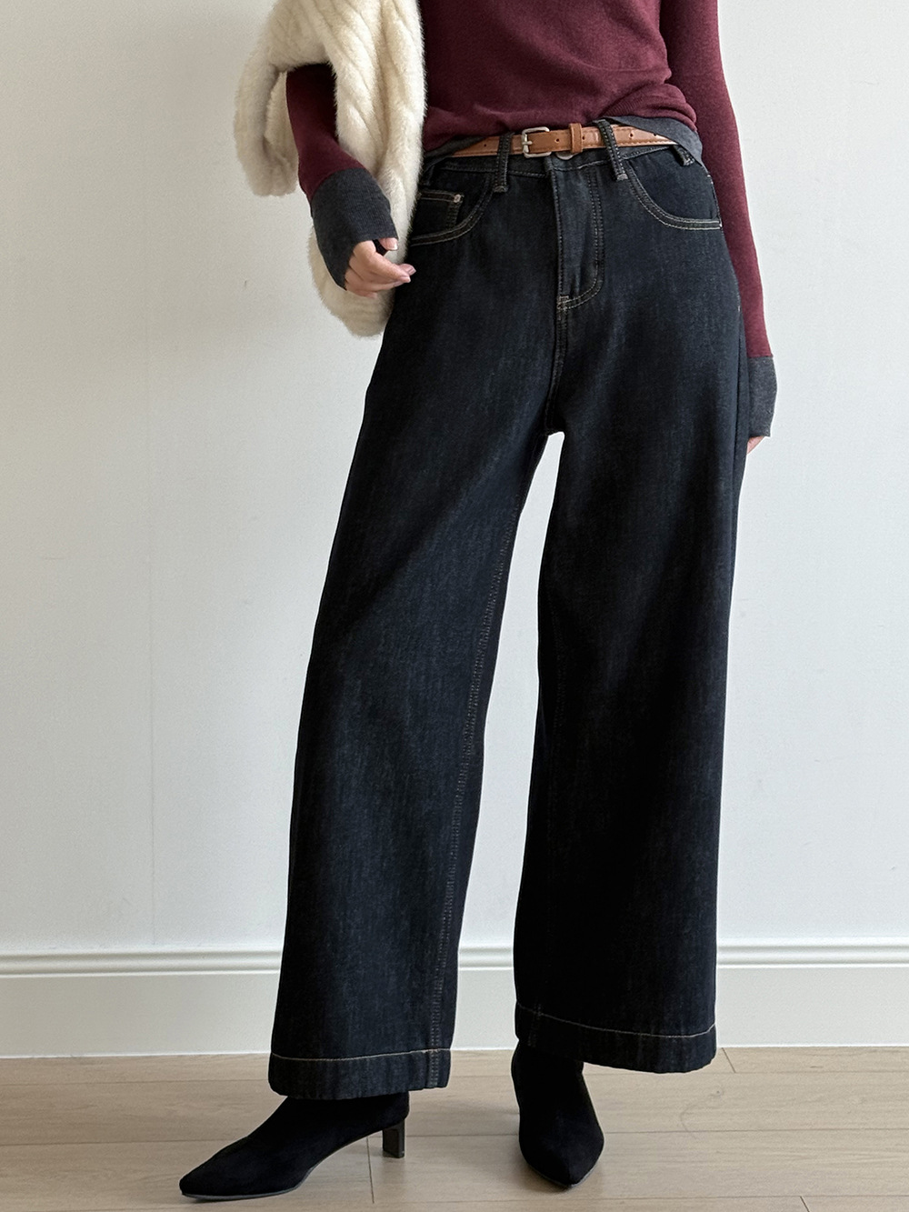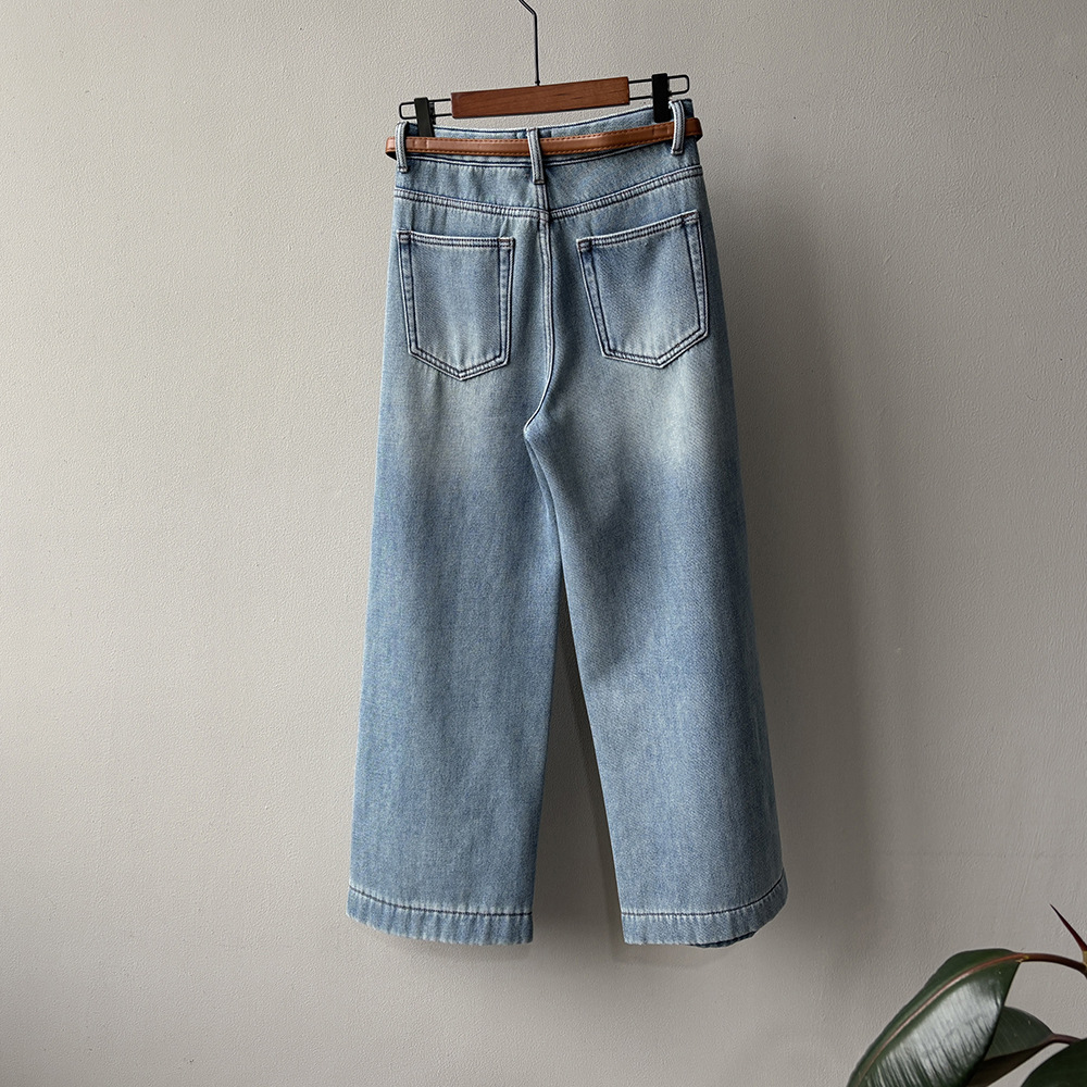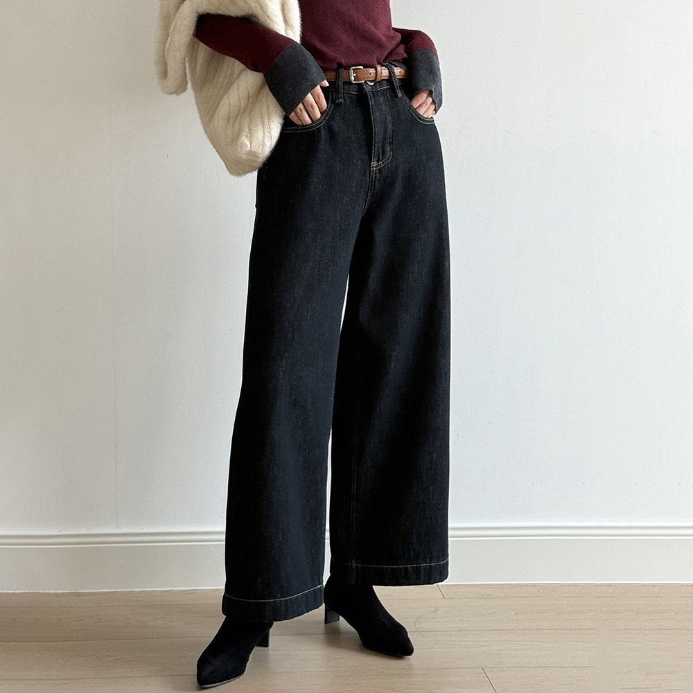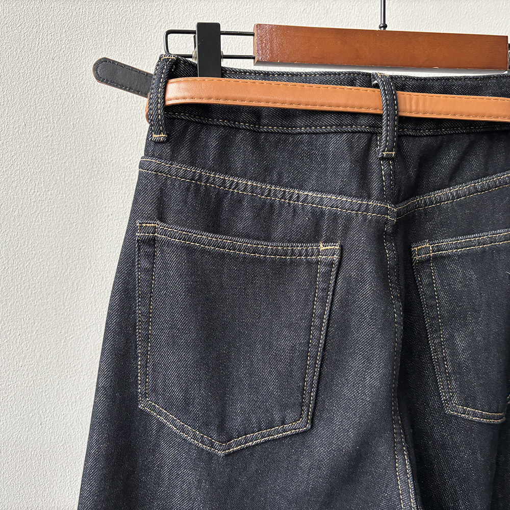 【ボトムス】ベルト付き!韓国風 ハイウエスト 裏起毛 ストレートデニムパンツ 冬 新作 ゆったりワイド カジュアル 【JZシリーズ】