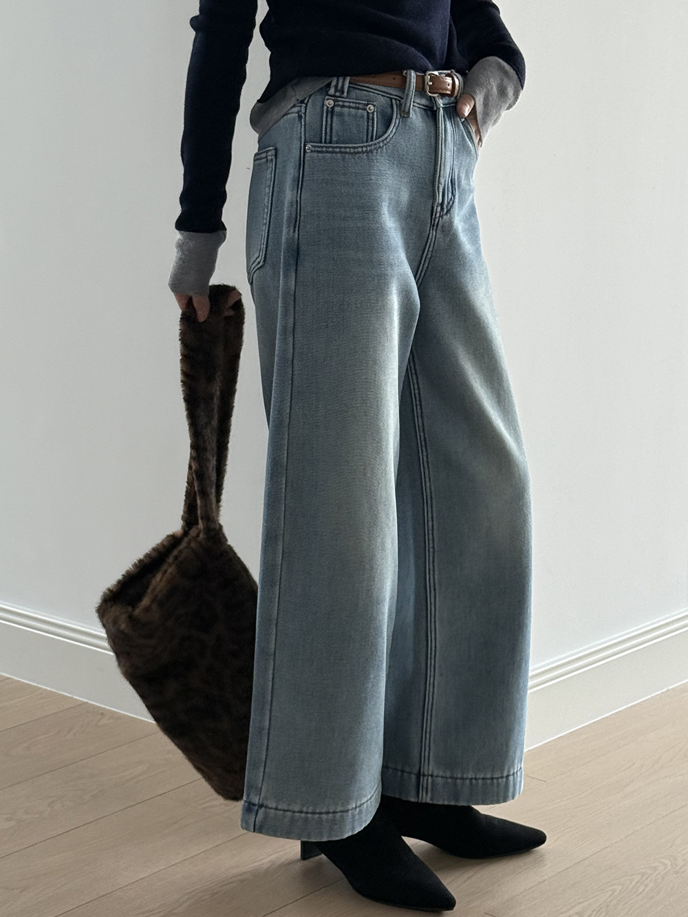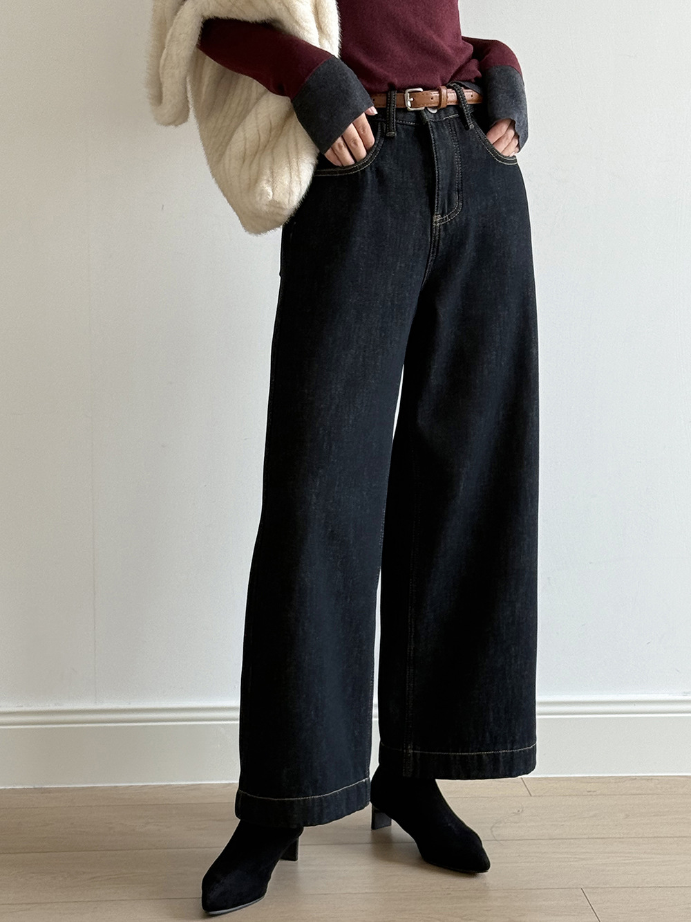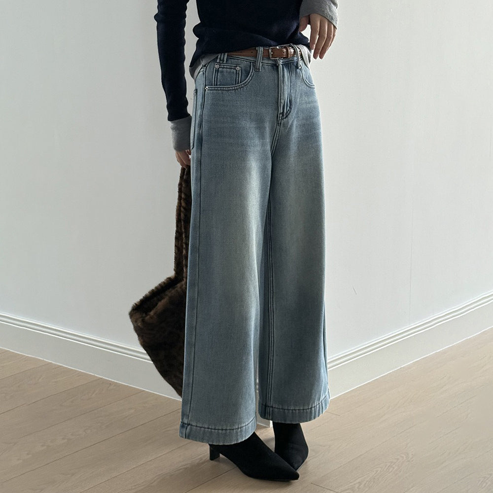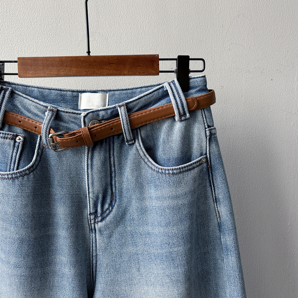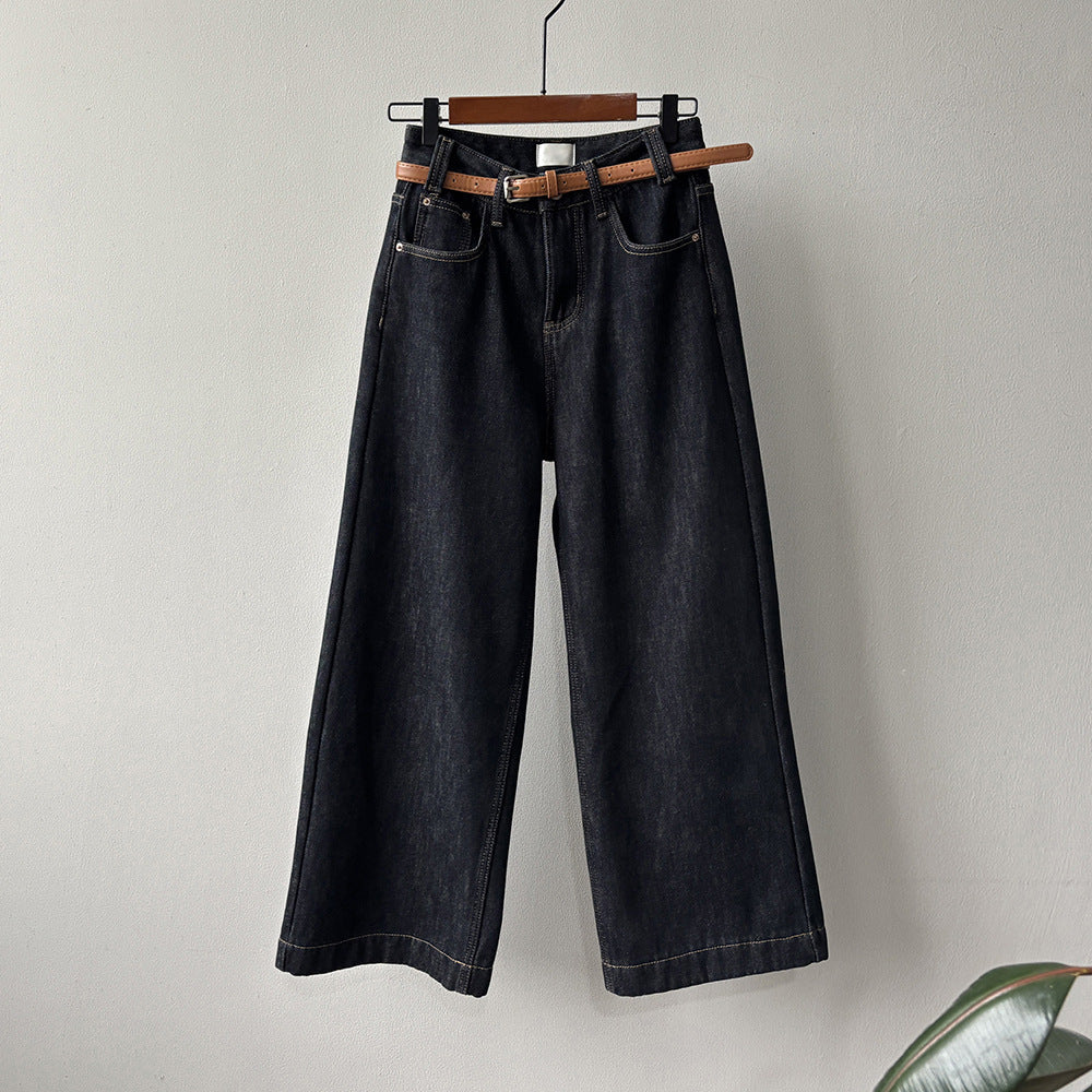 【ボトムス】ベルト付き!韓国風 ハイウエスト 裏起毛 ストレートデニムパンツ 冬 新作 ゆったりワイド カジュアル 【JZシリーズ】