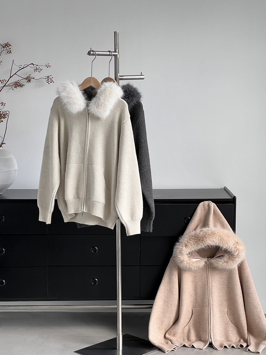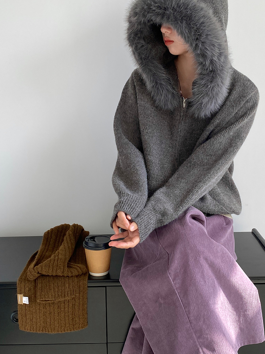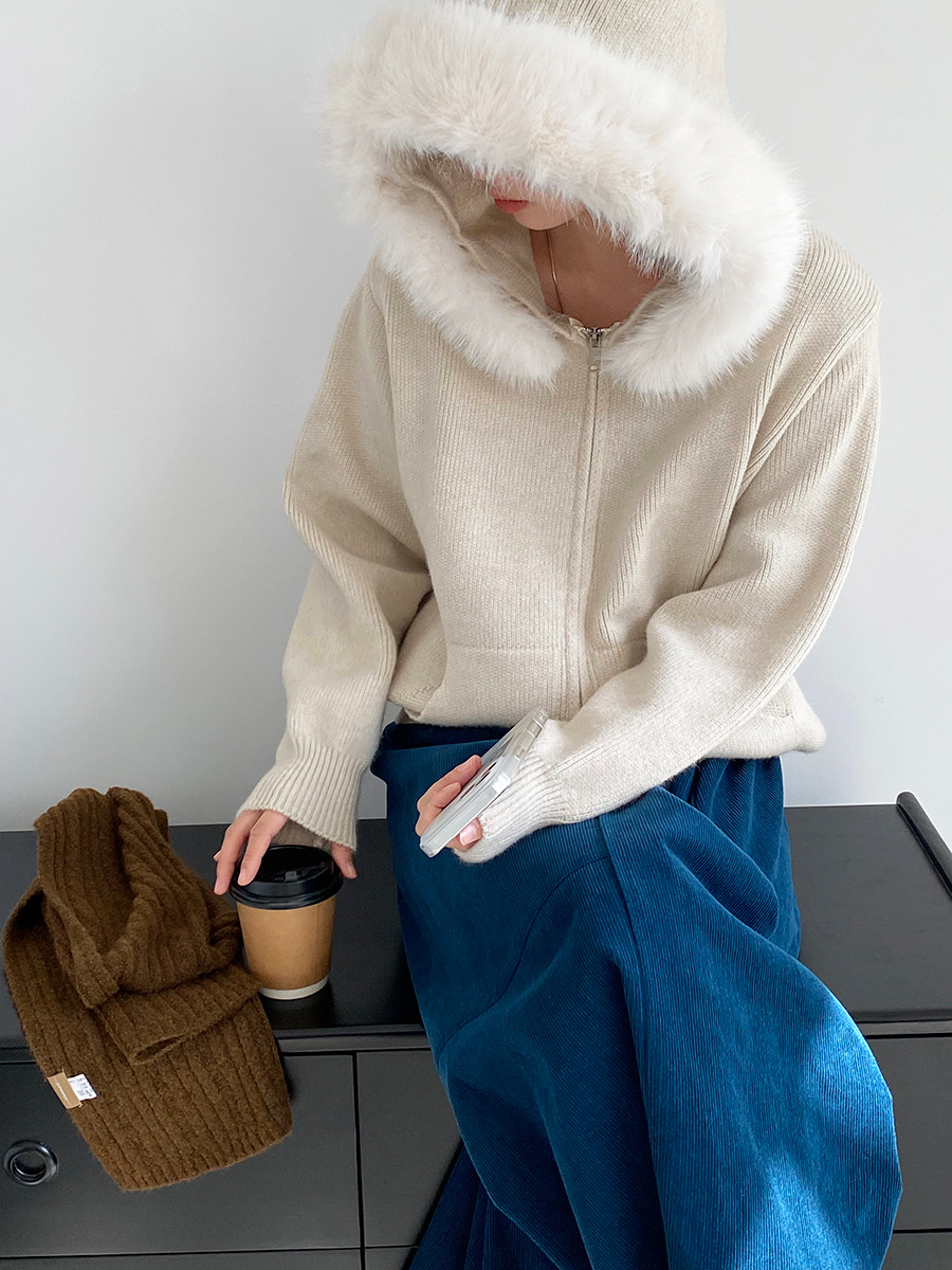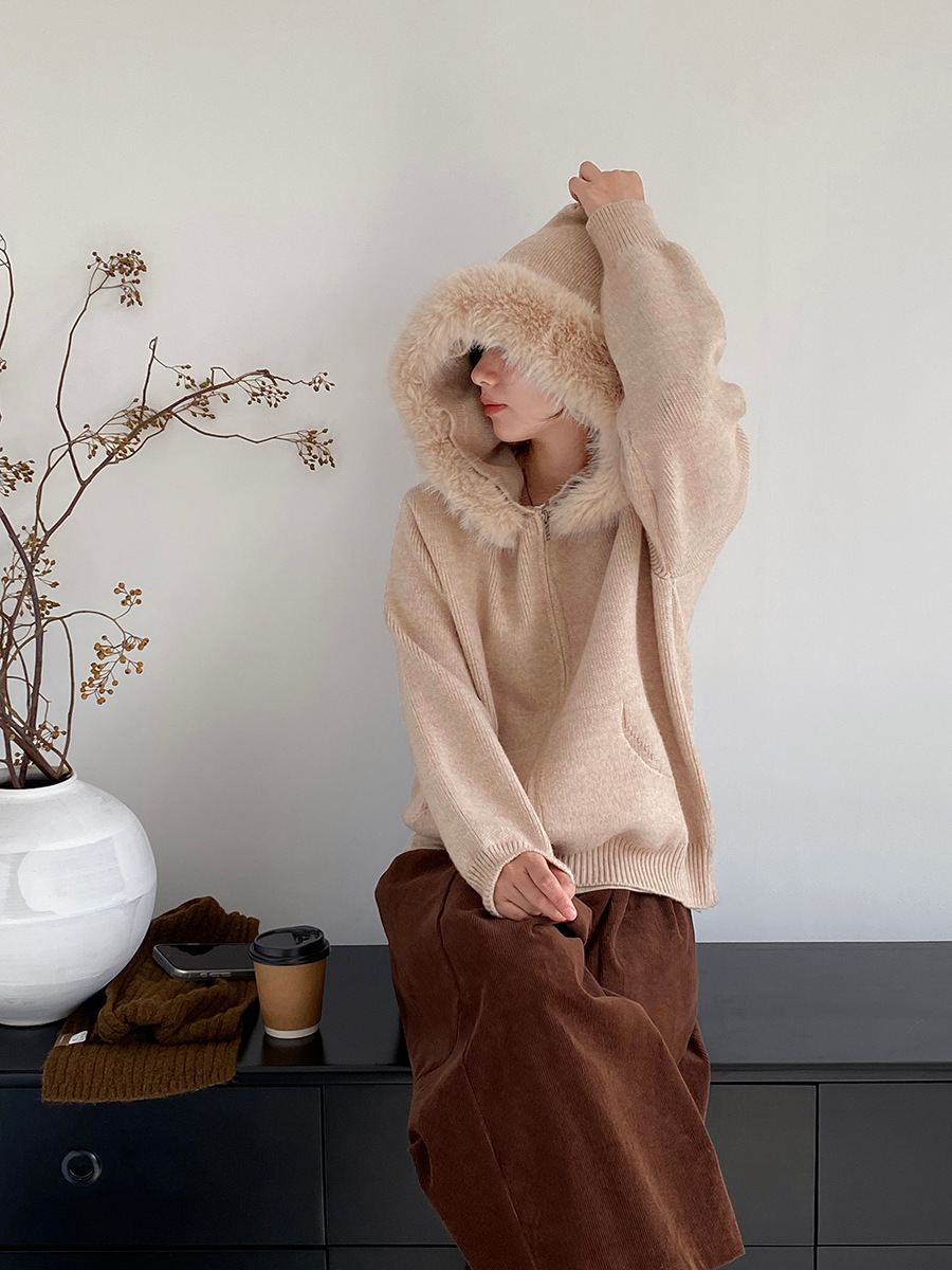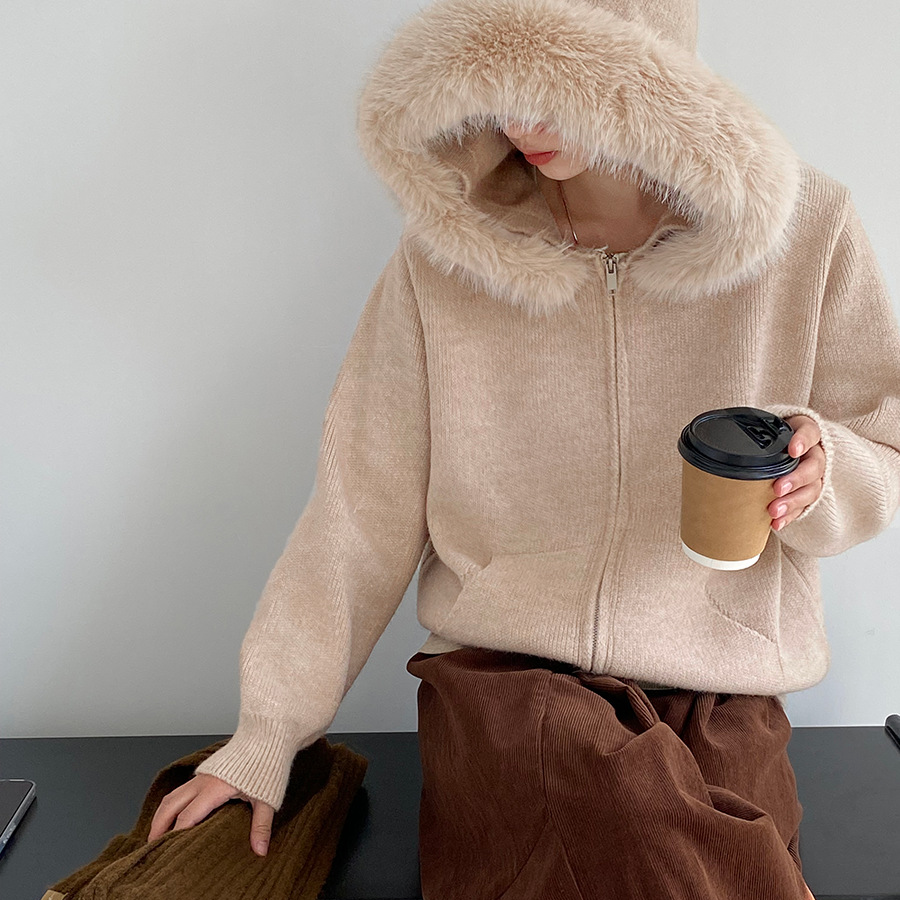 【商品名】【アウター】取り外し可能ファー付き フードジップニットアウター 冬 韓国風 カジュアル ゆったりカーディガン【JZシリーズ】