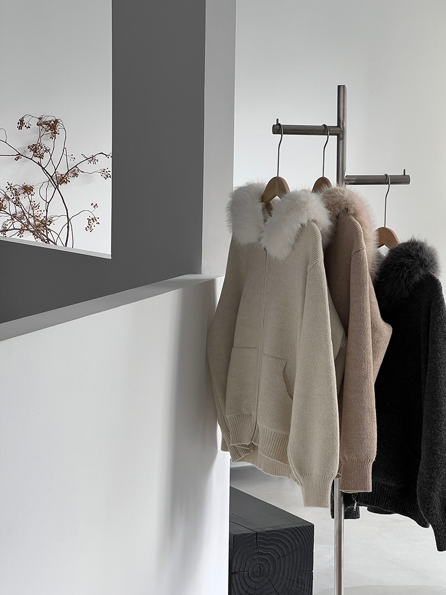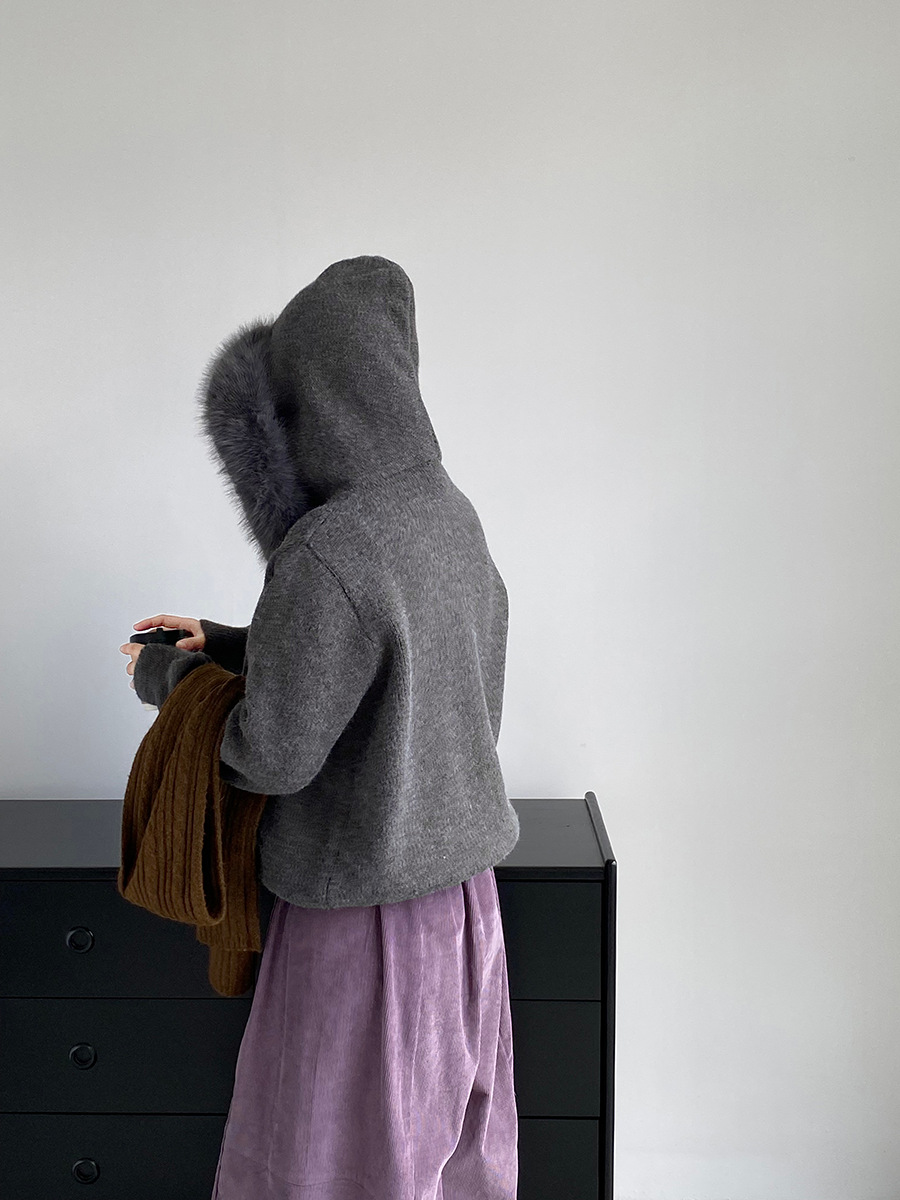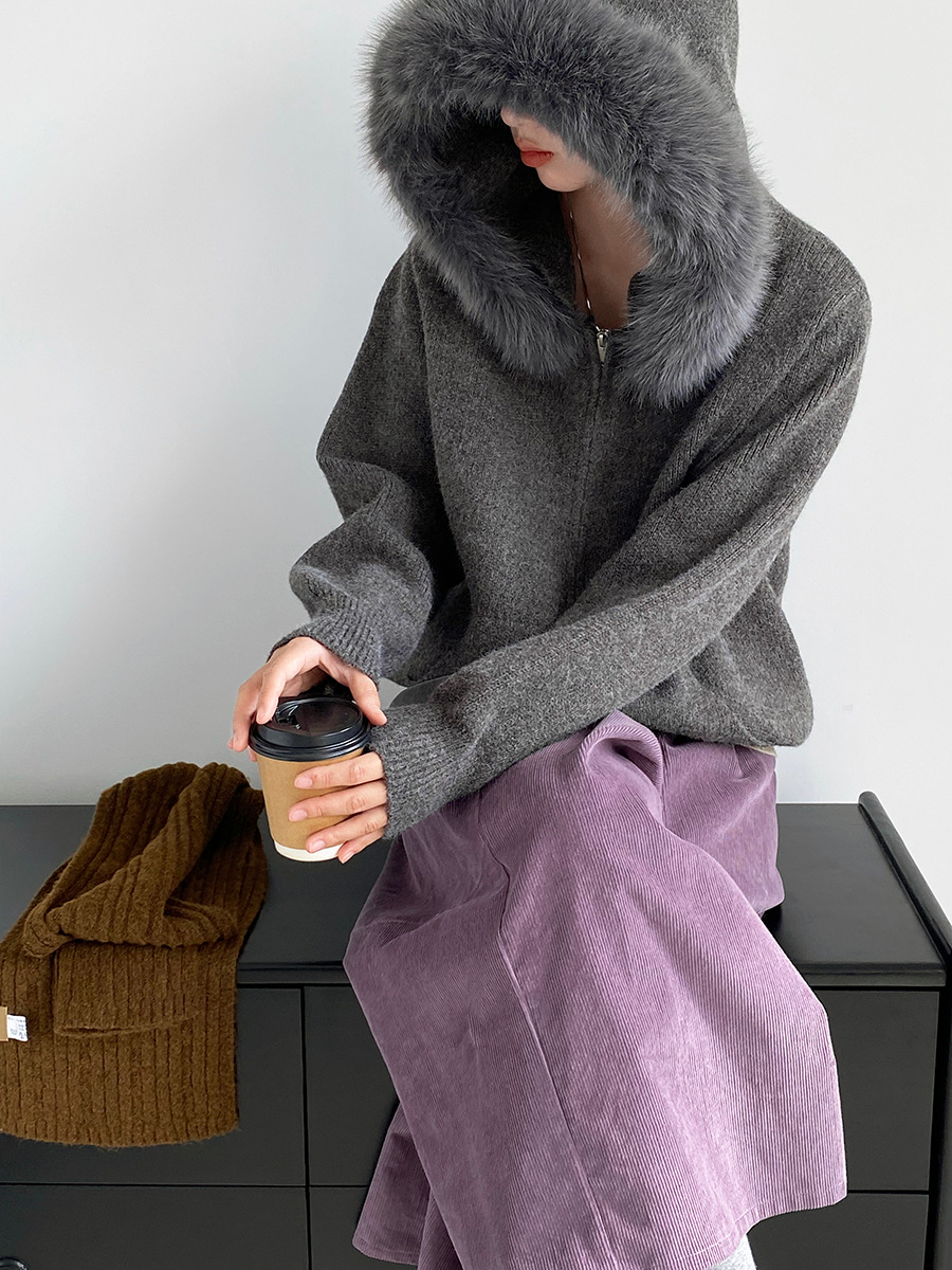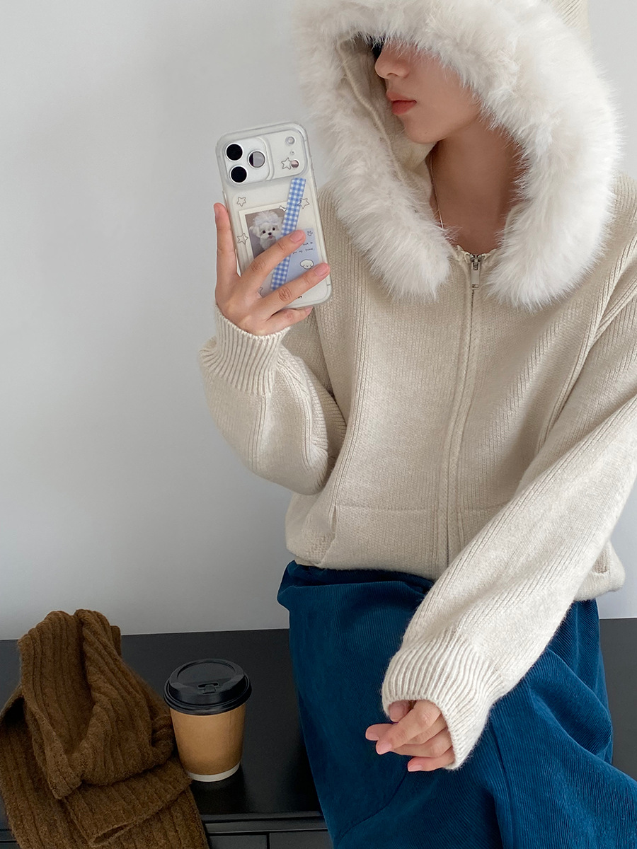 【商品名】【アウター】取り外し可能ファー付き フードジップニットアウター 冬 韓国風 カジュアル ゆったりカーディガン【JZシリーズ】