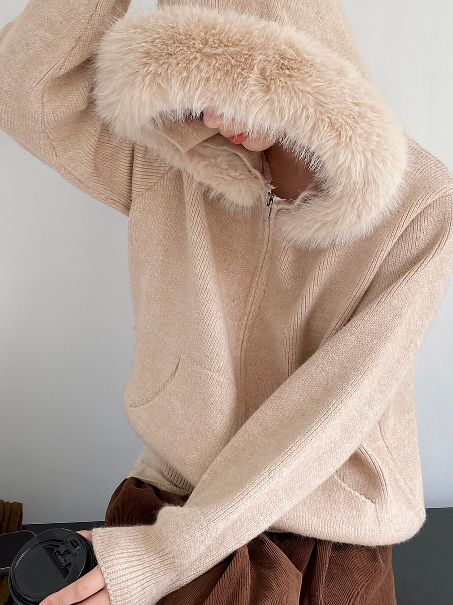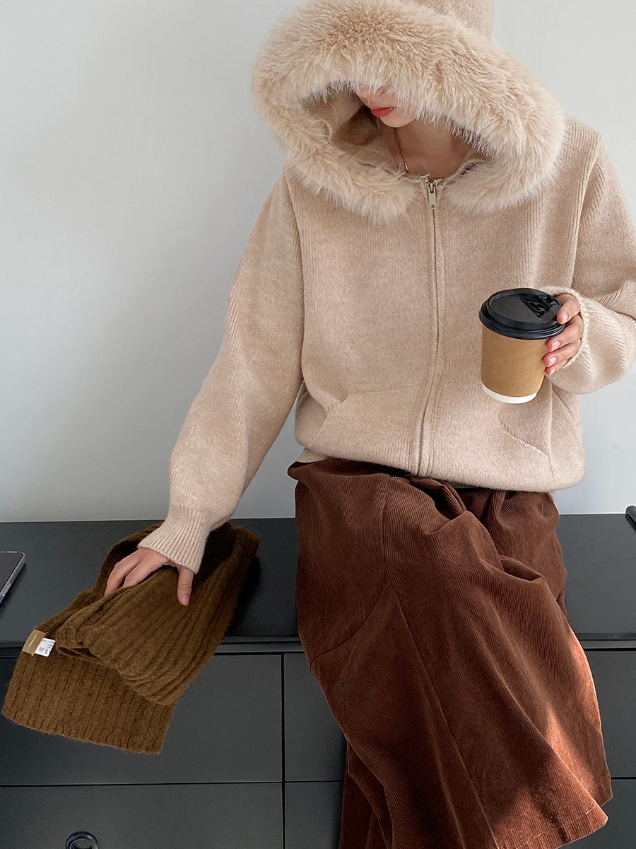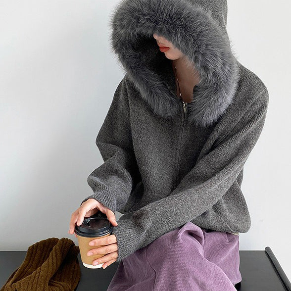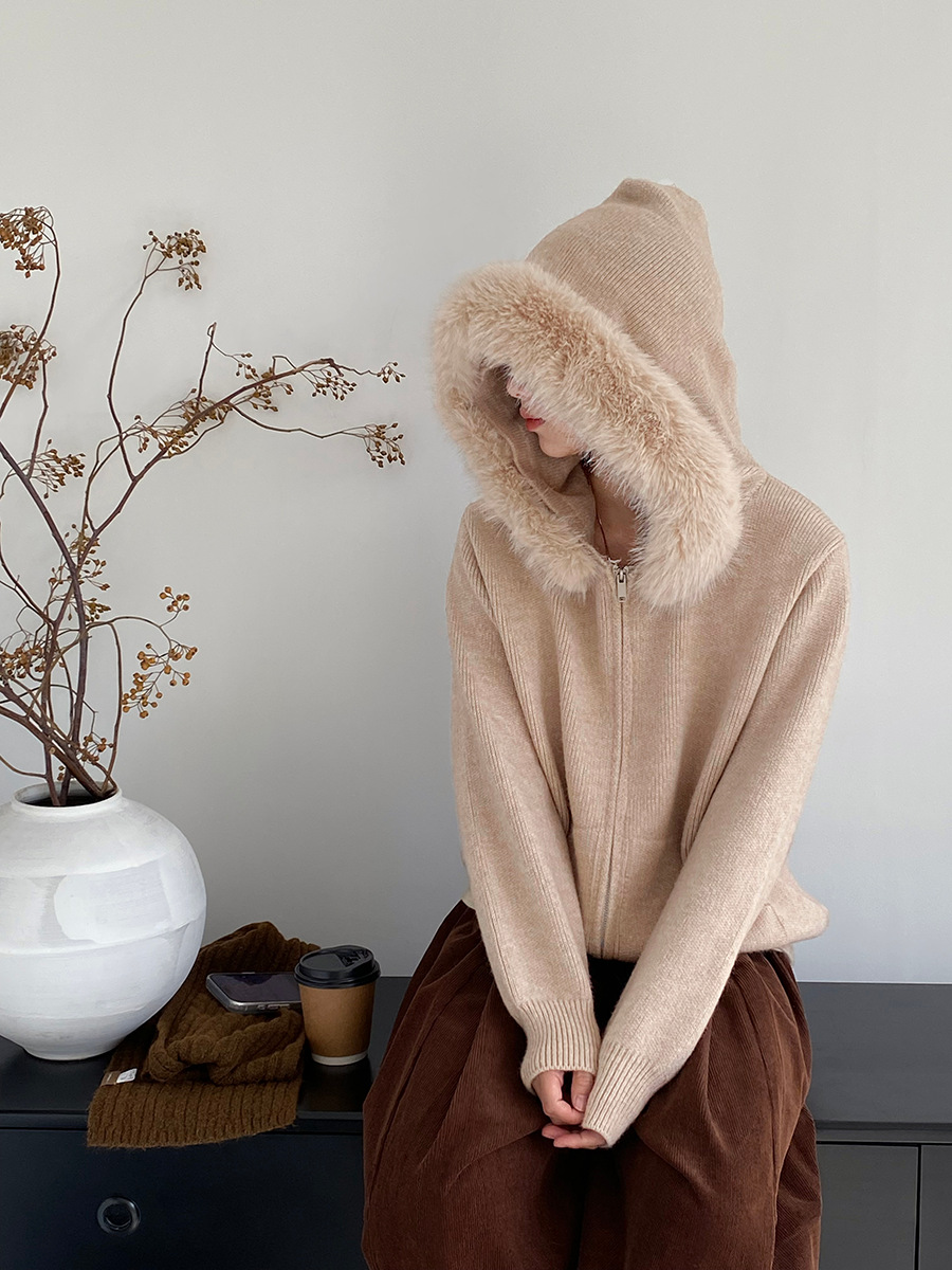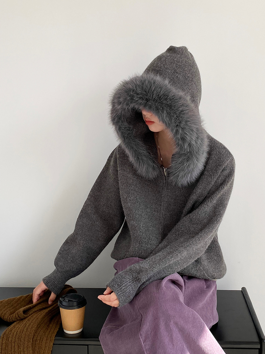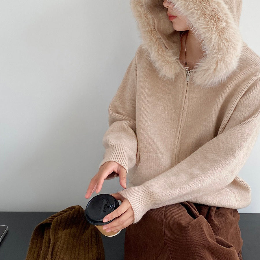 【アウター】取り外し可能ファー付き フードジップニットアウター 冬 韓国風 カジュアル ゆったりカーディガン【JZシリーズ】