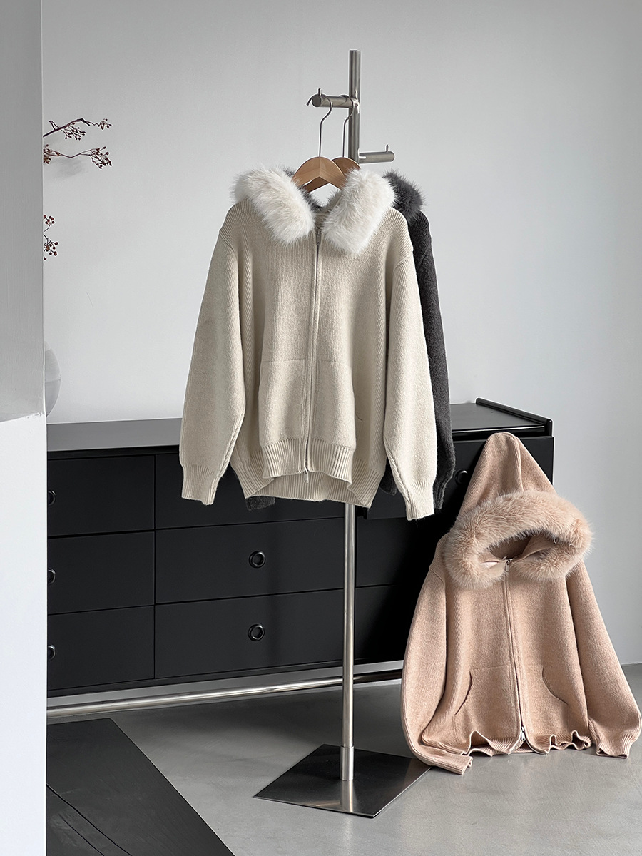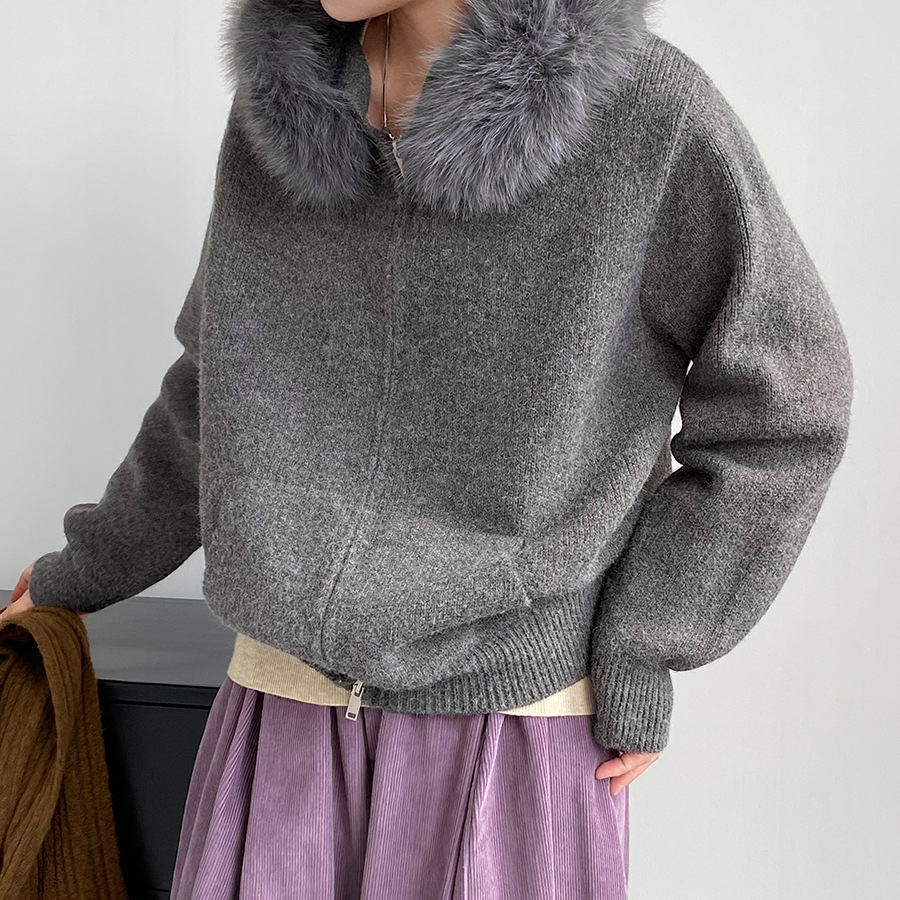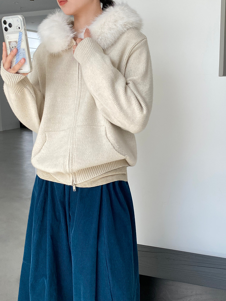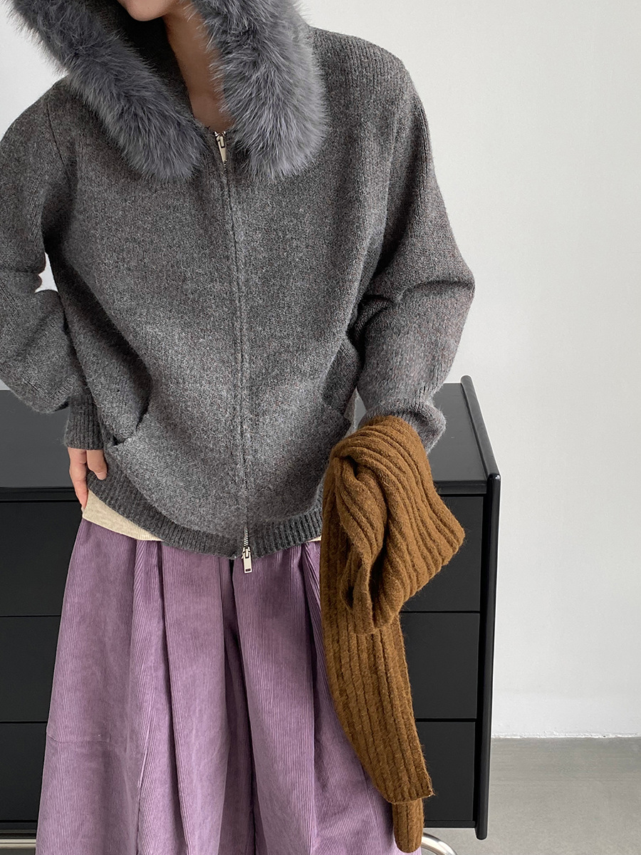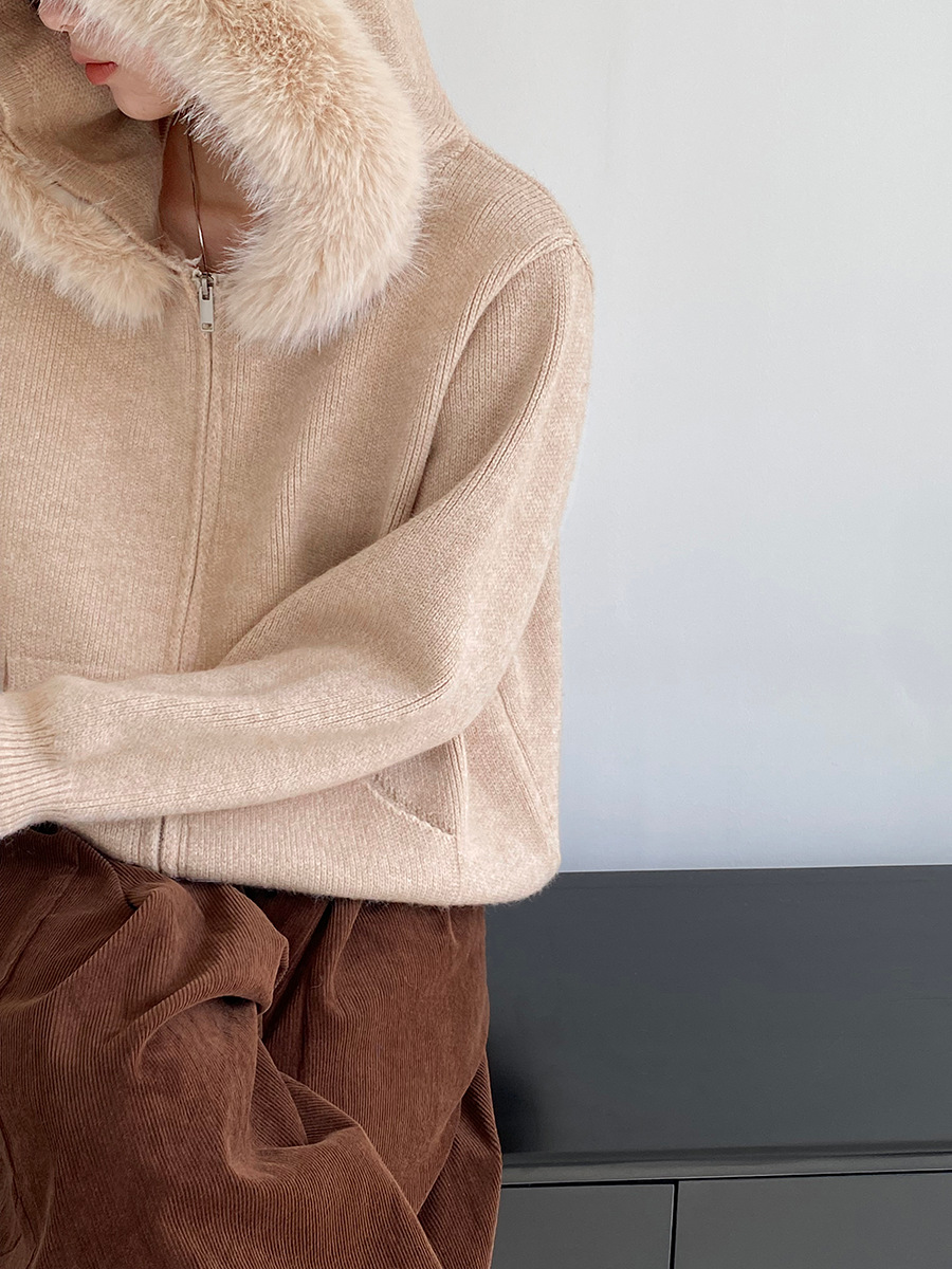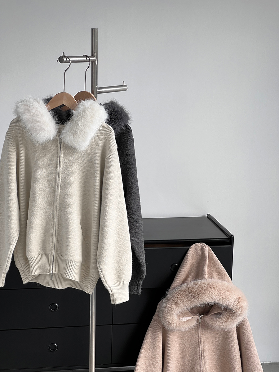 【アウター】取り外し可能ファー付き フードジップニットアウター 冬 韓国風 カジュアル ゆったりカーディガン【JZシリーズ】