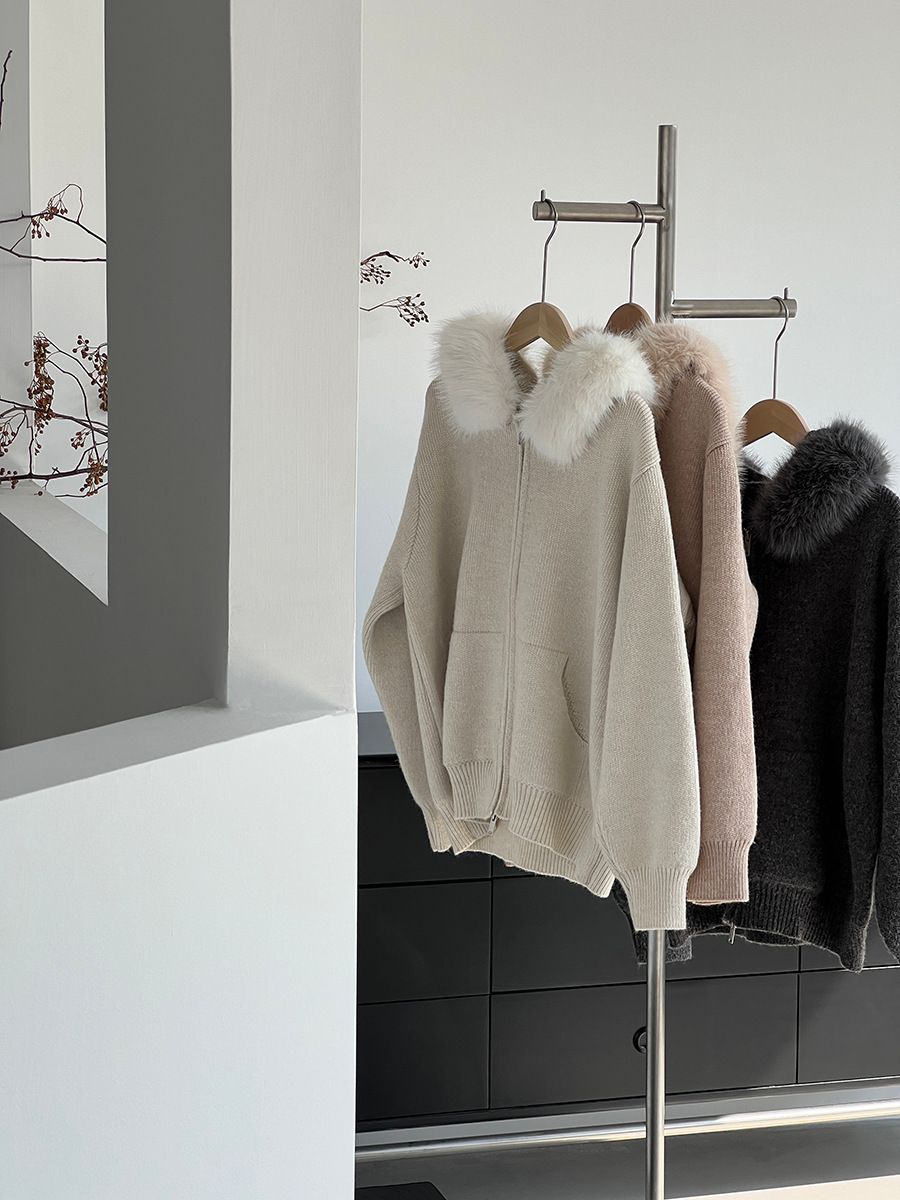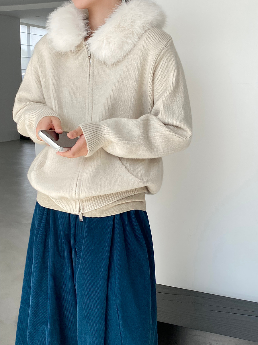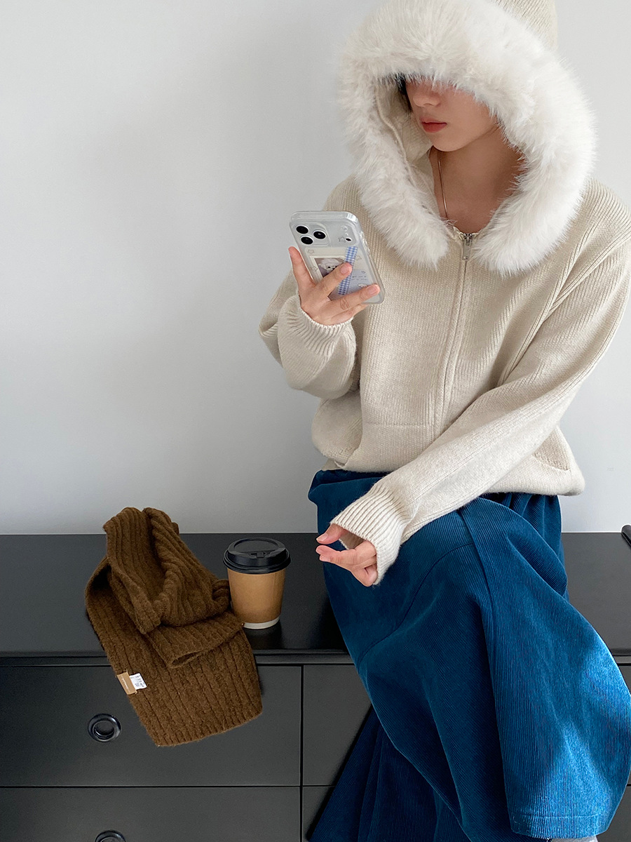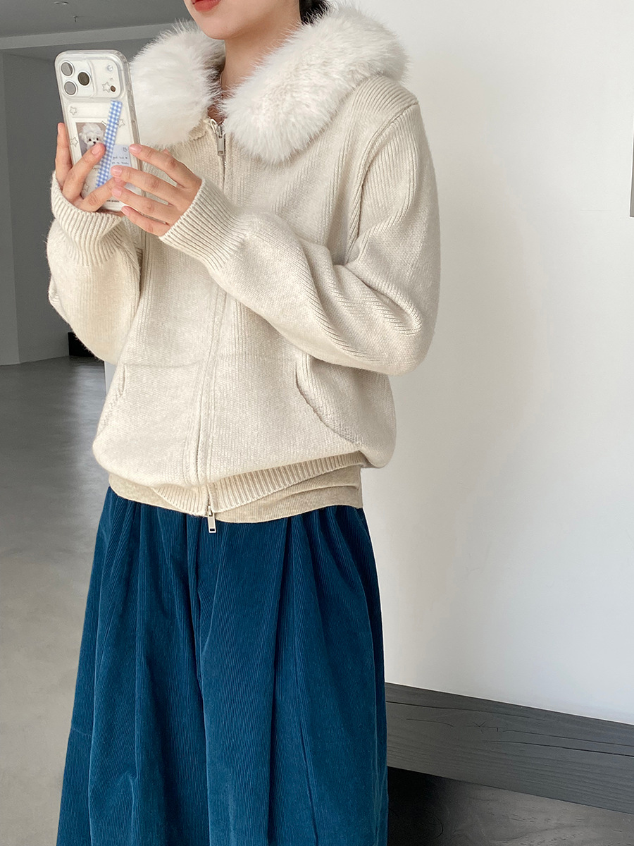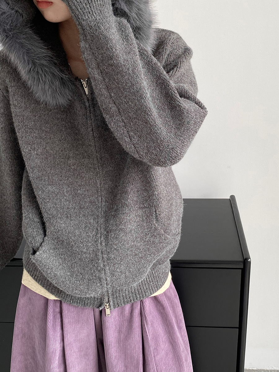 【アウター】取り外し可能ファー付き フードジップニットアウター 冬 韓国風 カジュアル ゆったりカーディガン【JZシリーズ】