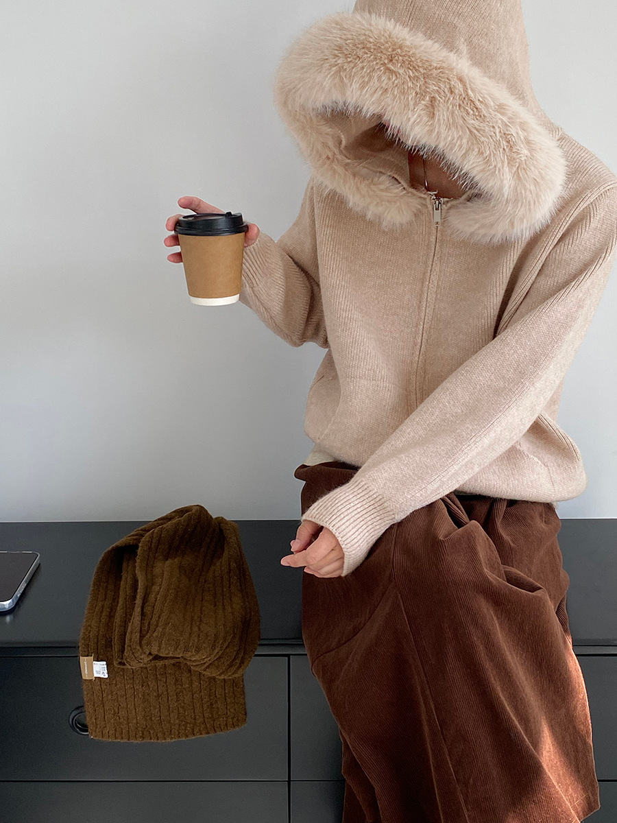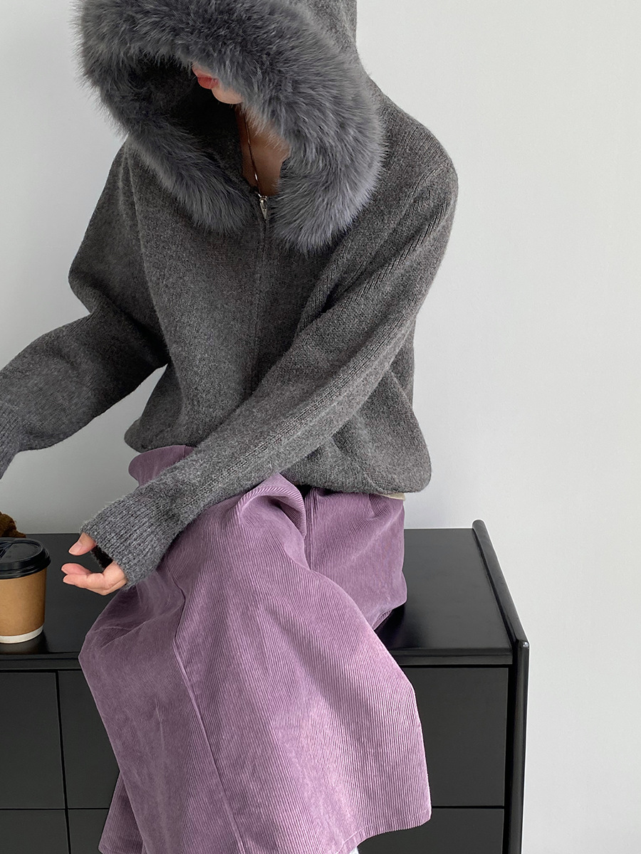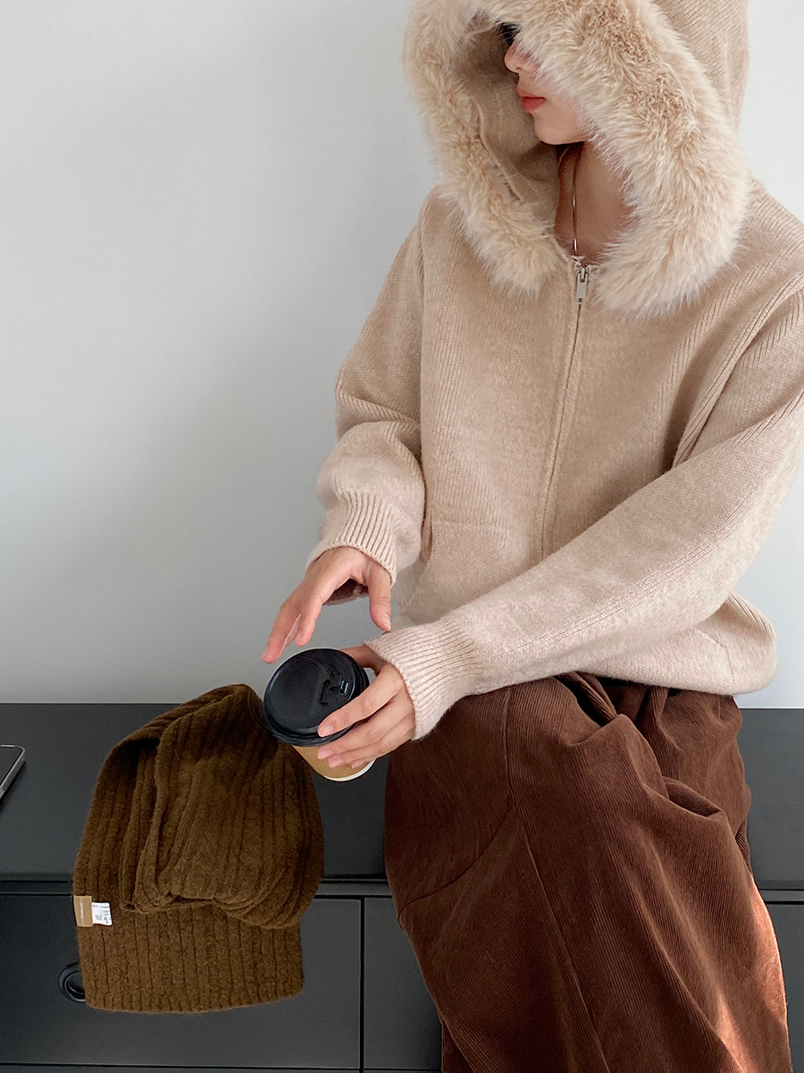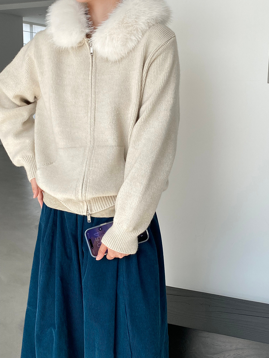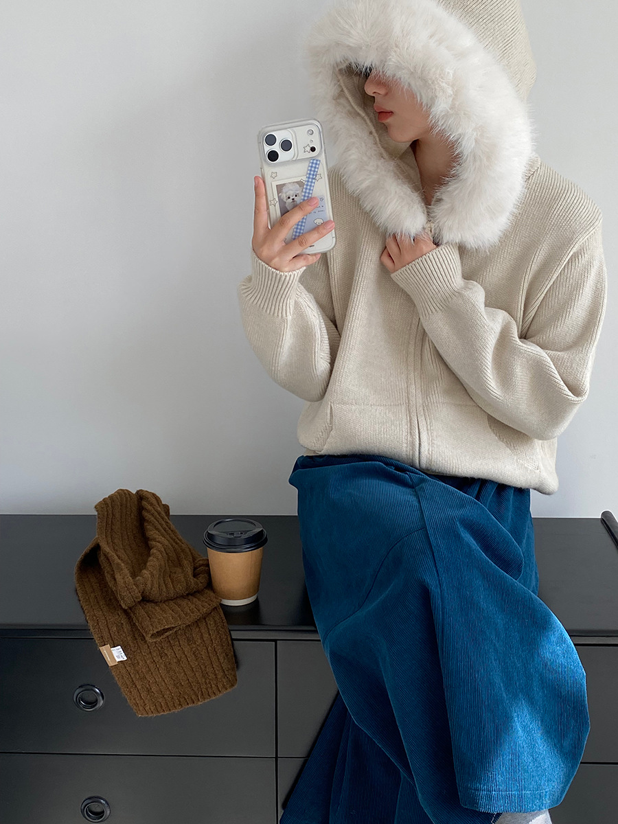 【アウター】取り外し可能ファー付き フードジップニットアウター 冬 韓国風 カジュアル ゆったりカーディガン【JZシリーズ】