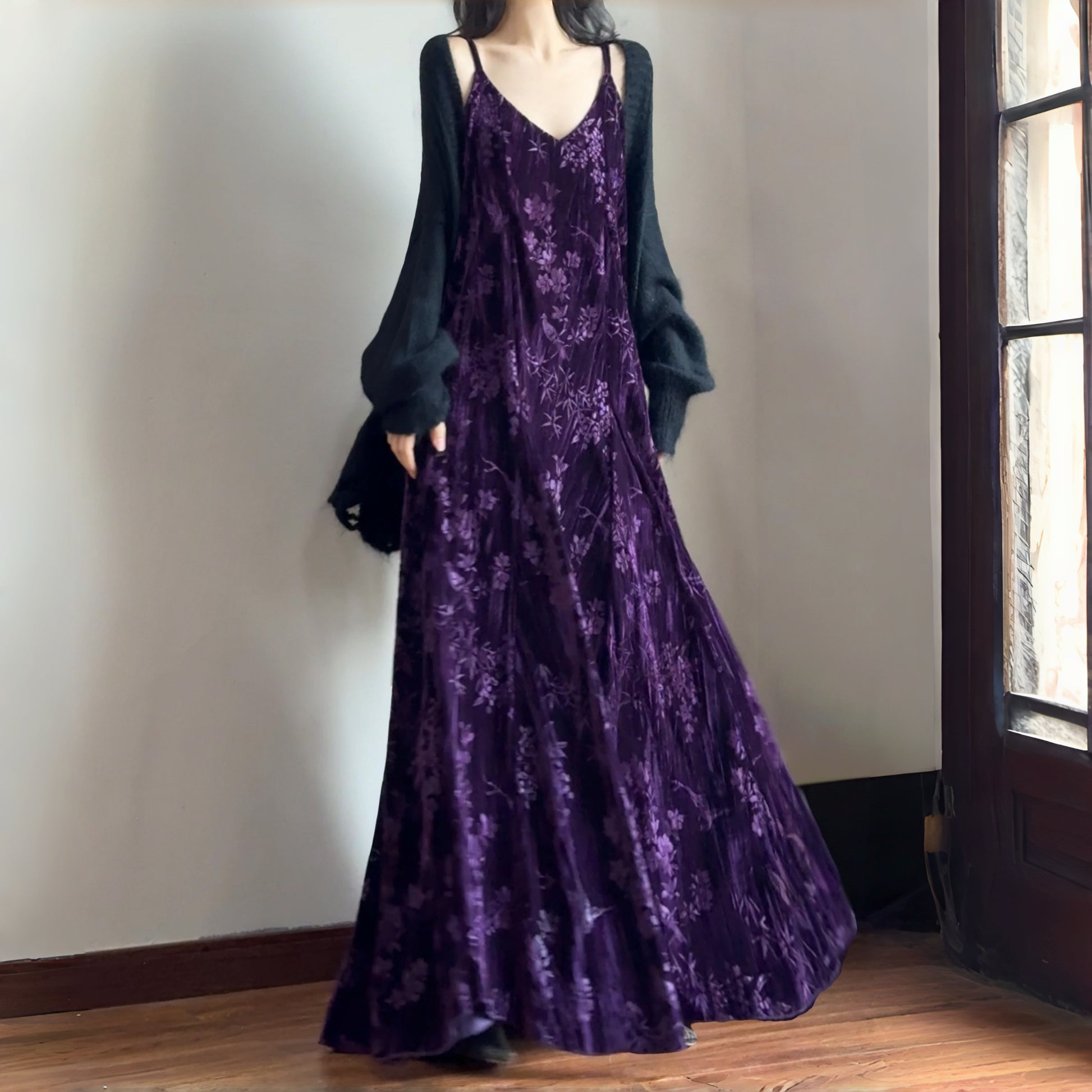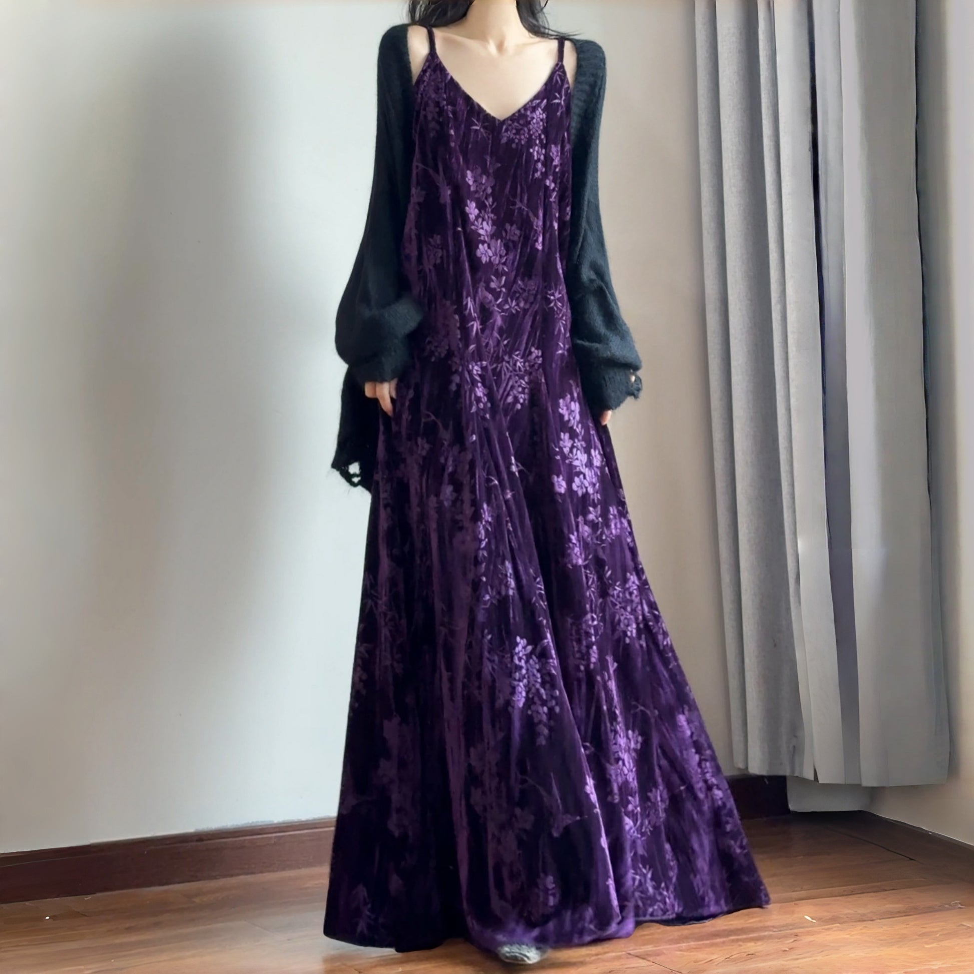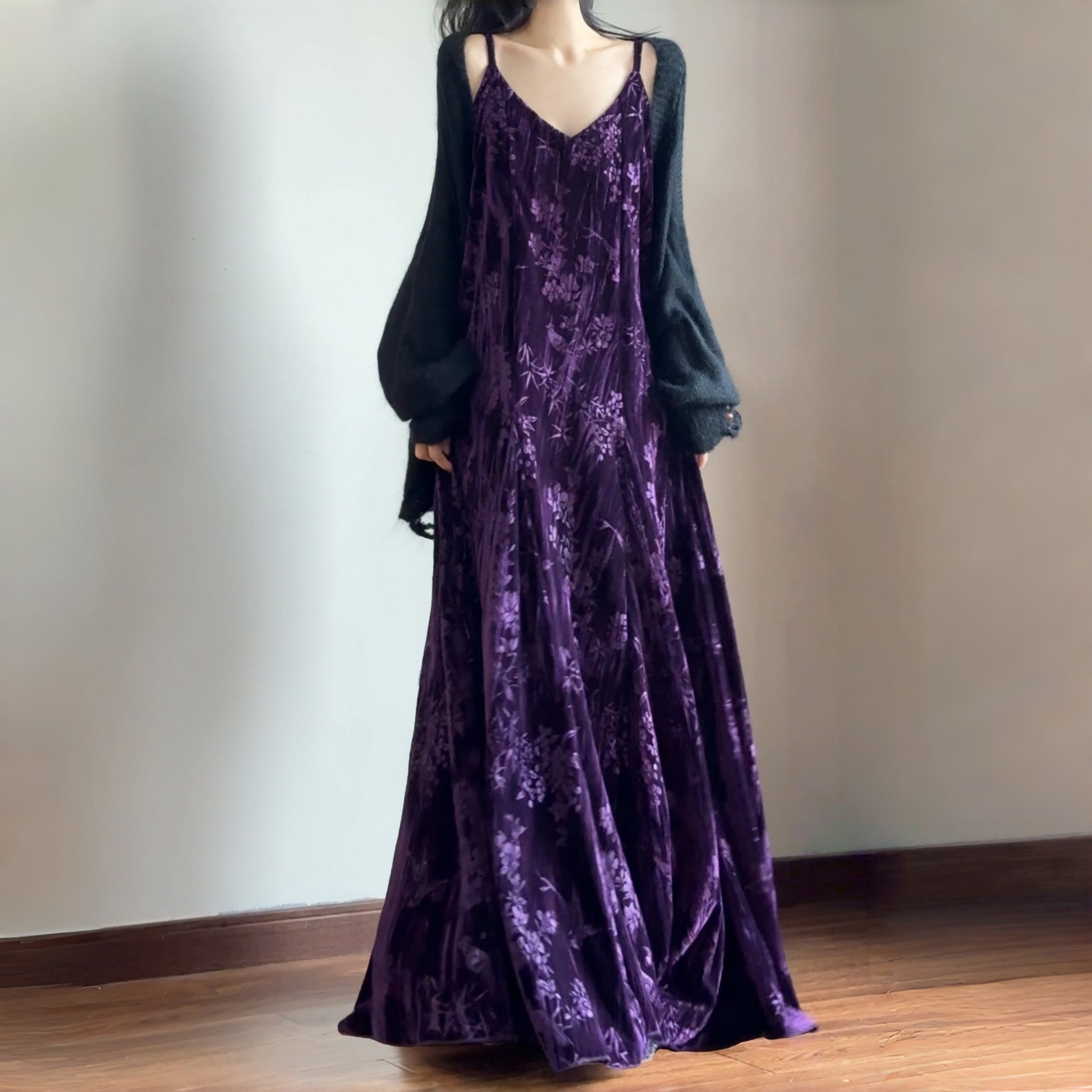 【ワンピース】細見え 日系 Vネック 無地 長袖ワンピース 切替デザイン ゆったり 気質ロング【JZシリーズ】【AHシリーズ】