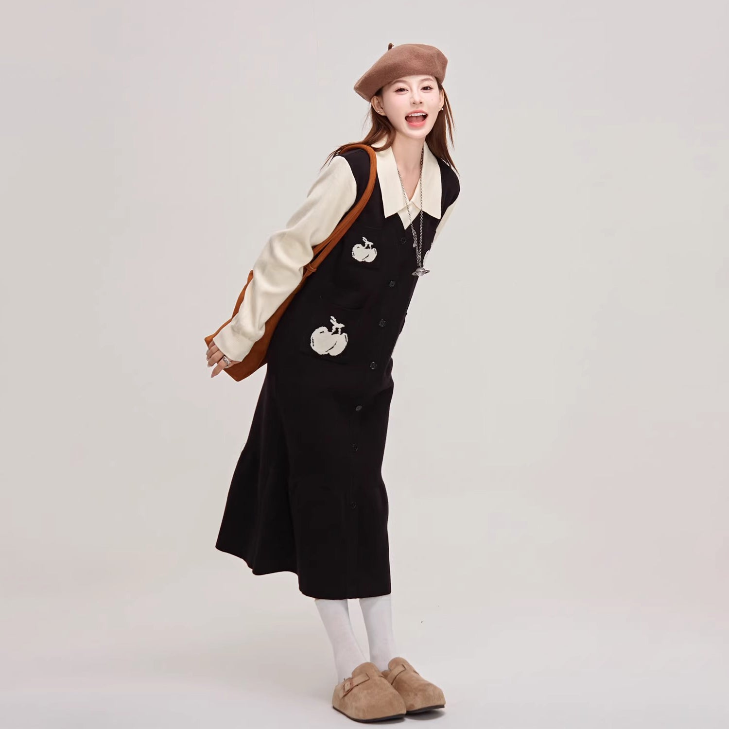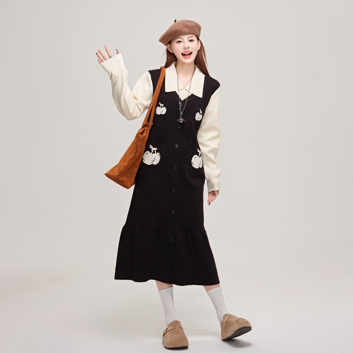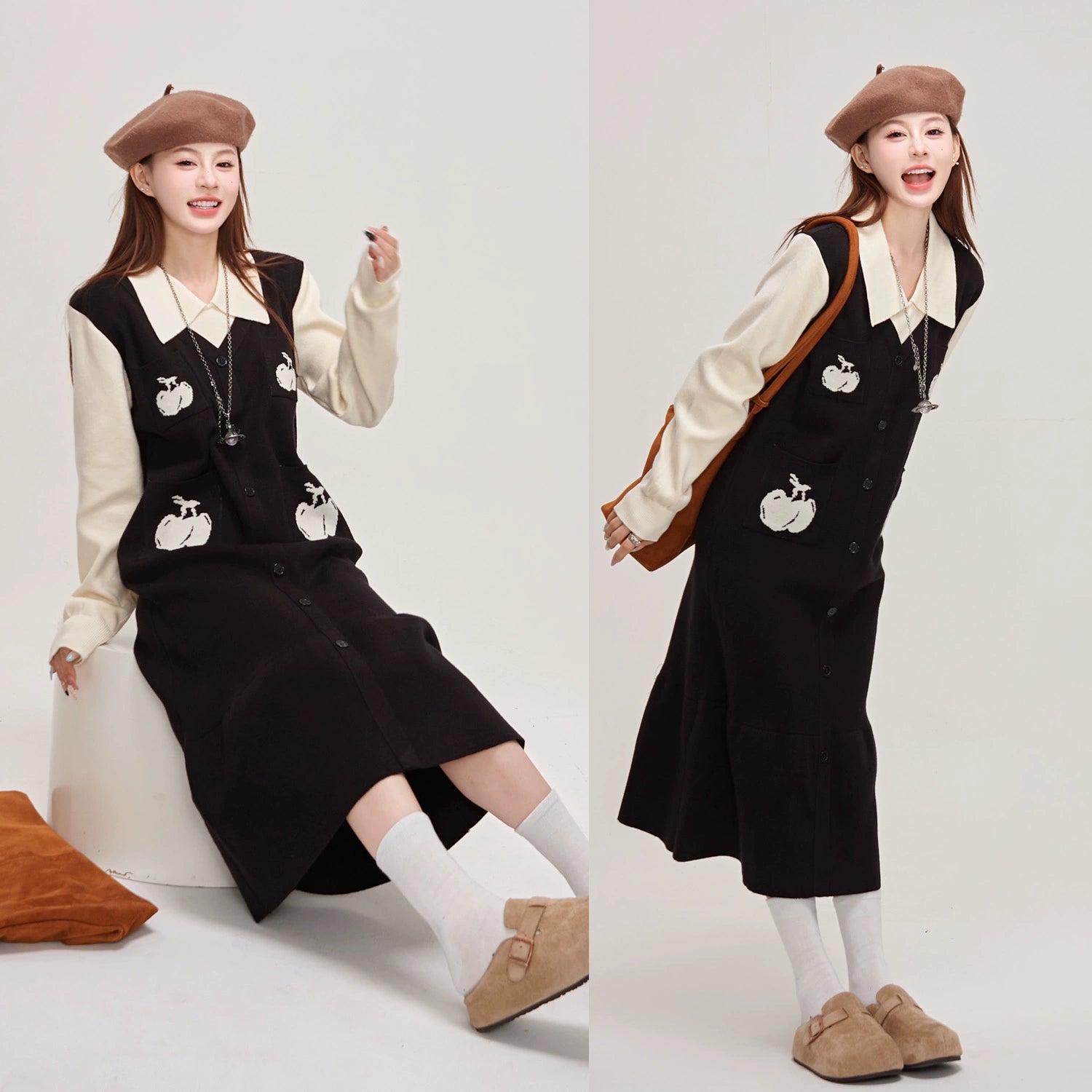 【ワンピース】🍒チェリーデザイン♡ツーピース風ニット長袖ワンピース 冬 レディース 高級感【JZシリーズ】