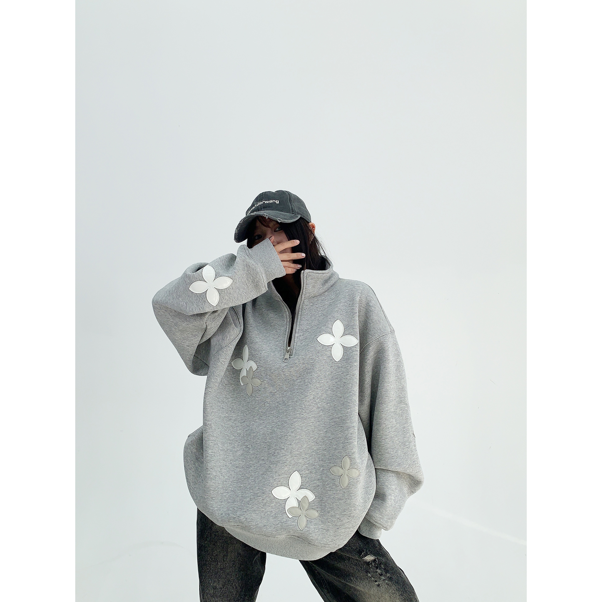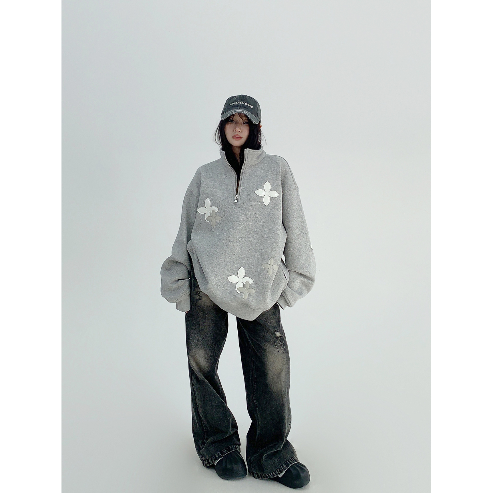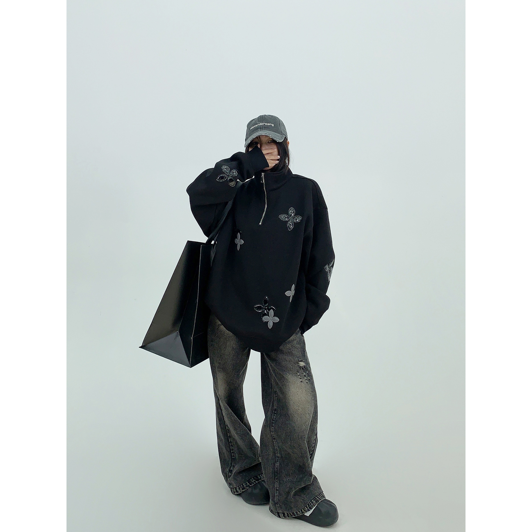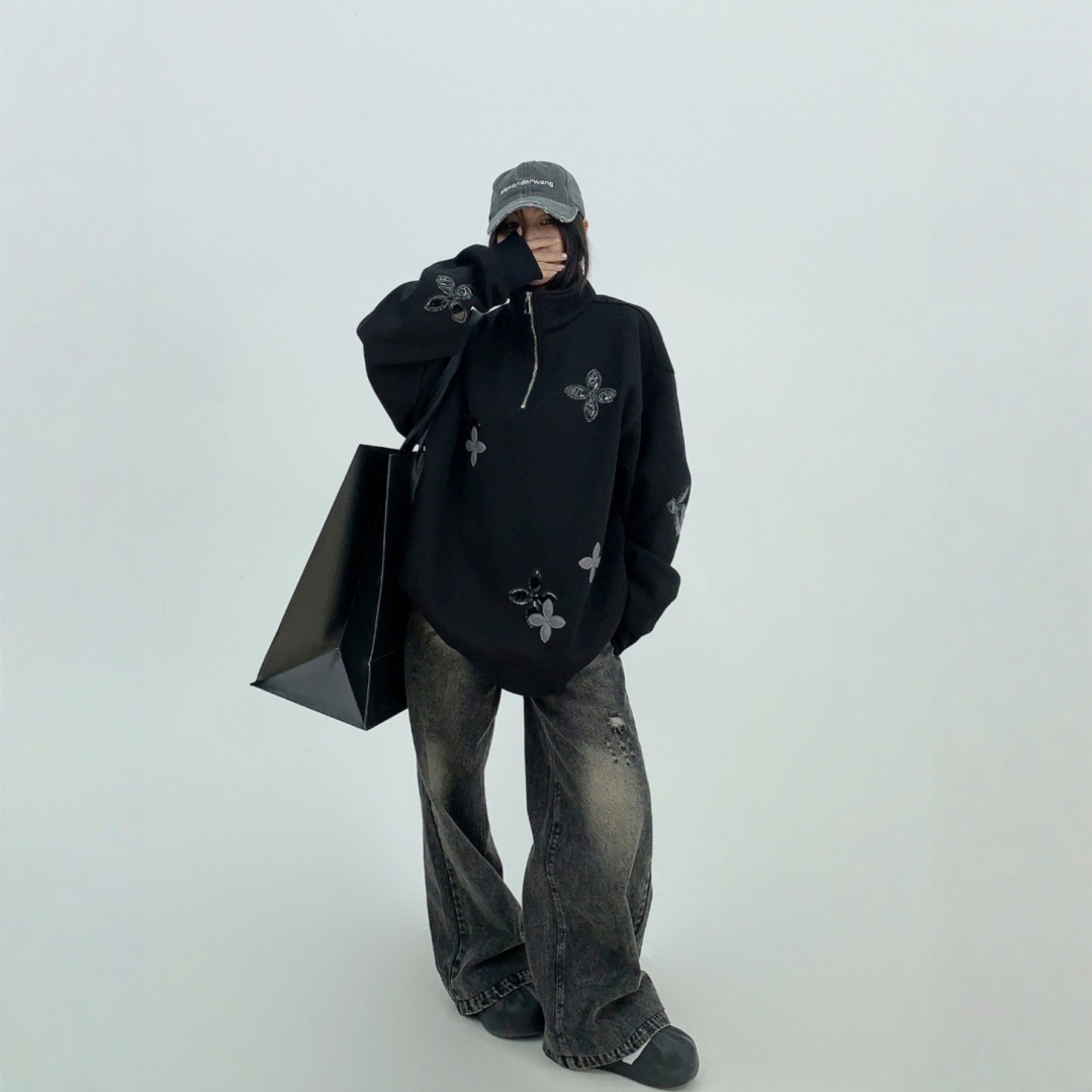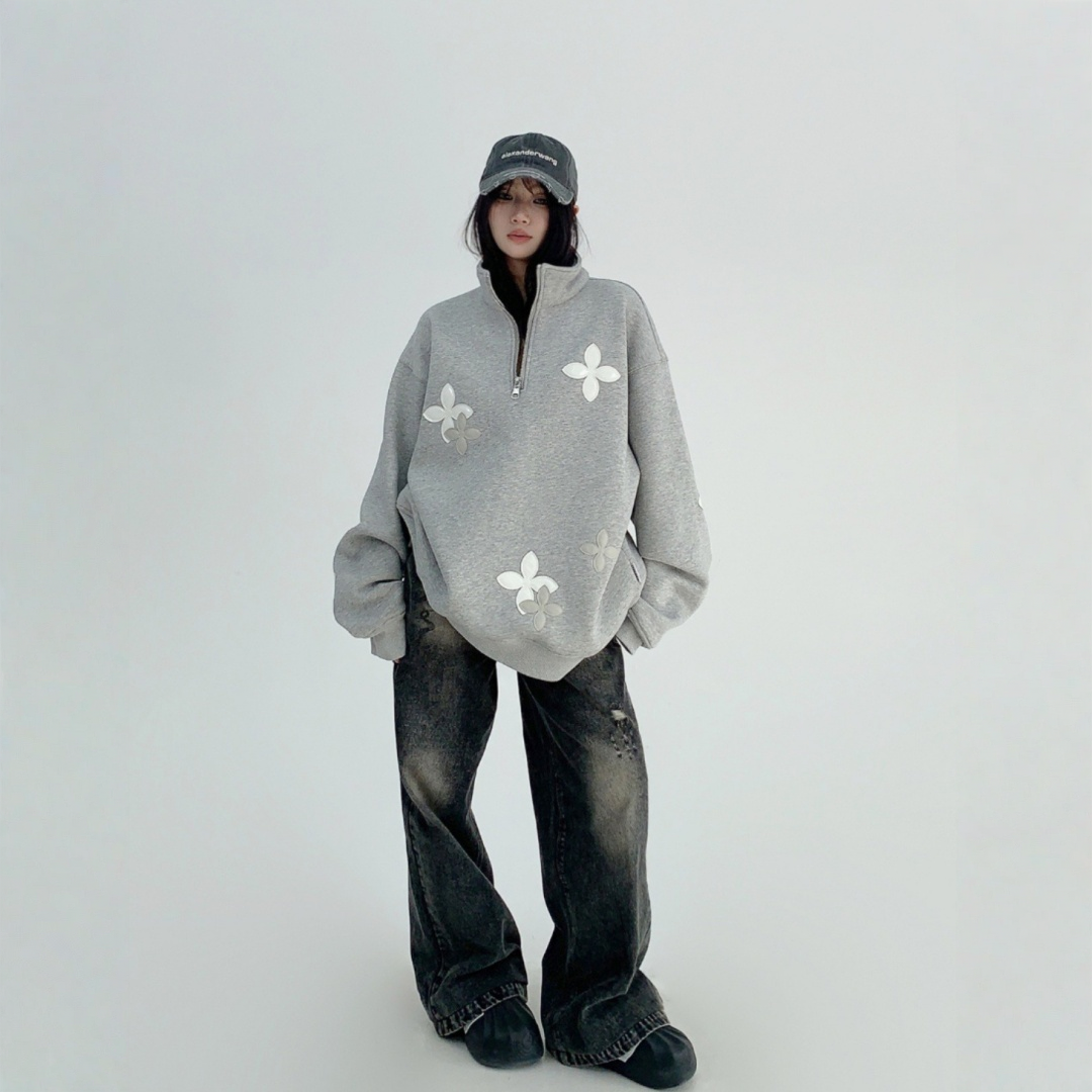 【トップス】リラックス感 ゆったりシルエット ダメージ加工 刺繍 春 秋 冬 フード付き パーカー 【FCシリーズ】