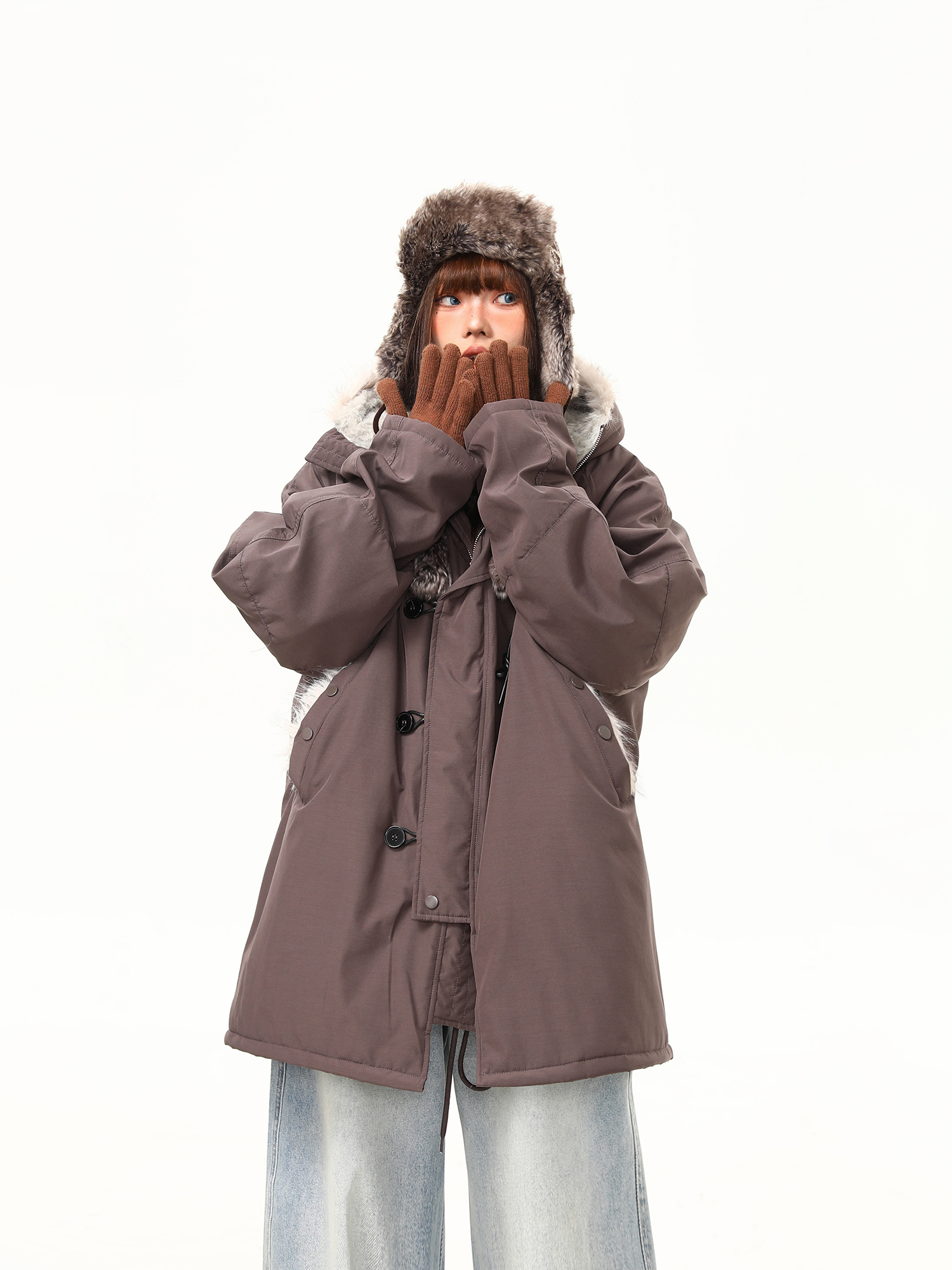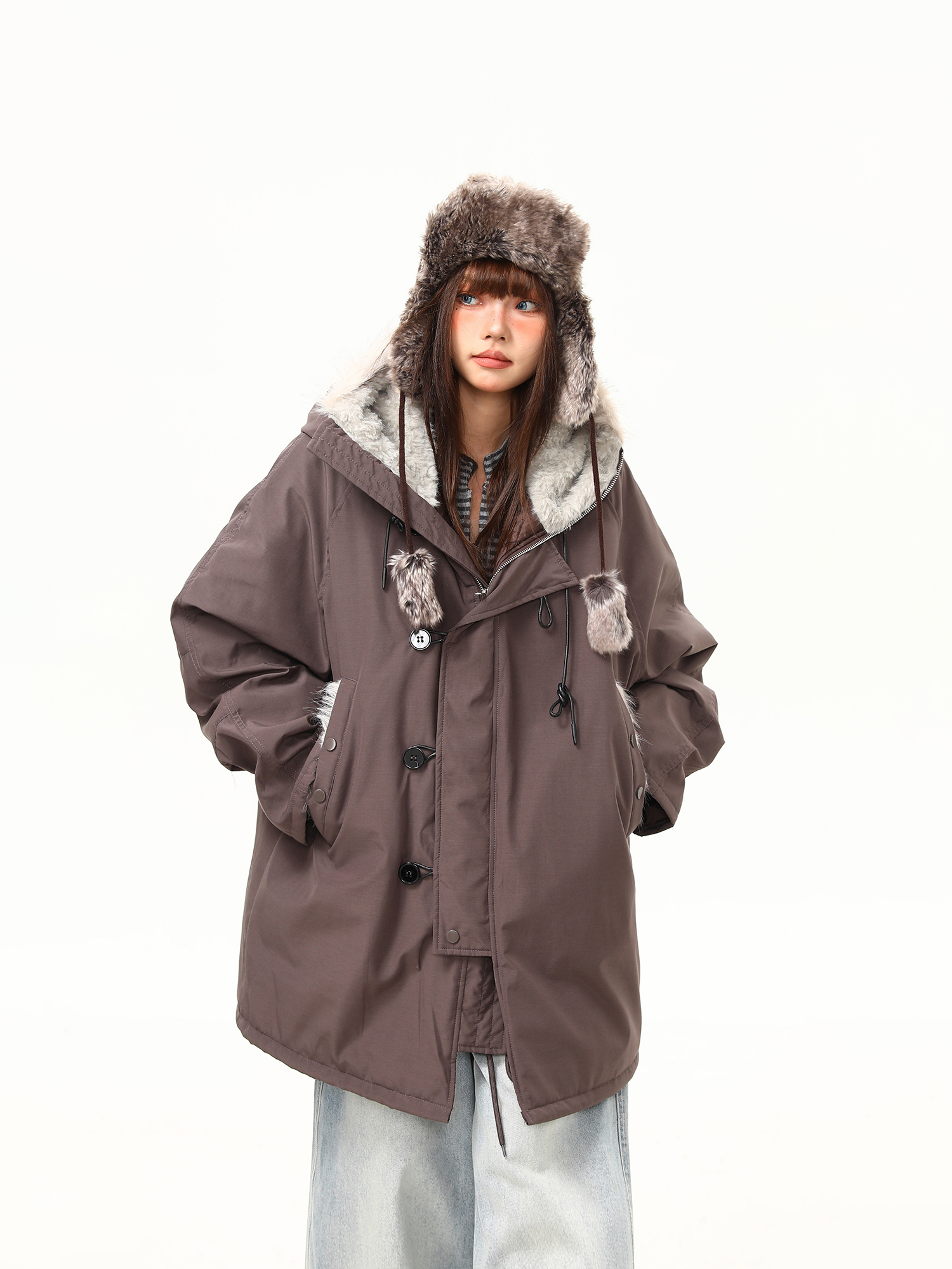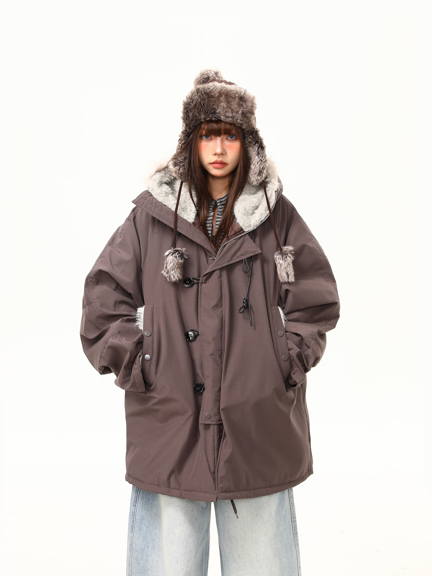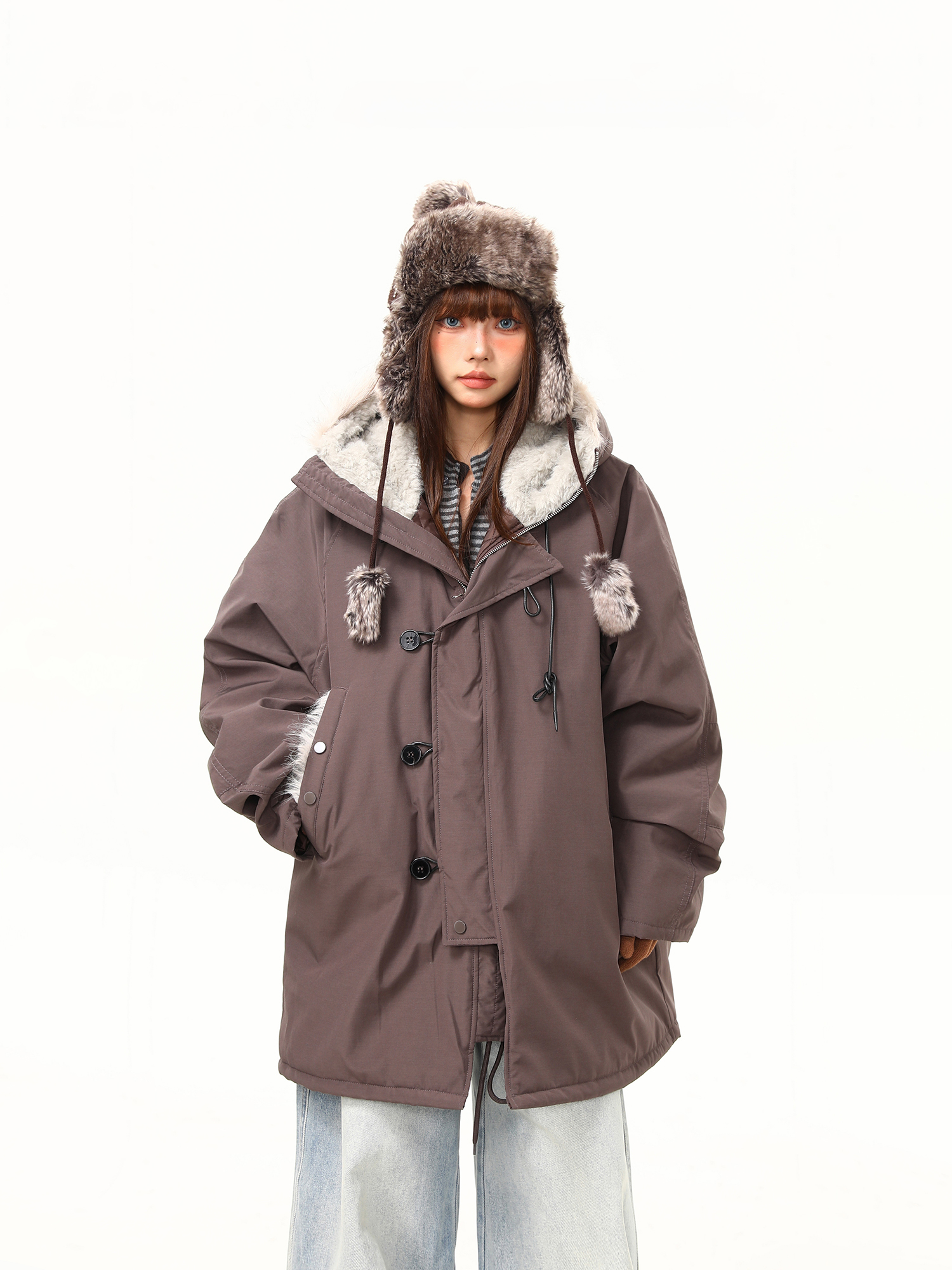 【アウター】春 秋 冬 ビッグファー襟 ダッフルボタン中綿コート 【JZシリーズ】