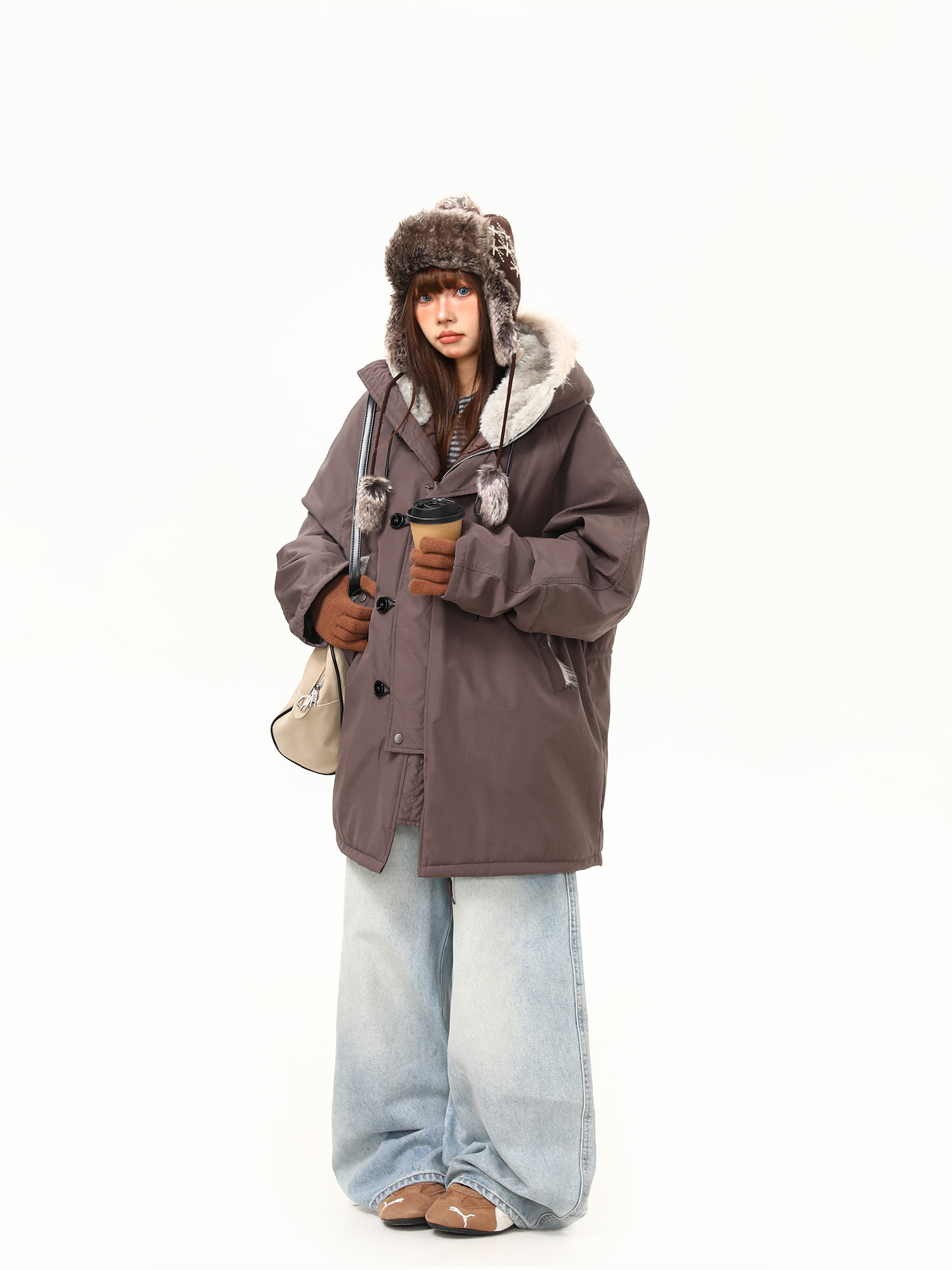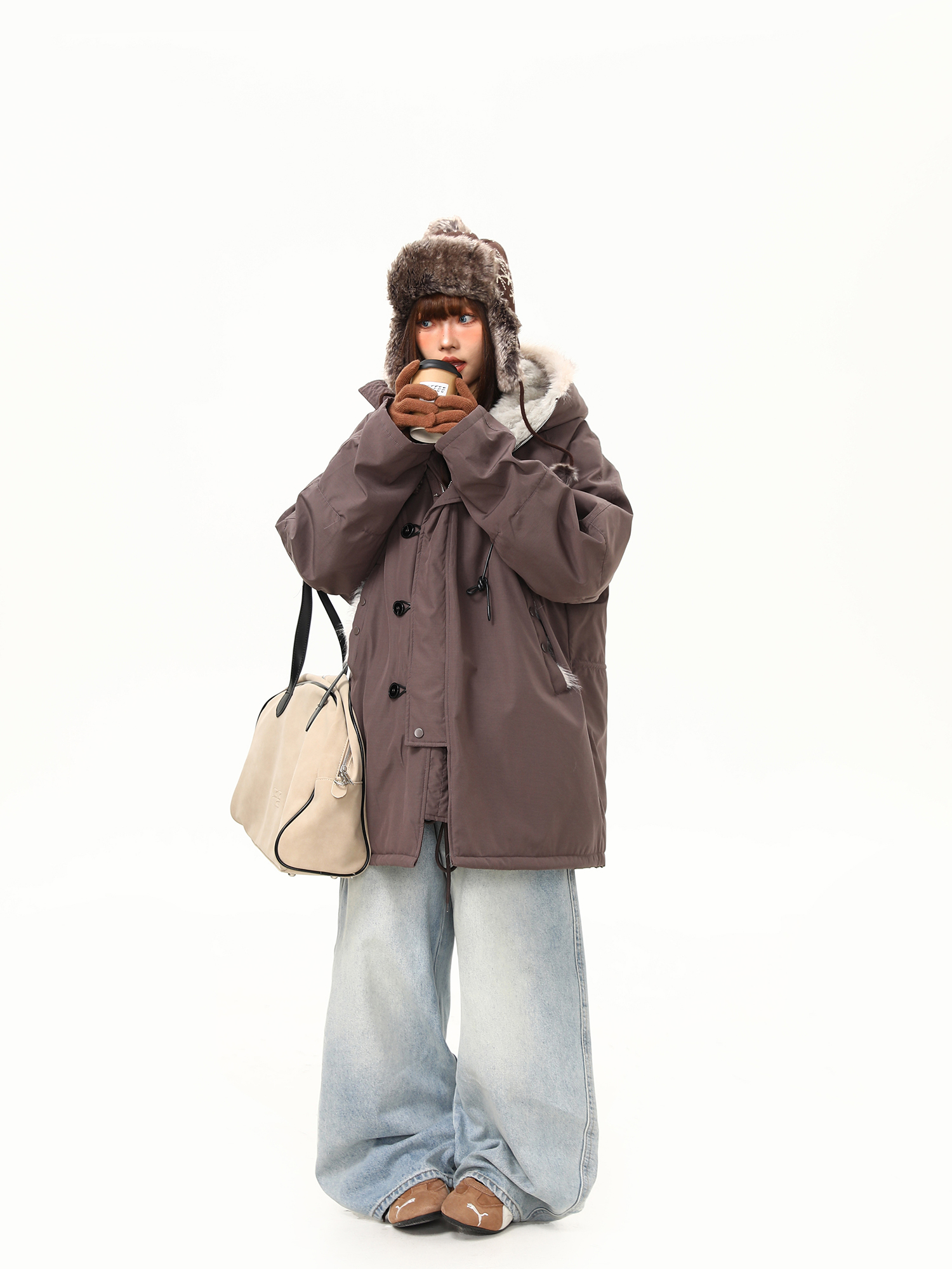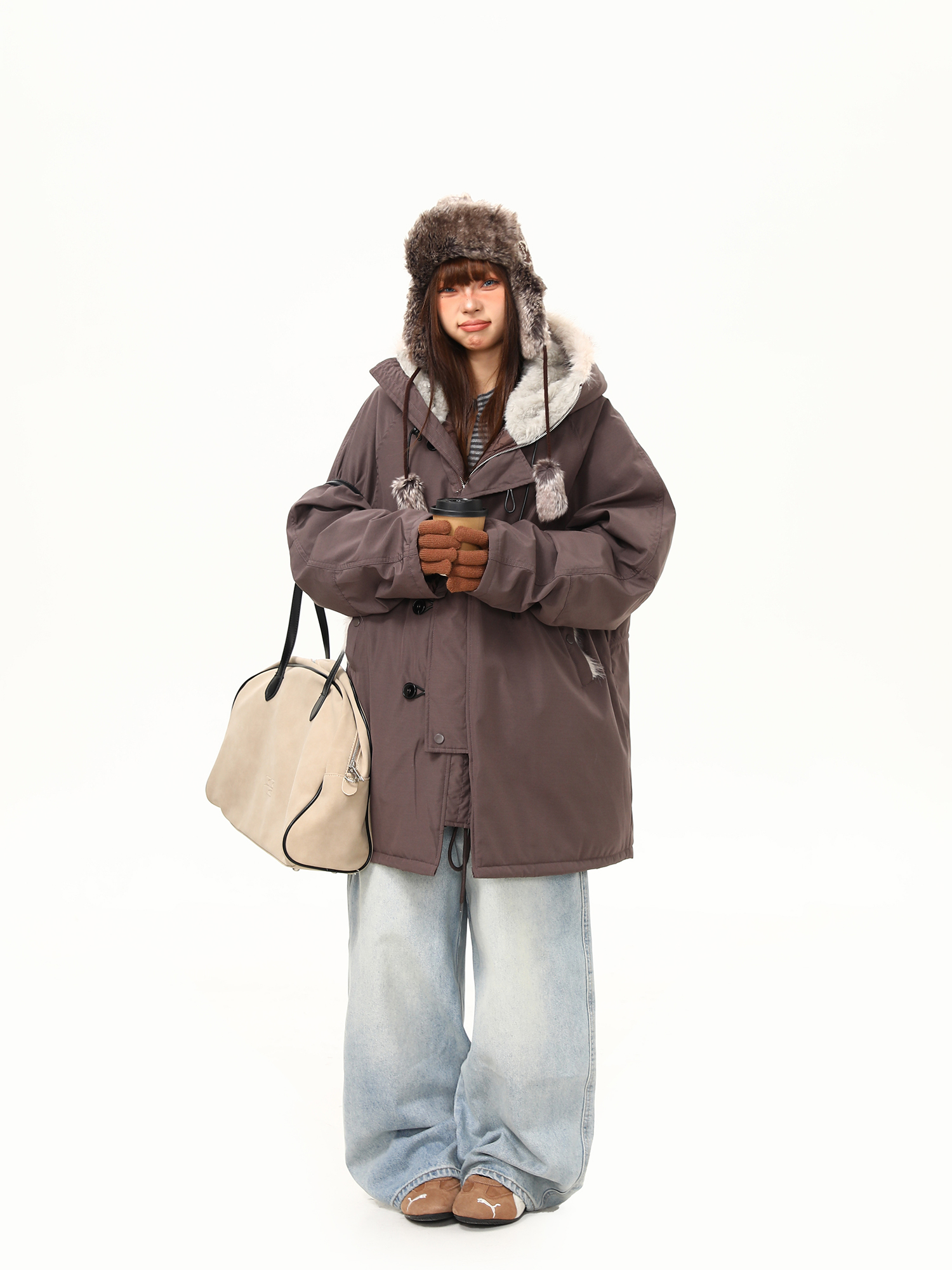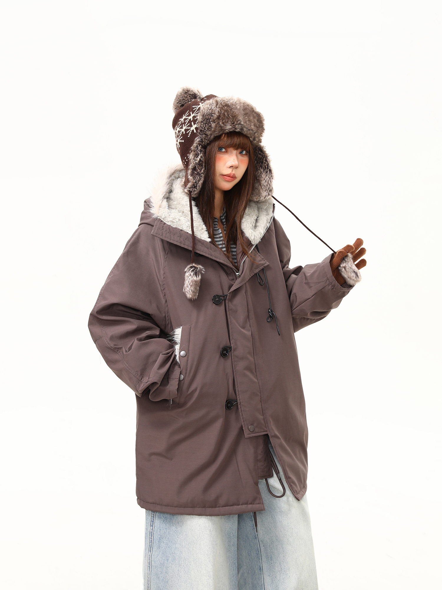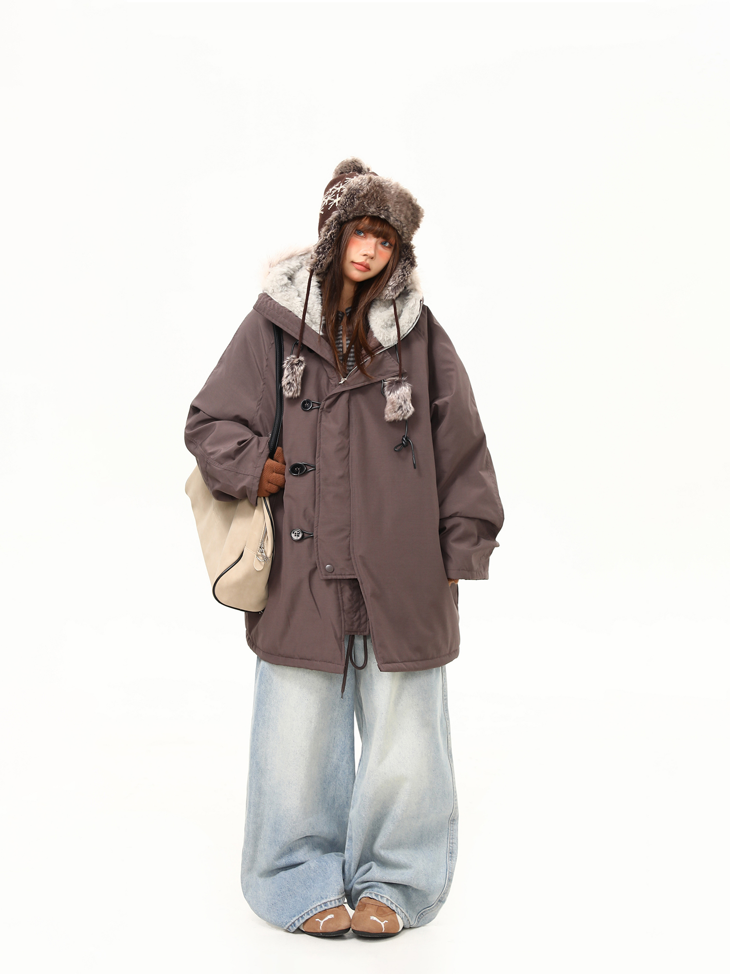 【アウター】春 秋 冬 ビッグファー襟 ダッフルボタン中綿コート 【JZシリーズ】