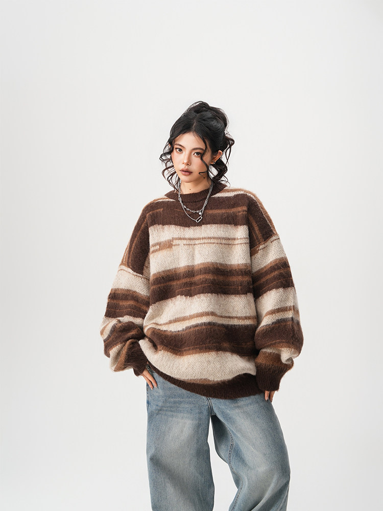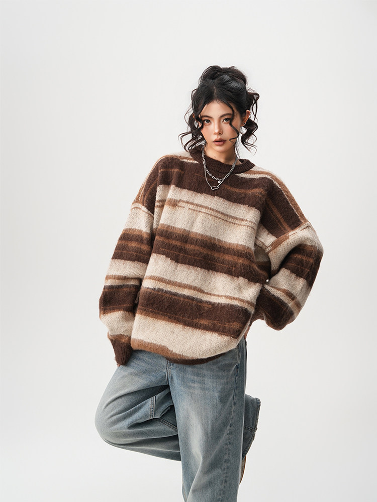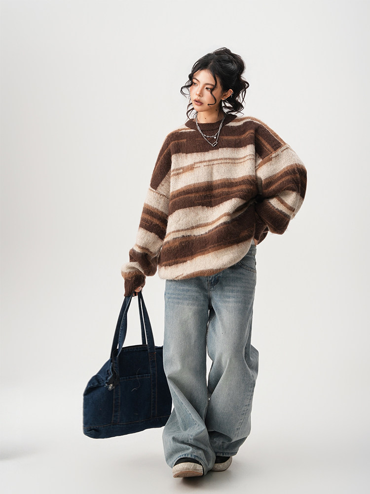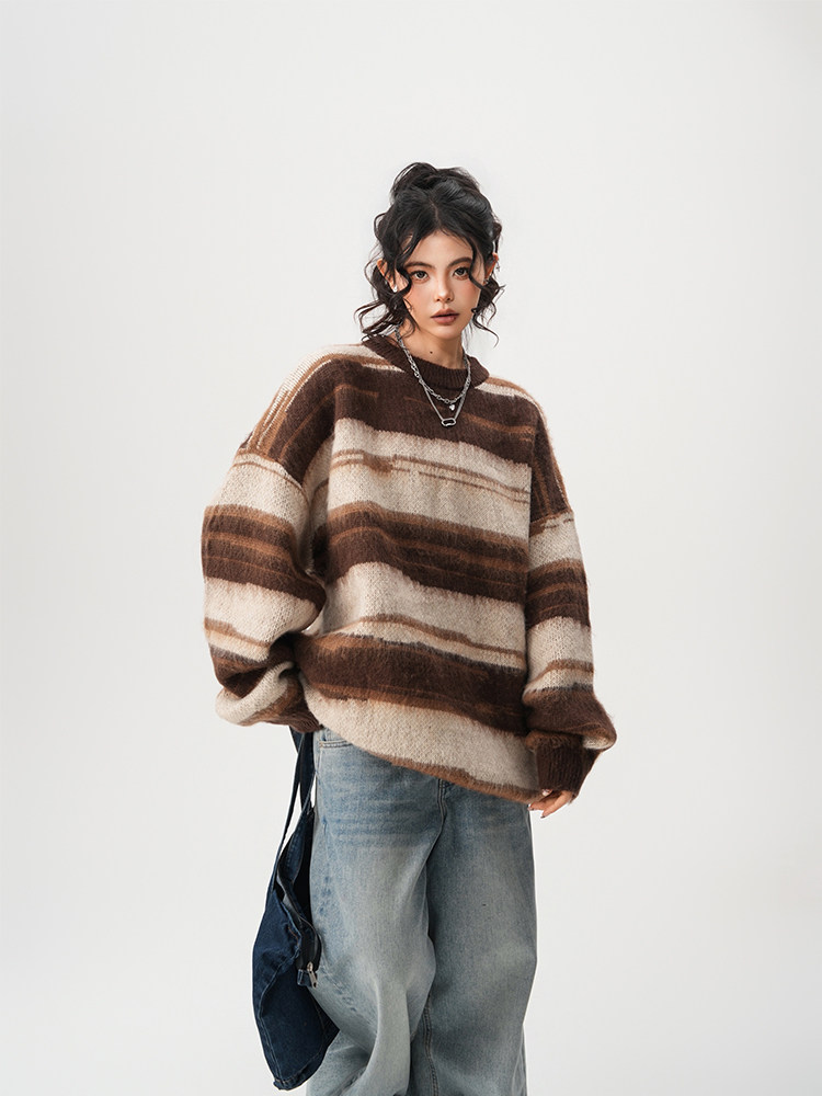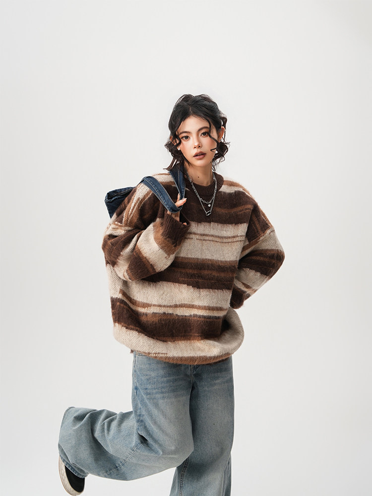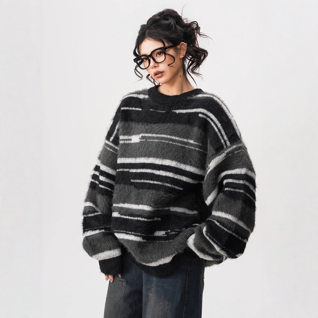 【60%OFF⭐️先行スタート!】【トップス】春 秋 冬 ストライプ柄 配色 ルーズ ニット ラウンドネック セーター 【FCシリーズ】