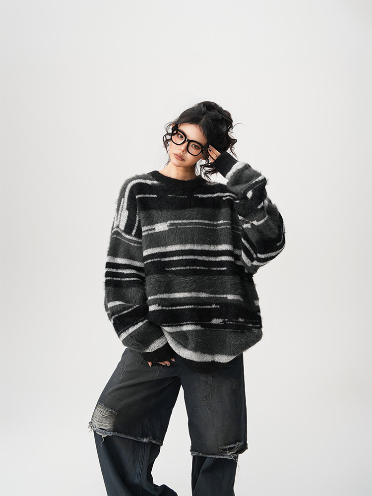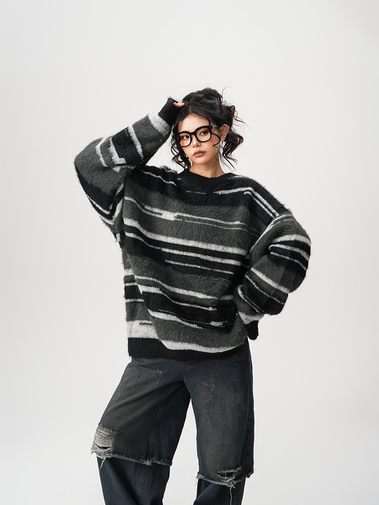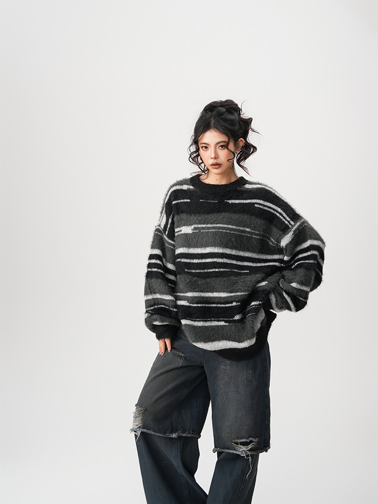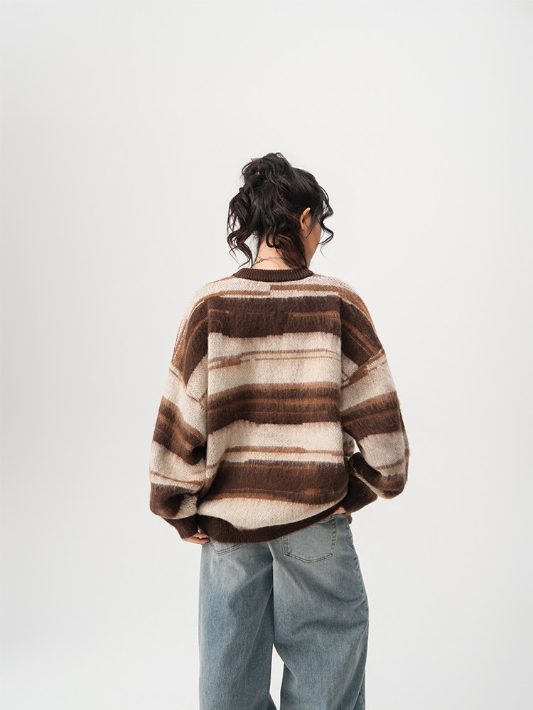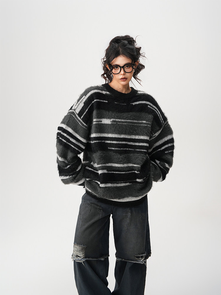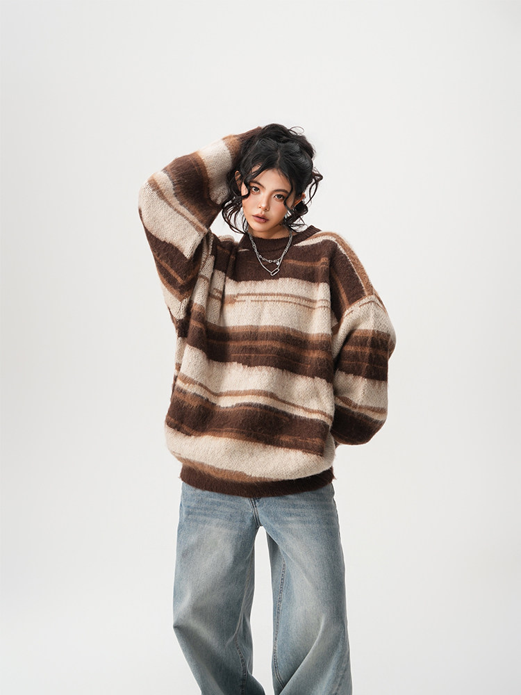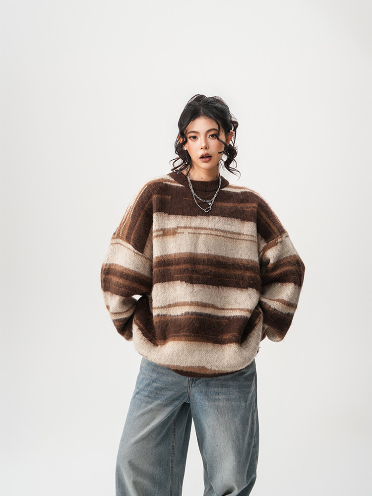 【60%OFF⭐️先行スタート!】【トップス】春 秋 冬 ストライプ柄 配色 ルーズ ニット ラウンドネック セーター 【FCシリーズ】