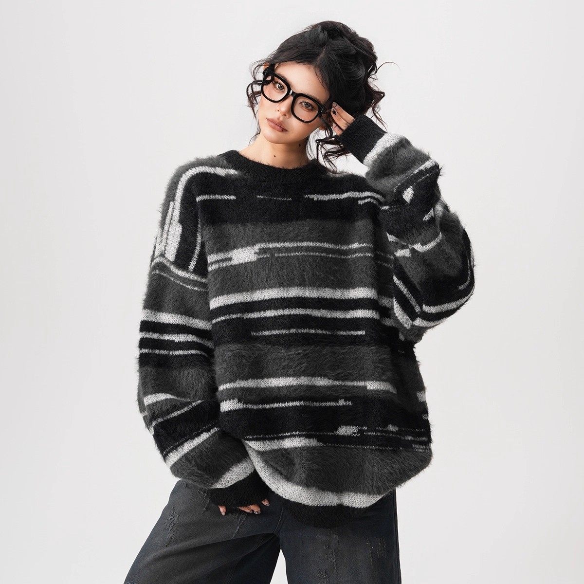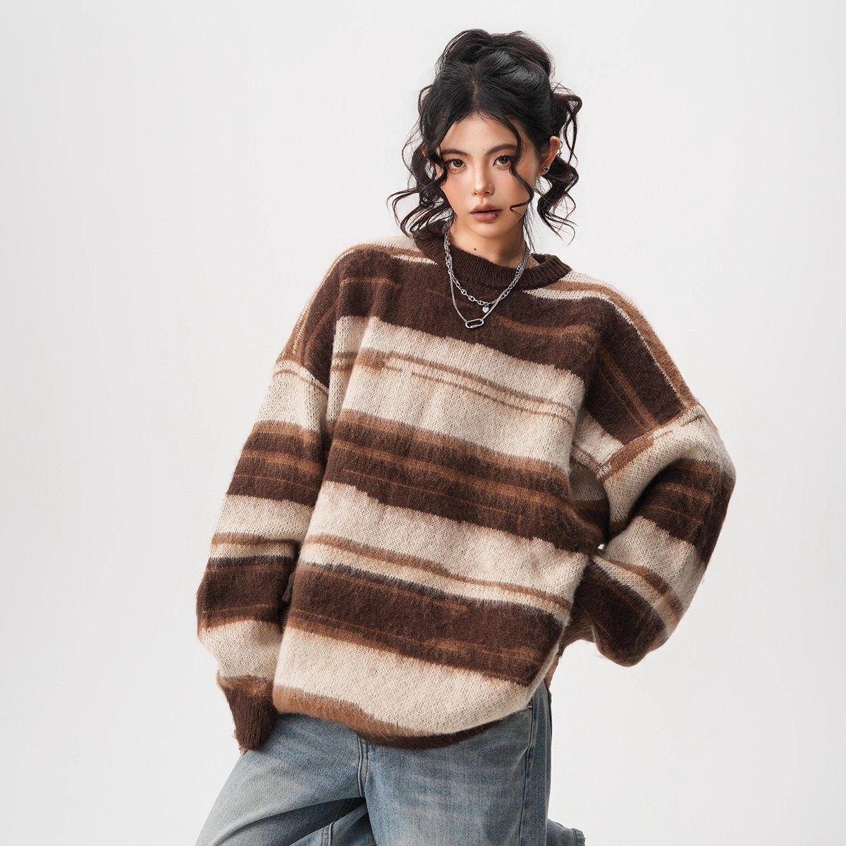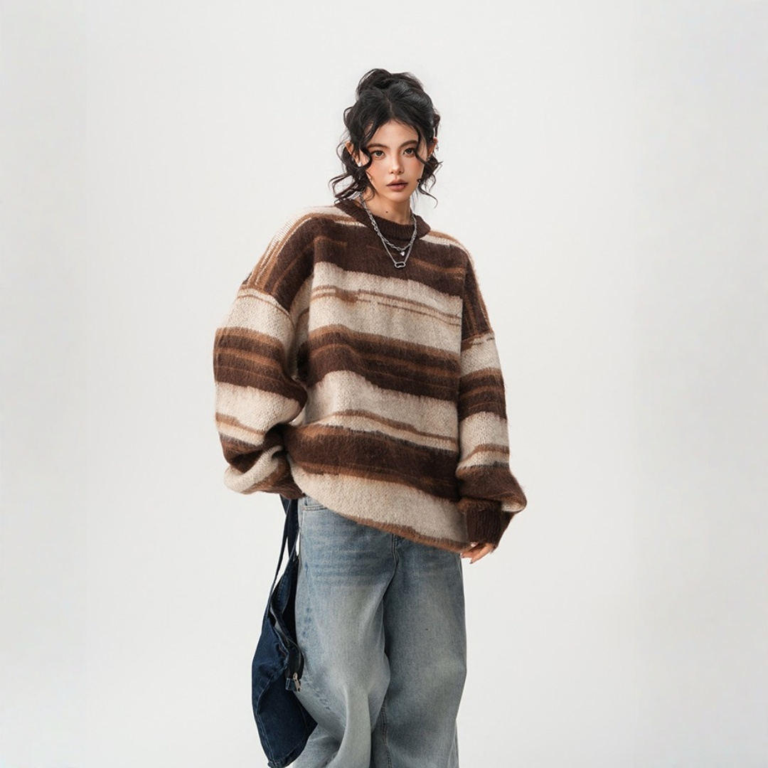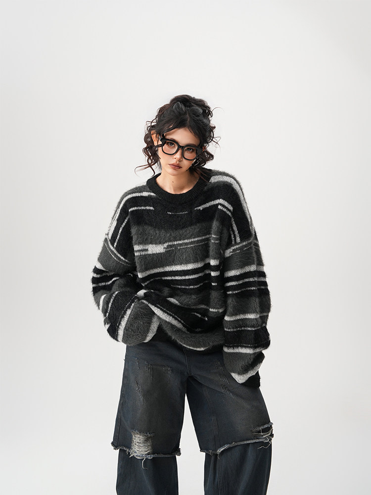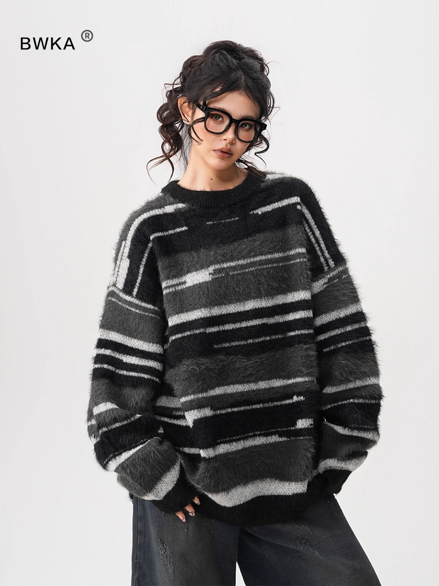 【60%OFF⭐️先行スタート!】【トップス】春 秋 冬 ストライプ柄 配色 ルーズ ニット ラウンドネック セーター 【FCシリーズ】