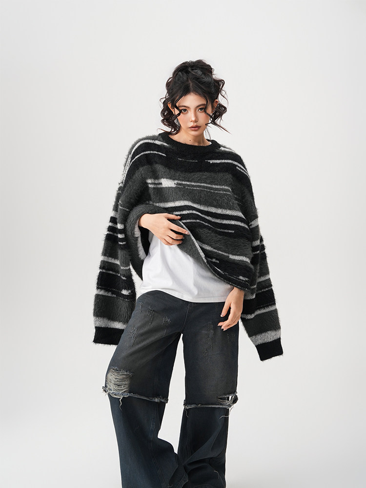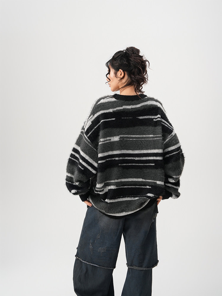 【商品名】【トップス】春 秋 冬 ストライプ柄 配色 ルーズ ニット ラウンドネック セーター 【FCシリーズ】