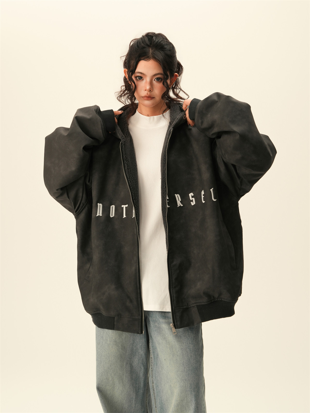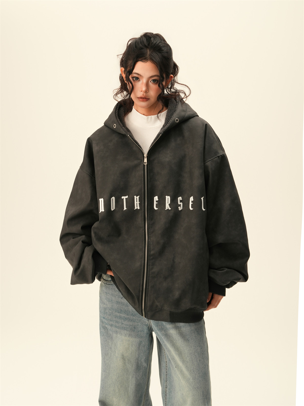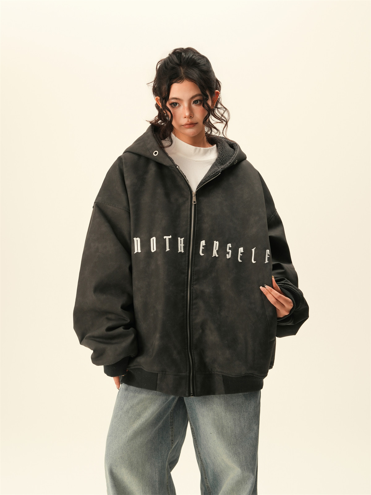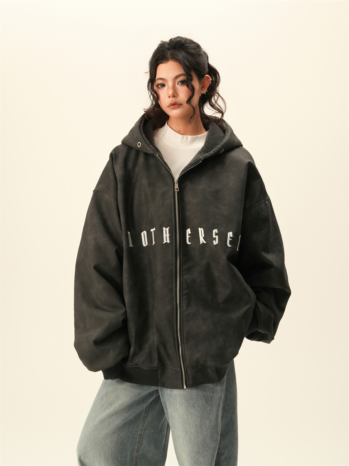 【商品名】【アウター】春 秋 冬 スエード調 ルーズテイスト アルファベット刺繍 裏起毛 ジャケット 【FCシリーズ】