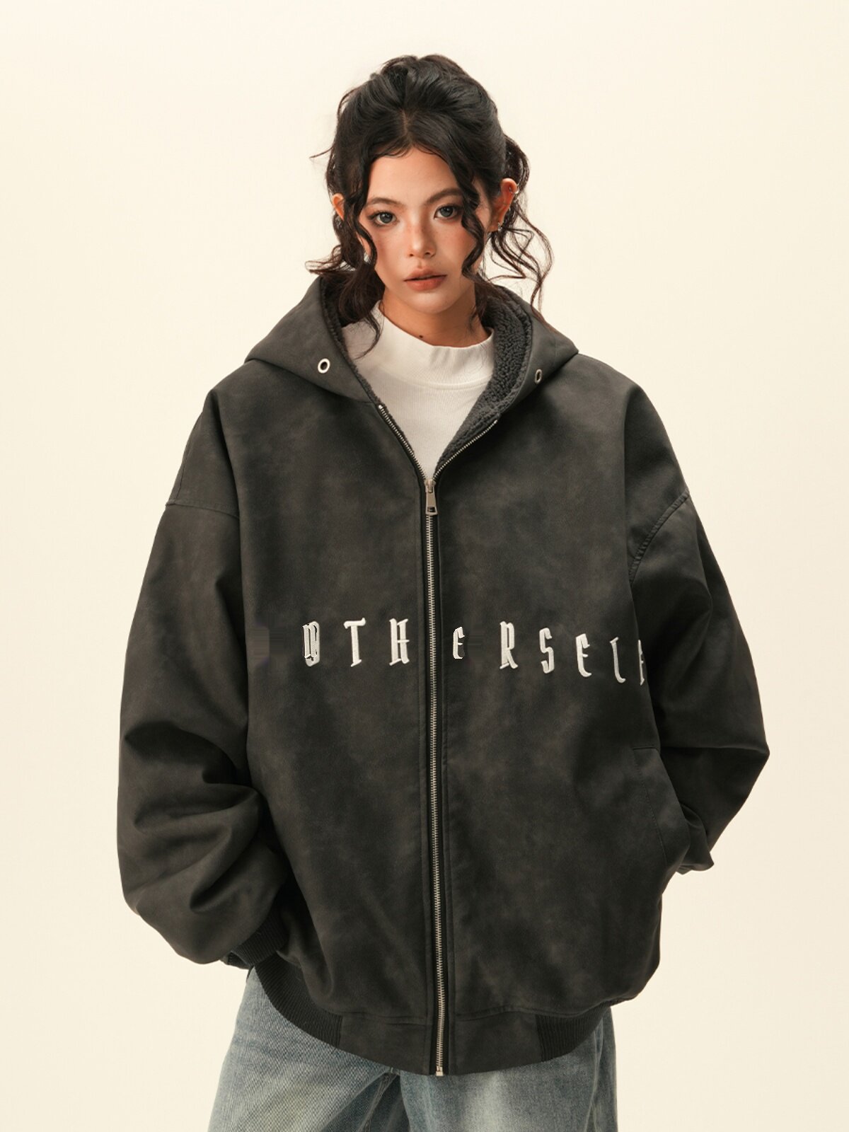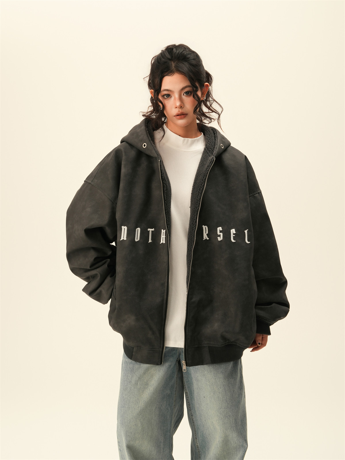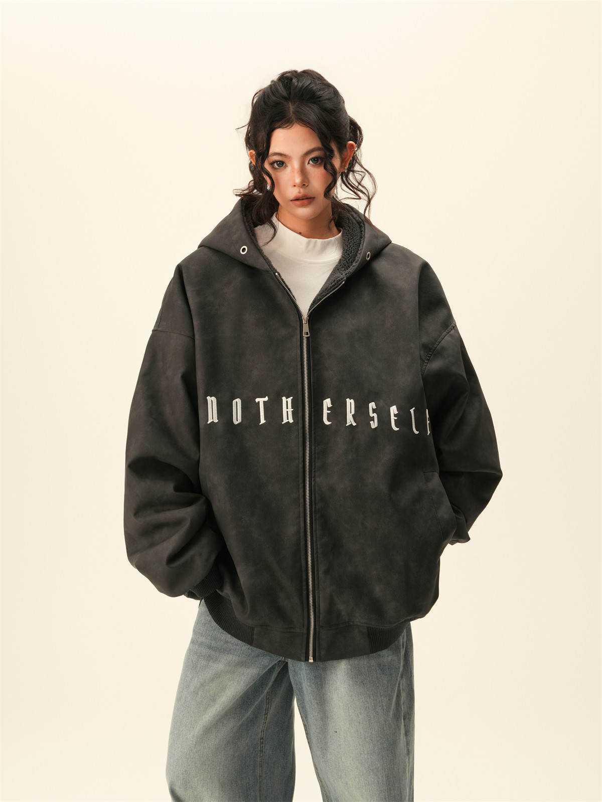 【商品名】【アウター】春 秋 冬 スエード調 ルーズテイスト アルファベット刺繍 裏起毛 ジャケット 【FCシリーズ】