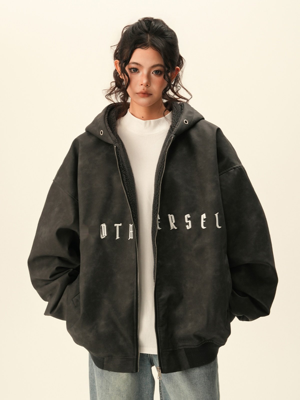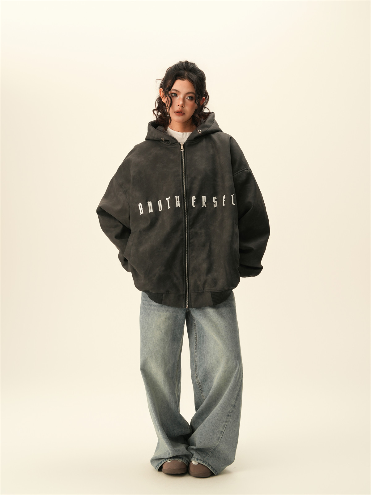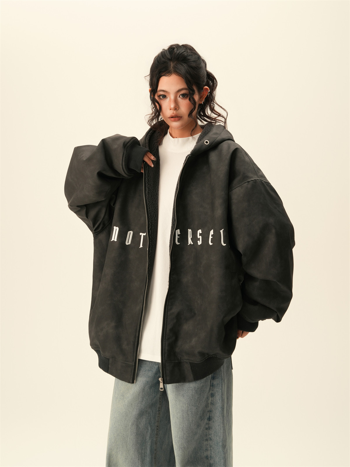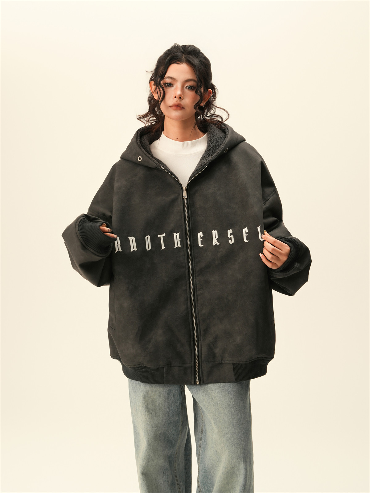 【商品名】【アウター】春 秋 冬 スエード調 ルーズテイスト アルファベット刺繍 裏起毛 ジャケット 【FCシリーズ】