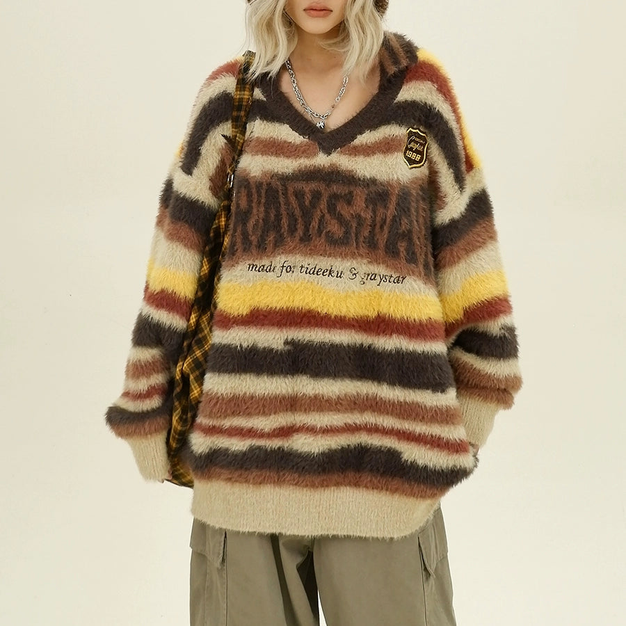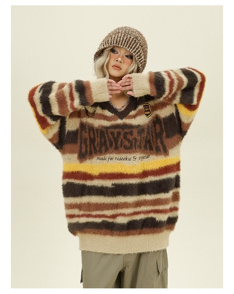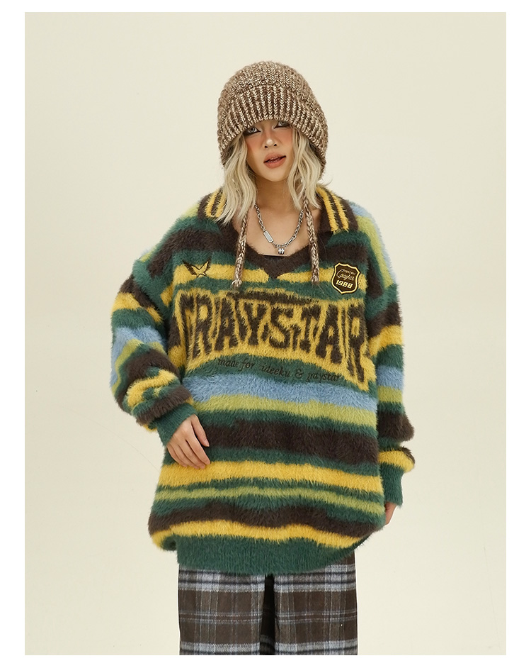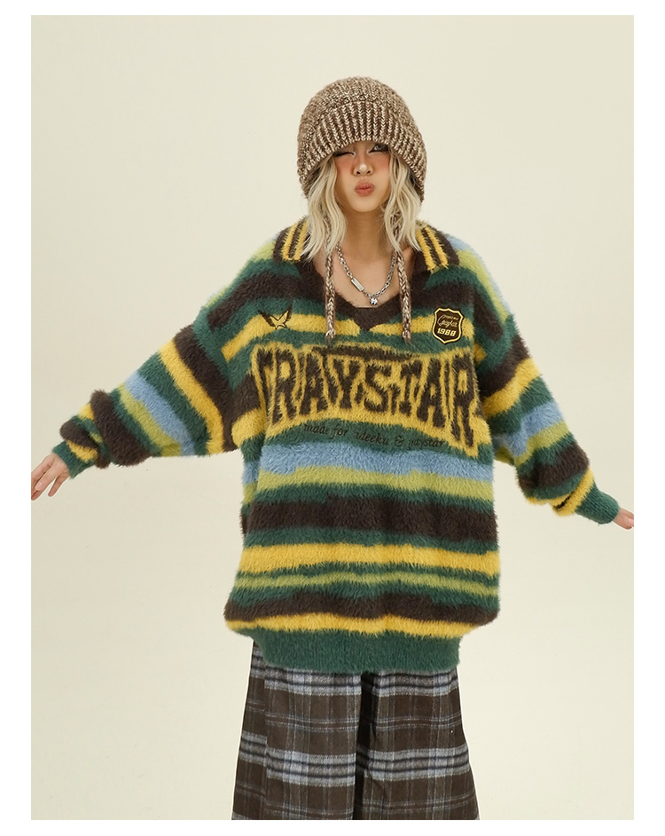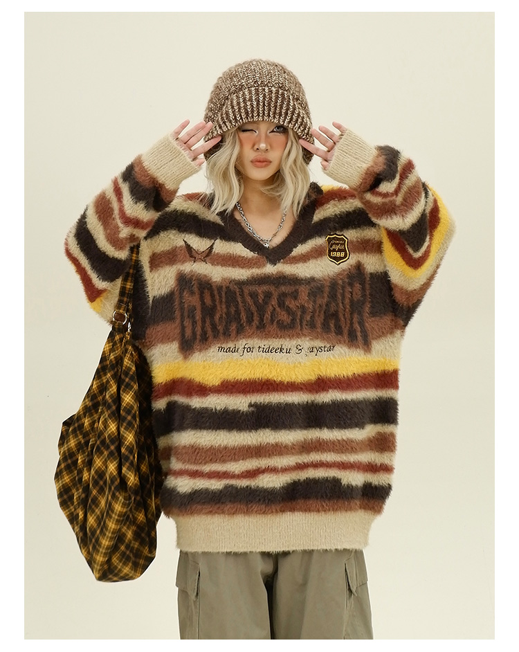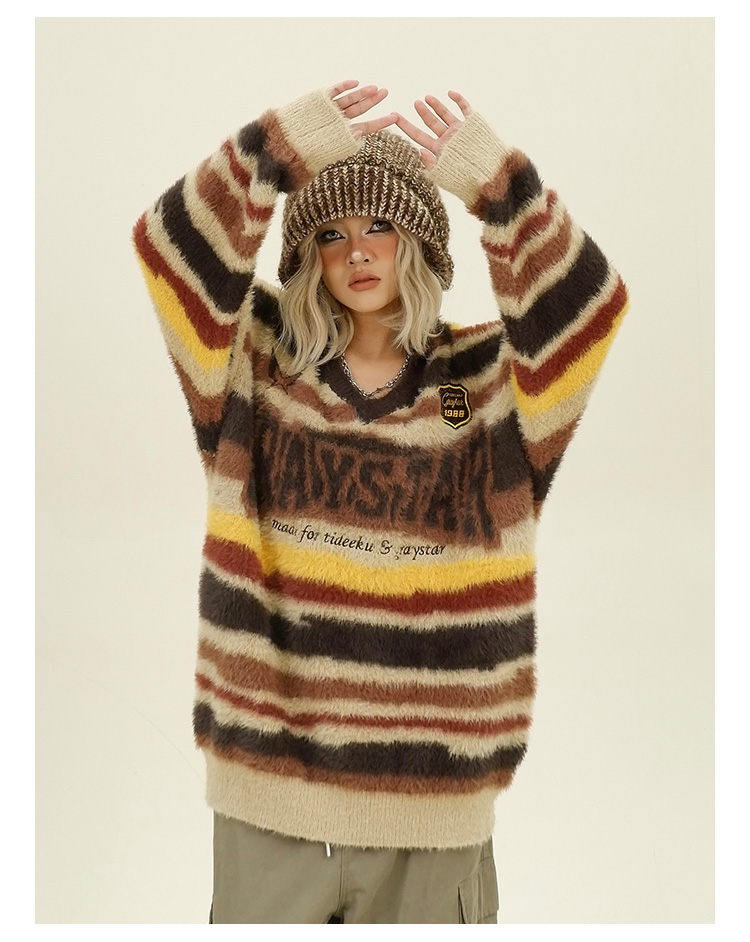 【トップス】アメリカンスタイル しま模様 ゆったり アルファベット ニットセーター【FCシリーズ】