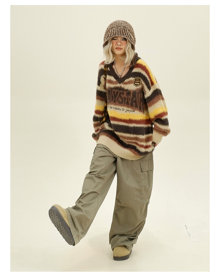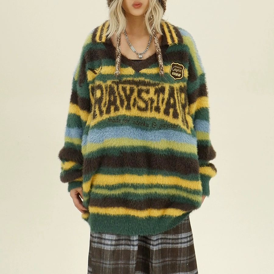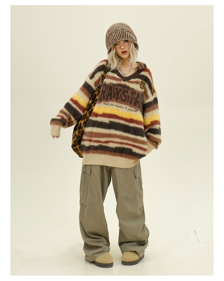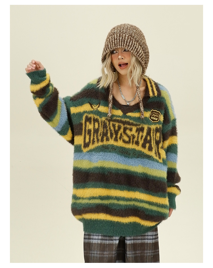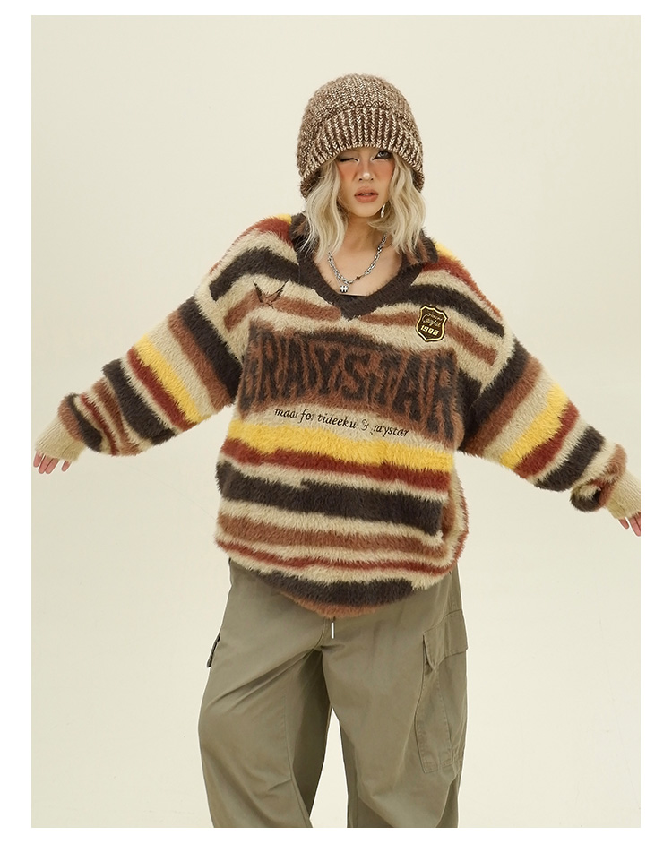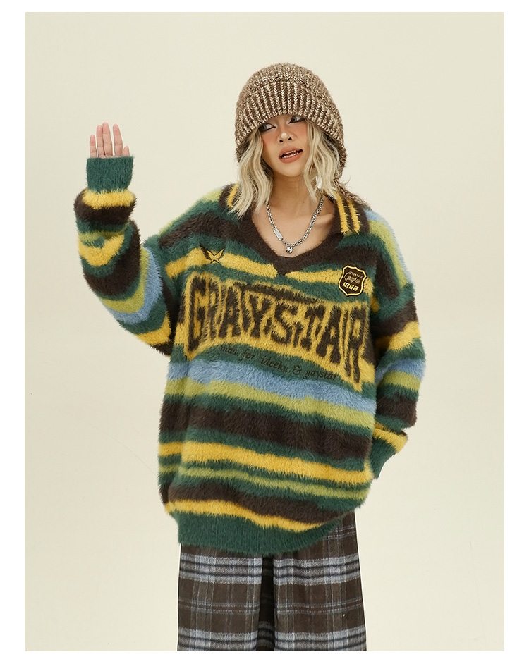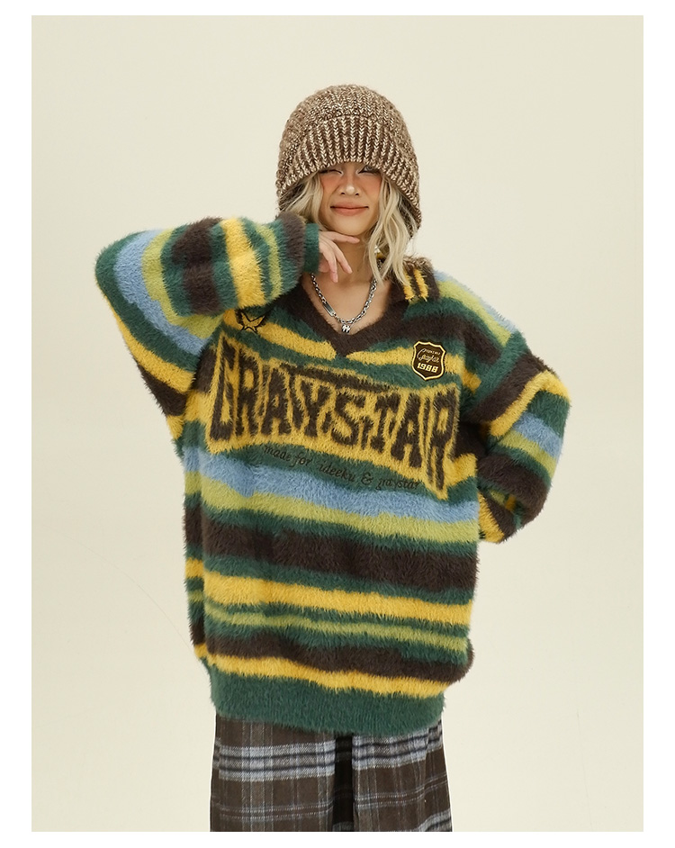 【トップス】アメリカンスタイル しま模様 ゆったり アルファベット ニットセーター【FCシリーズ】