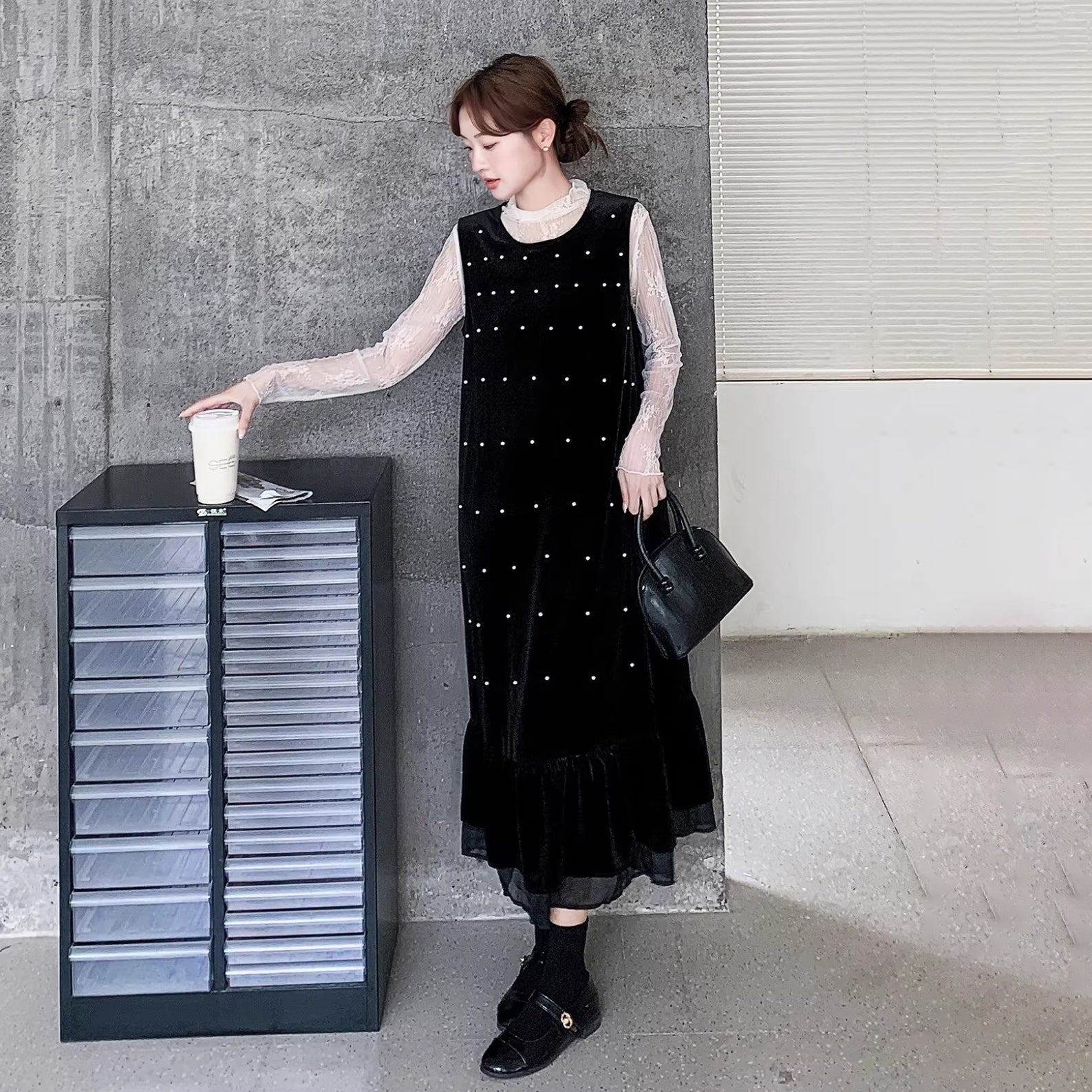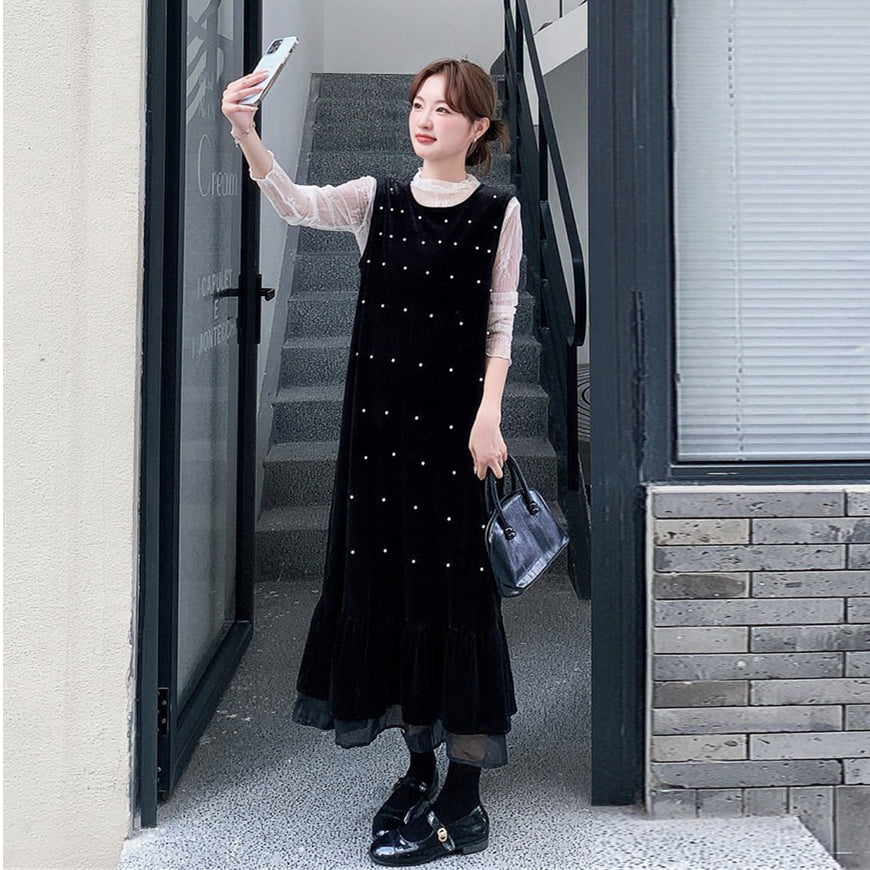 【商品名】【セットアップ】優しい雰囲気 インナートップス+ドット柄 キャミワンピースセット レディース 春秋【JZシリーズ】