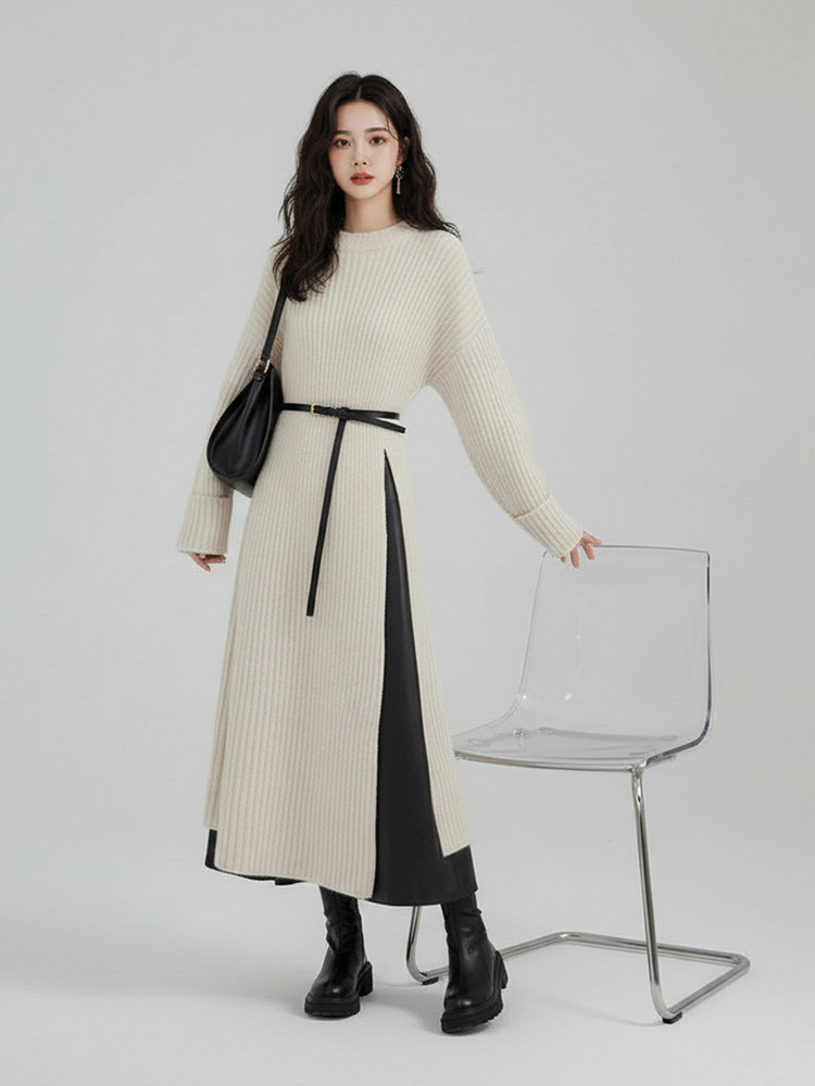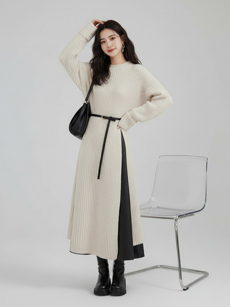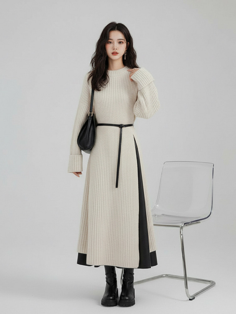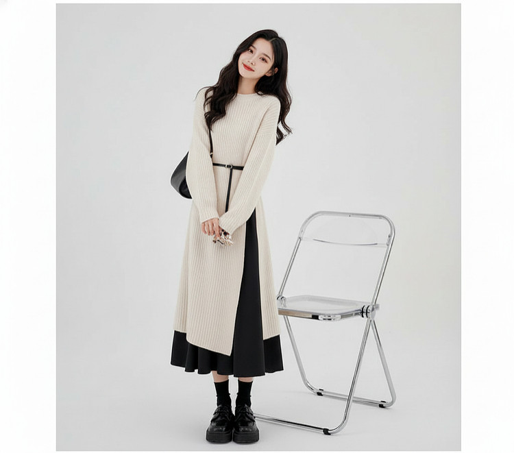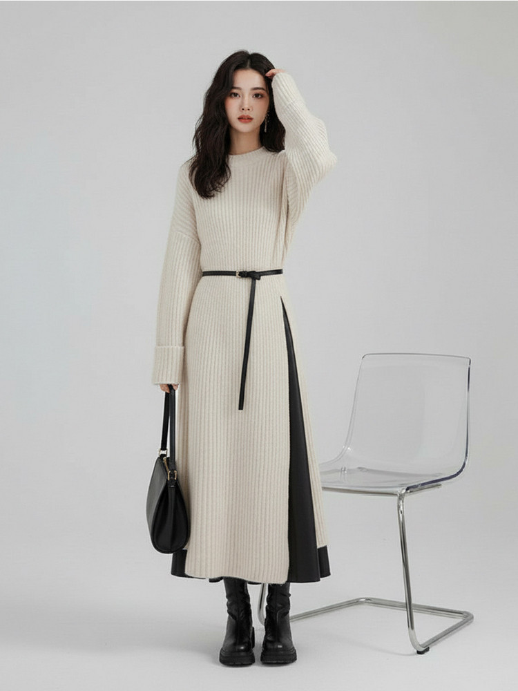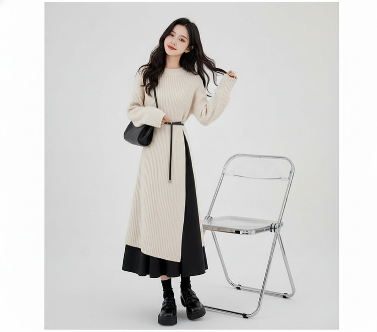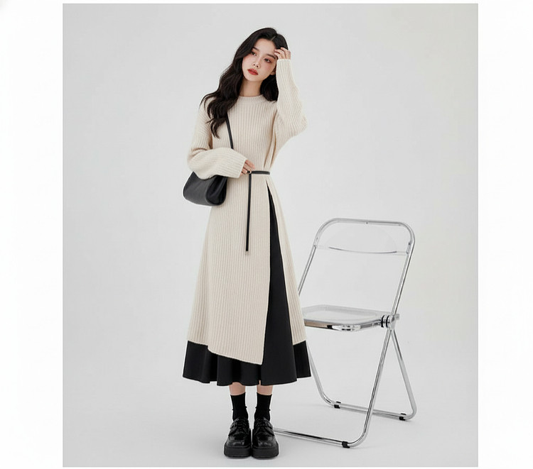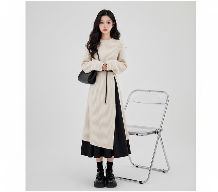 【60%OFF⭐️早い者勝ち】【ワンピース】春秋ラウンドネック 長袖 ニット パッチワーク ロング 長袖ワンピース