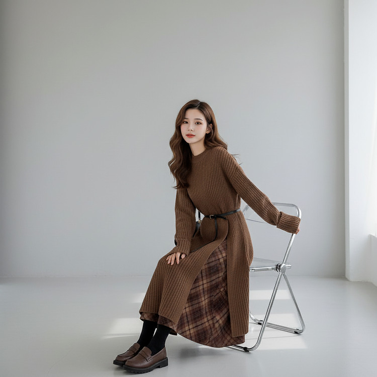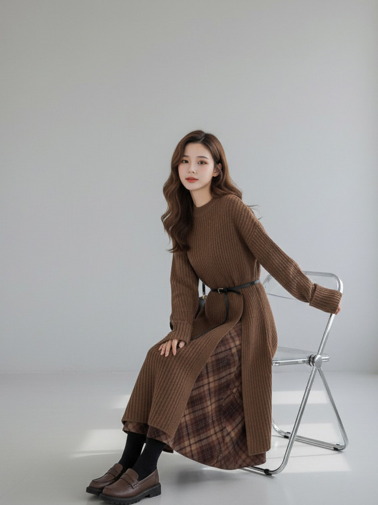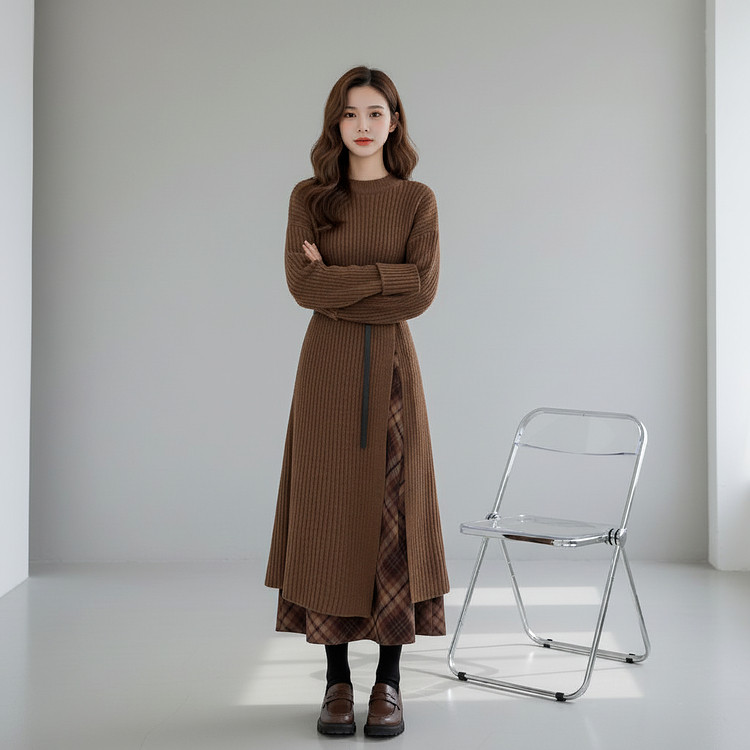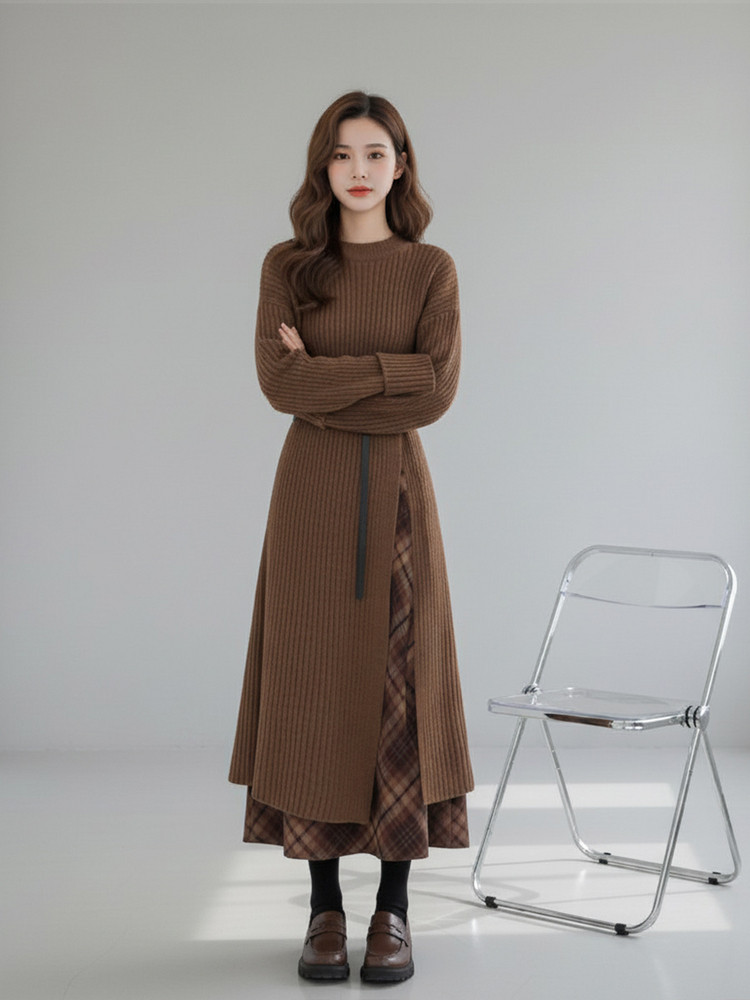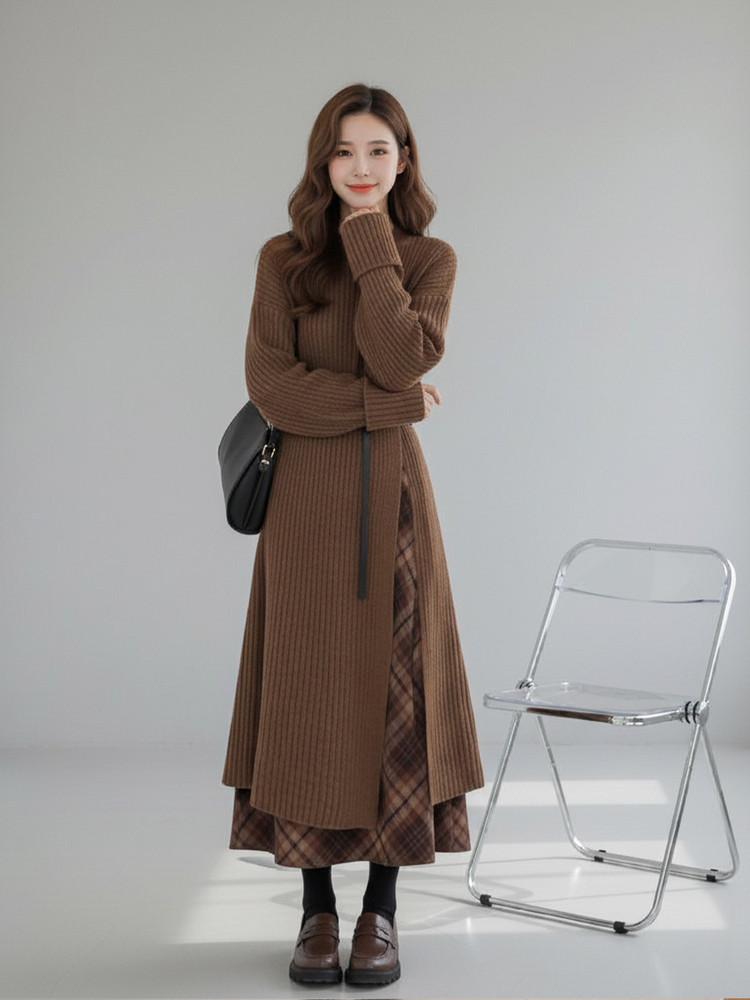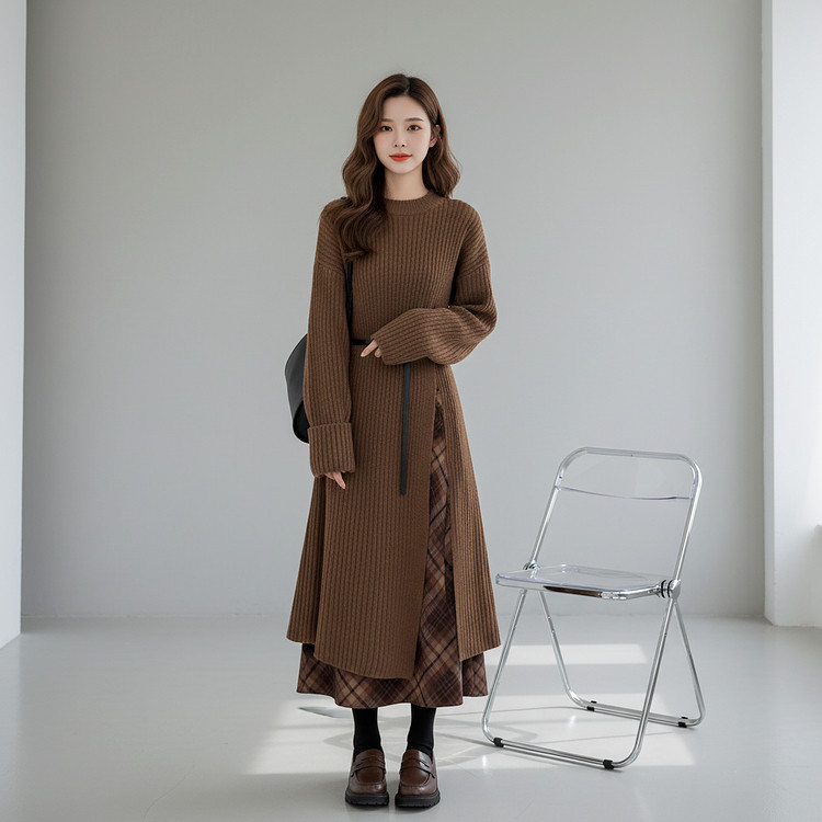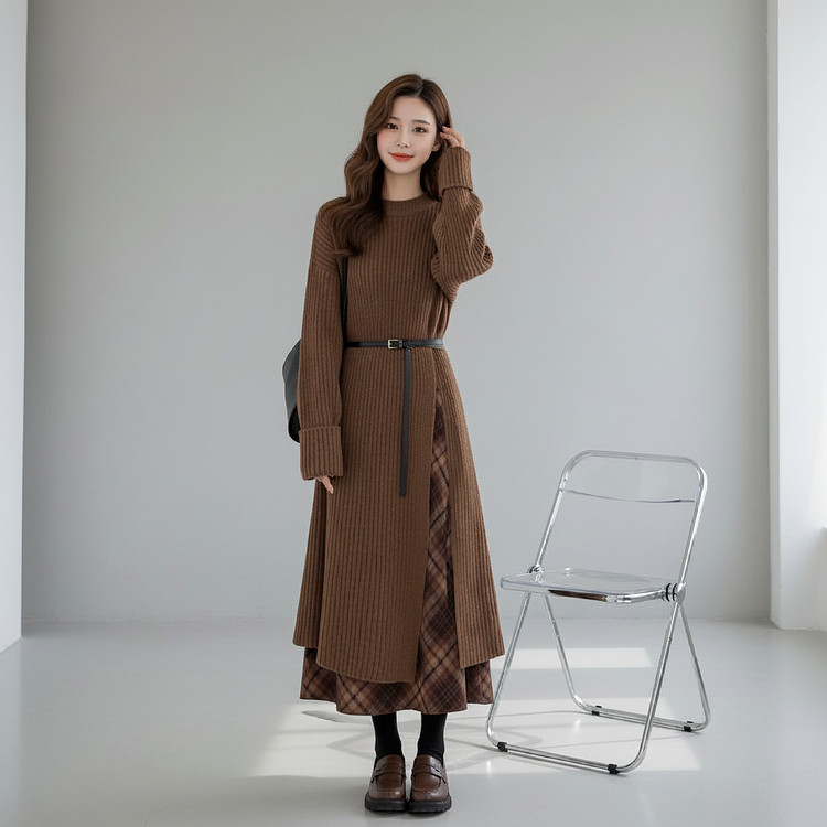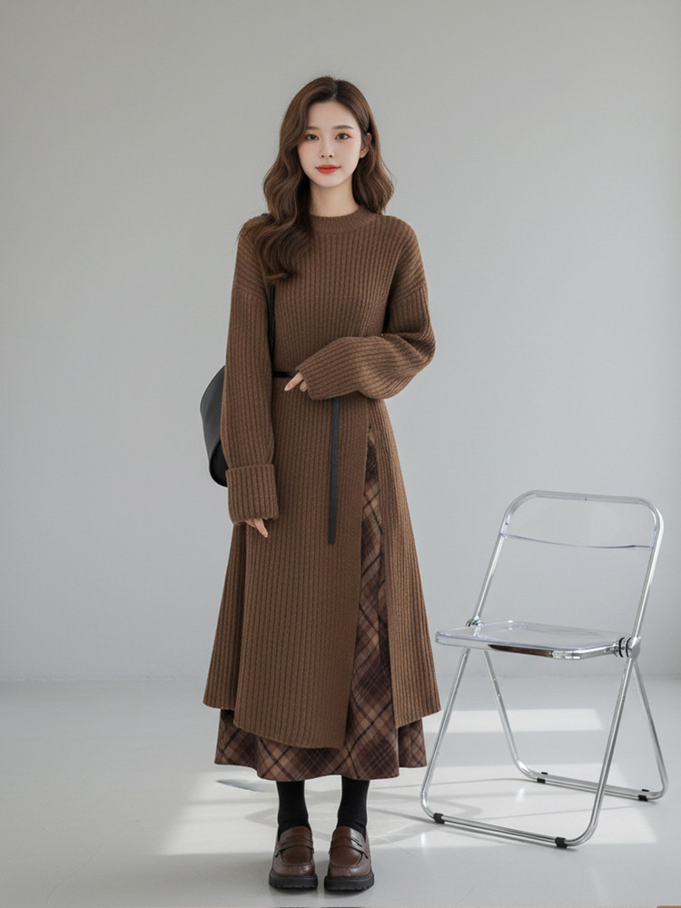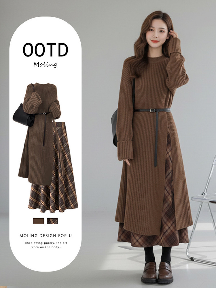 【セットアップ】メラード風 春 秋 冬 ニット ワンピース + ベルト + チェック柄 スカート 3点 ワンピースセット 【JZシリーズ】