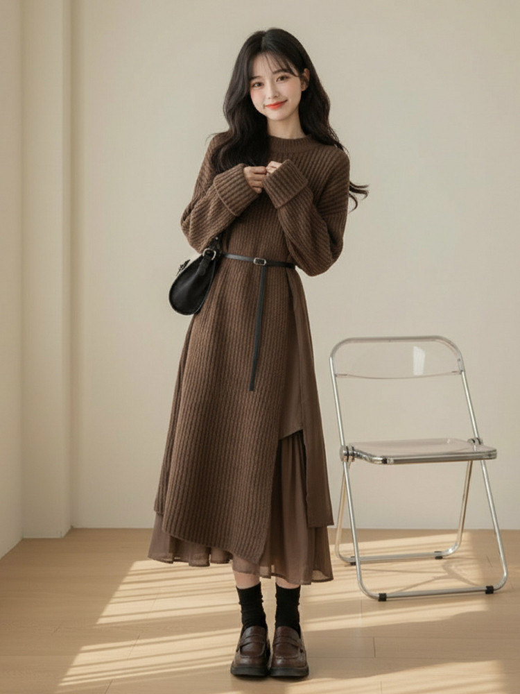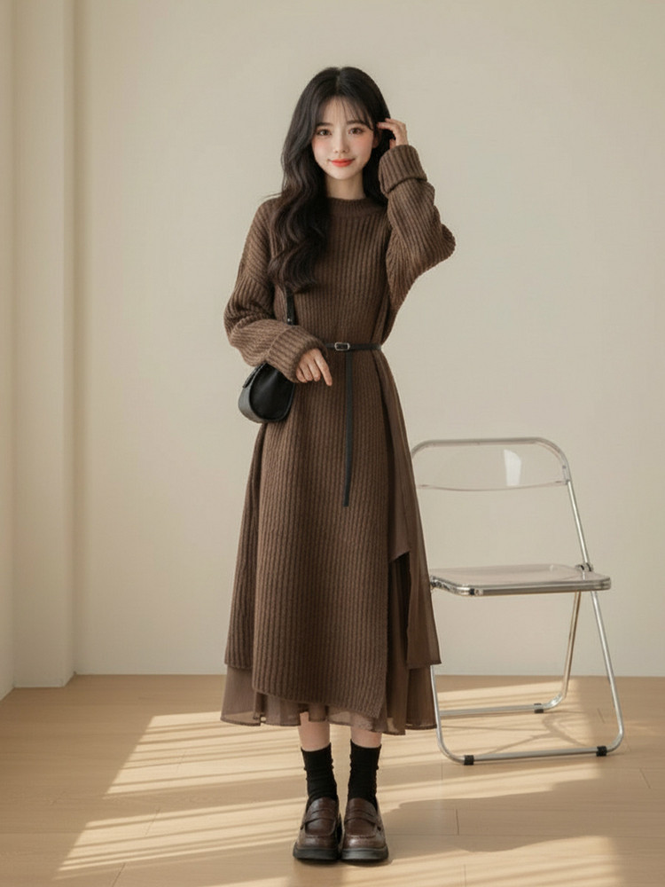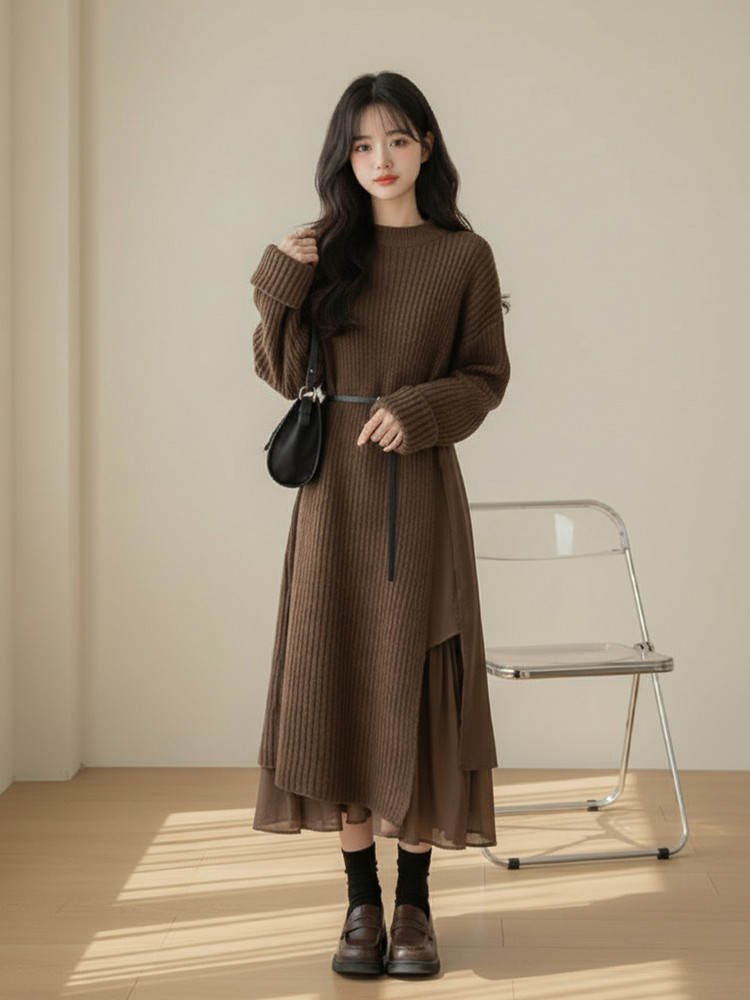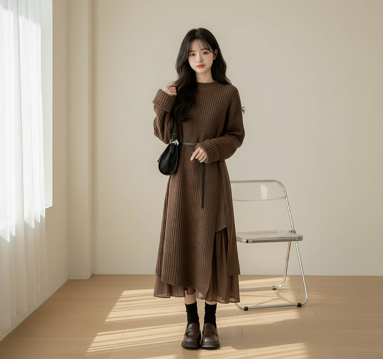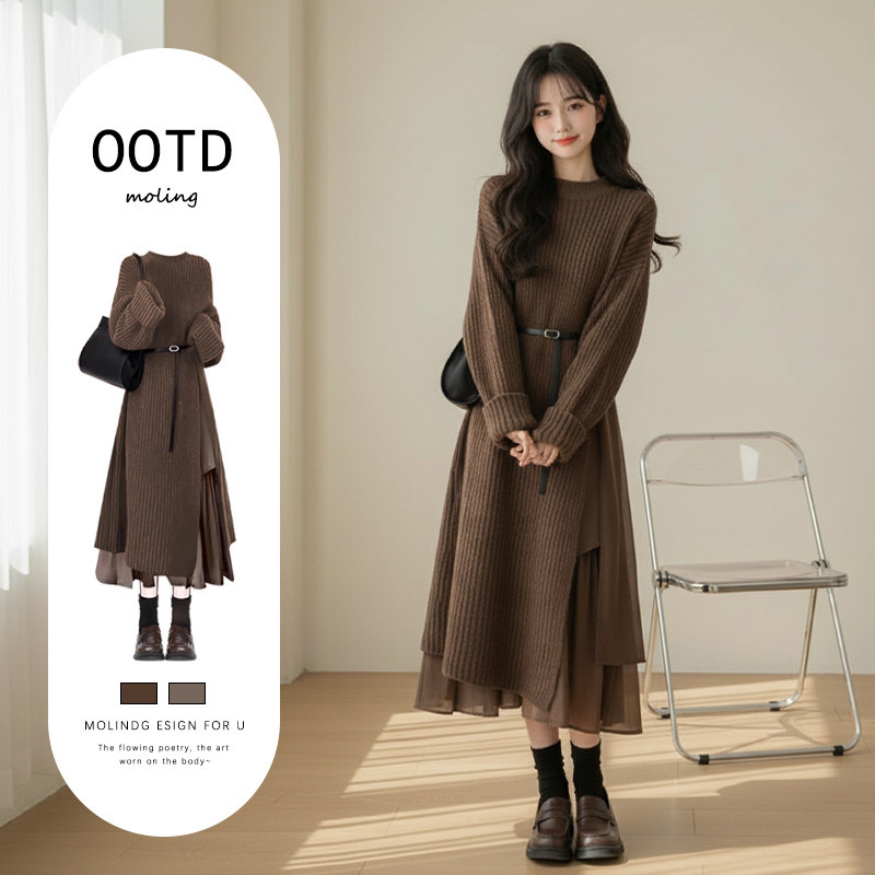 【60%OFF⭐️早い者勝ち】【ワンピース】春秋ラウンドネック 長袖 ニット パッチワーク ロング 長袖ワンピース