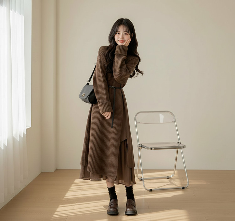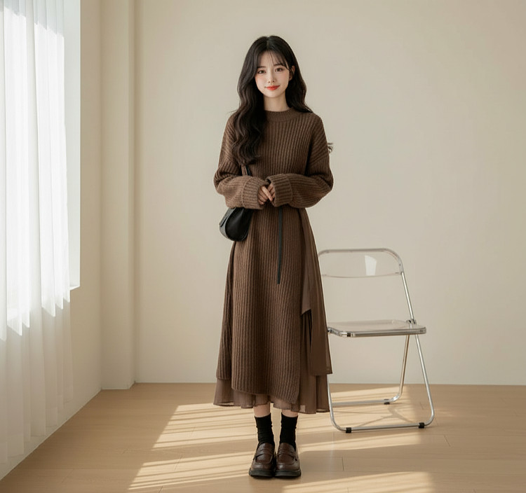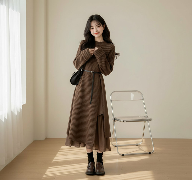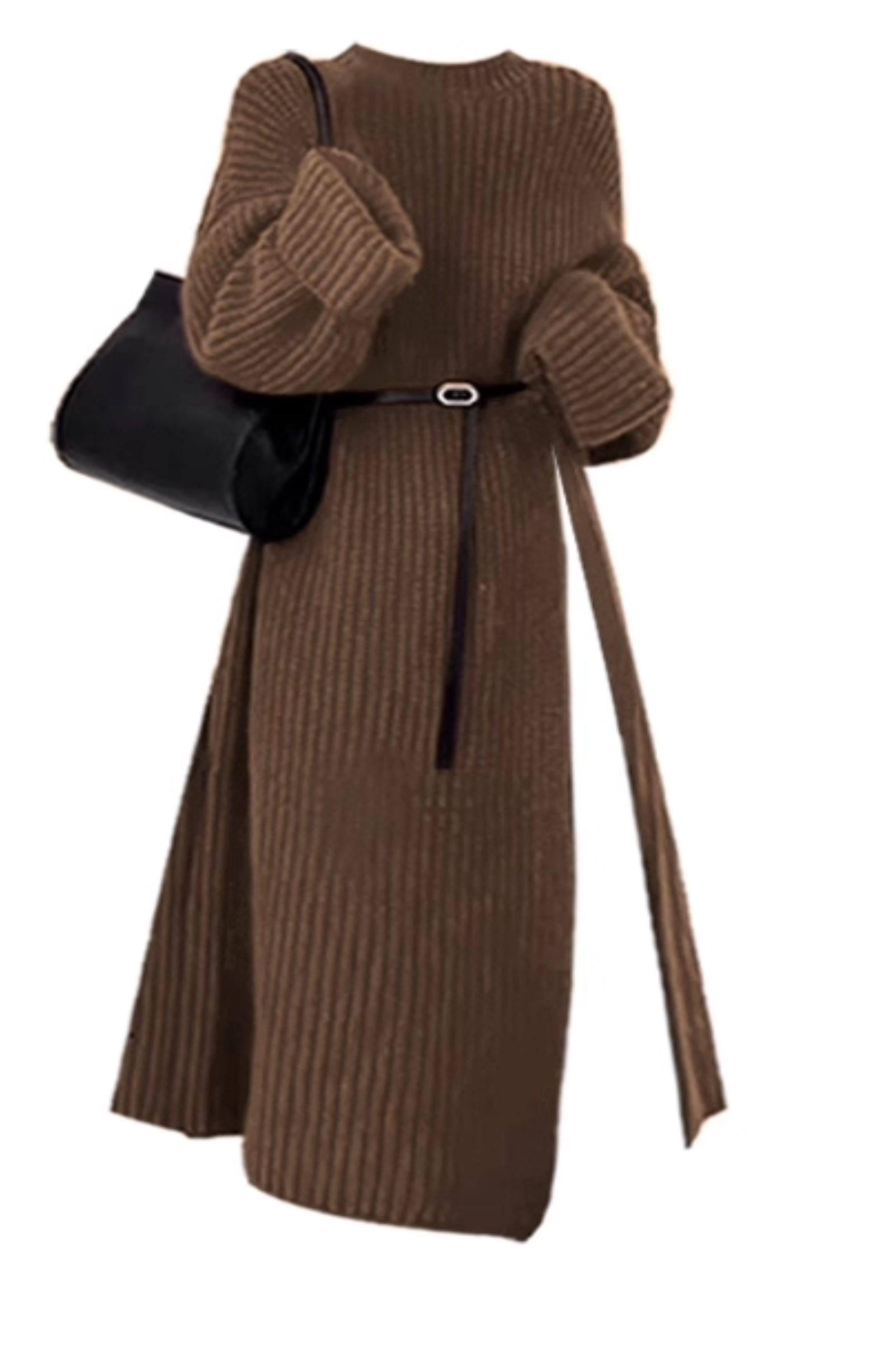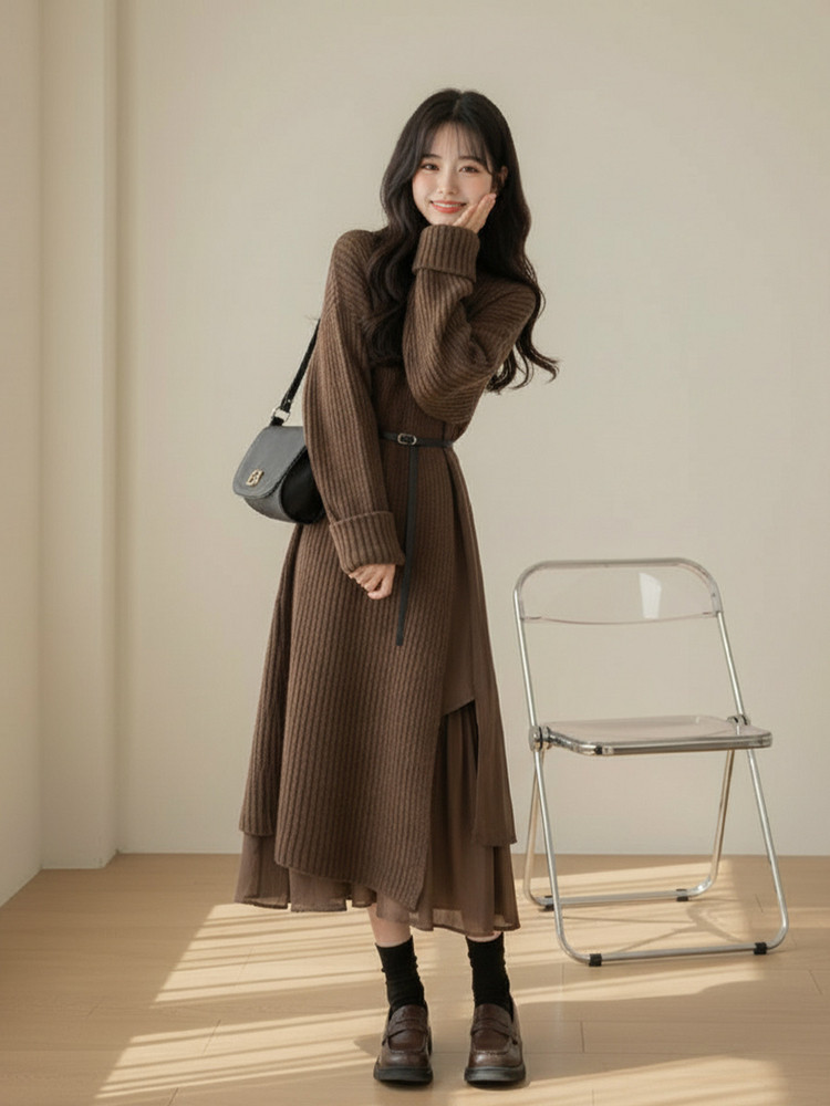 【60%OFF⭐️早い者勝ち】【ワンピース】春秋ラウンドネック 長袖 ニット パッチワーク ロング 長袖ワンピース