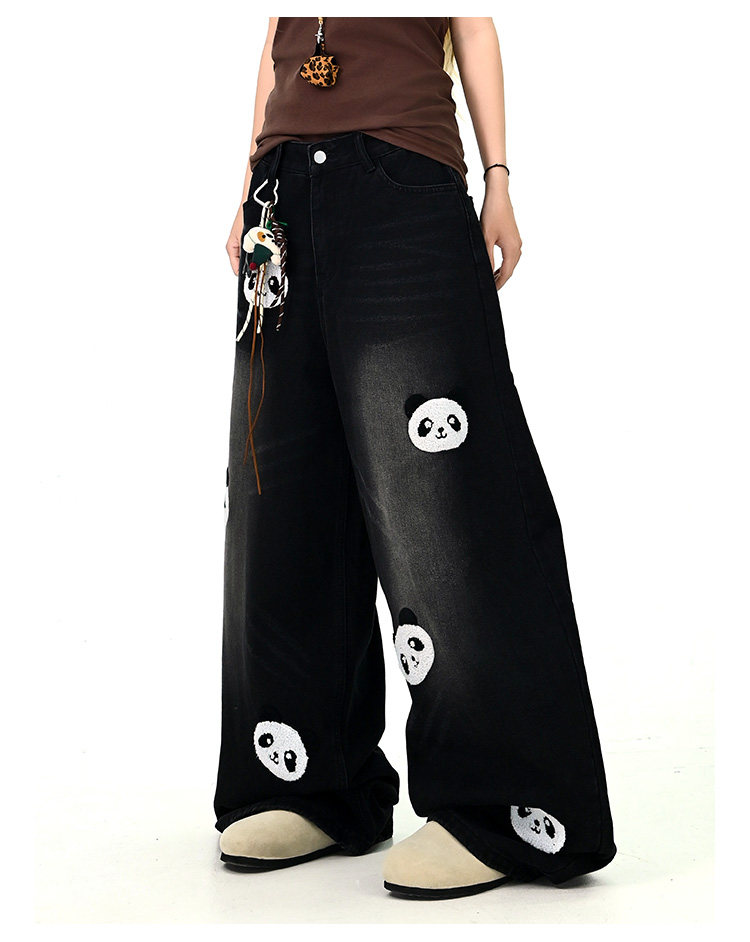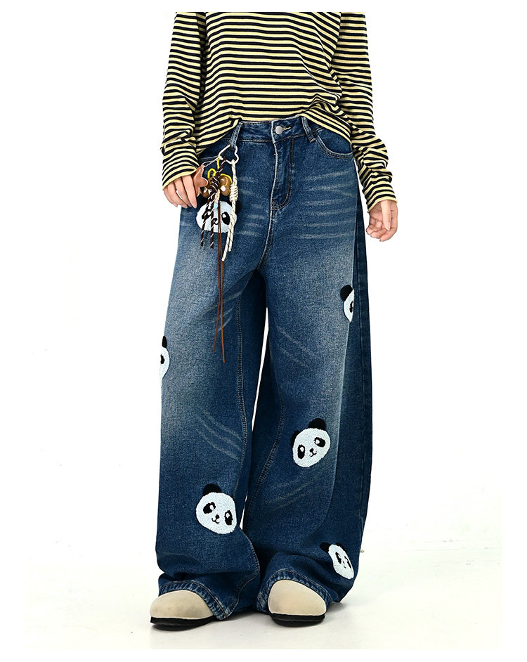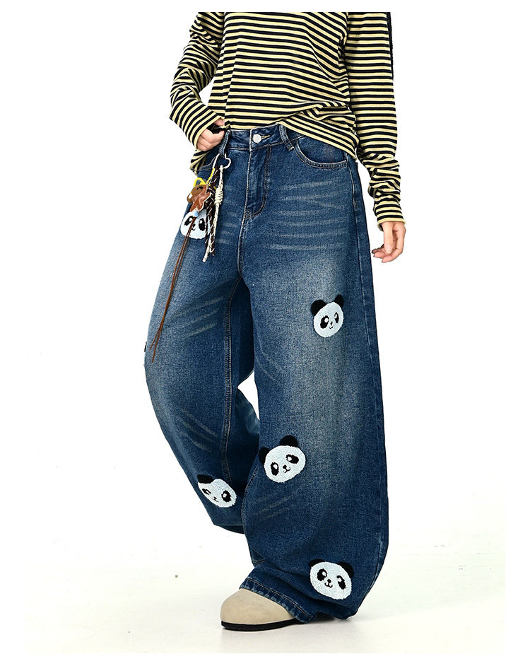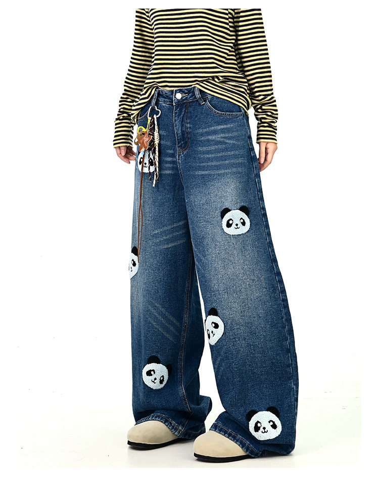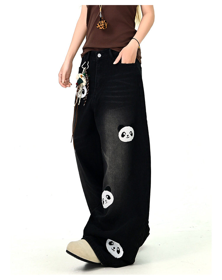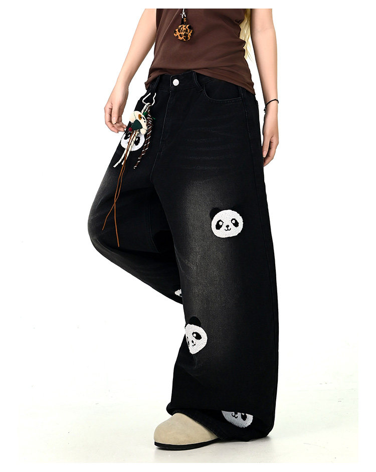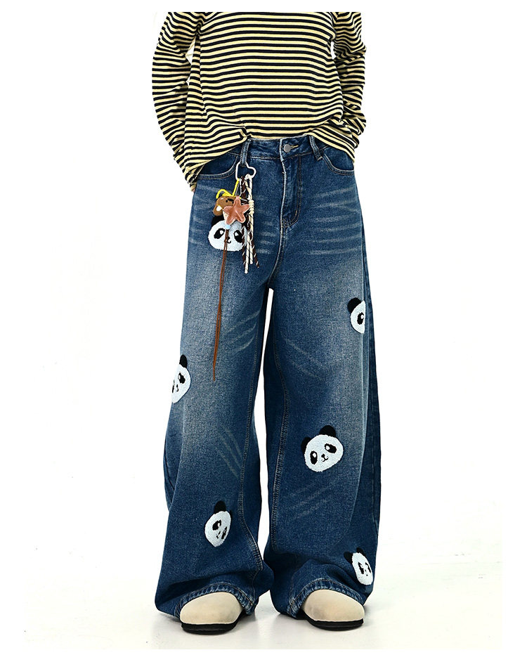 🎁ご注文でチャームプレゼント!【ボトムス】アメリカンスタイル 🐼パンダ刺繍 裏起毛 デニム パンツ【FCシリーズ】