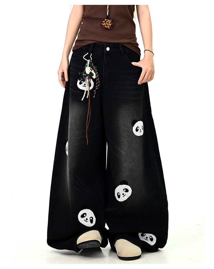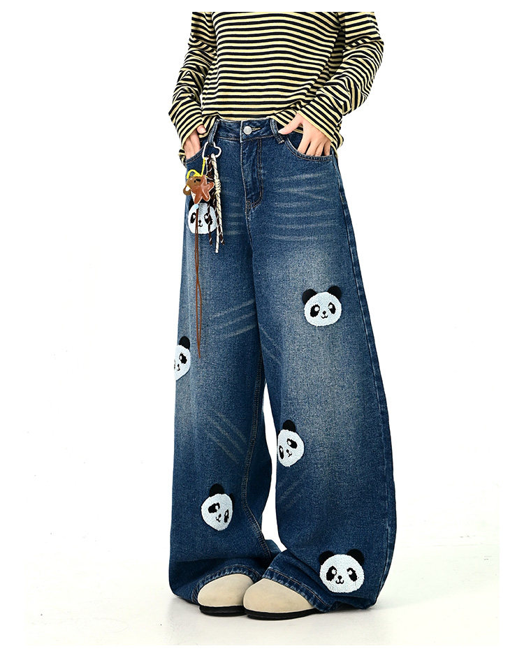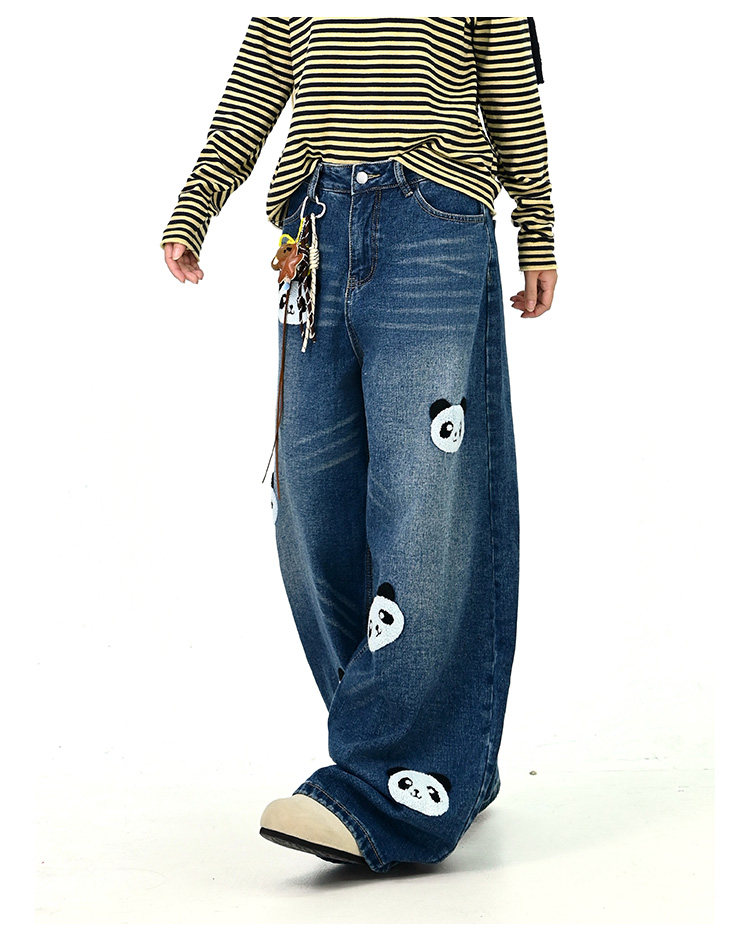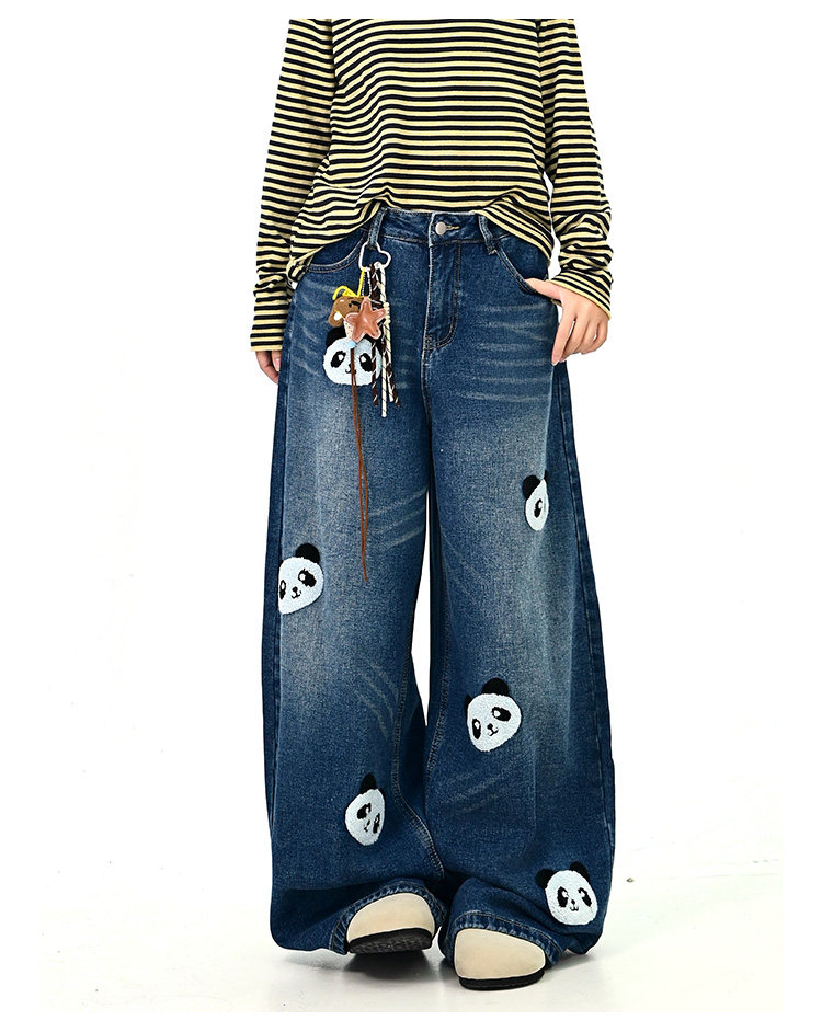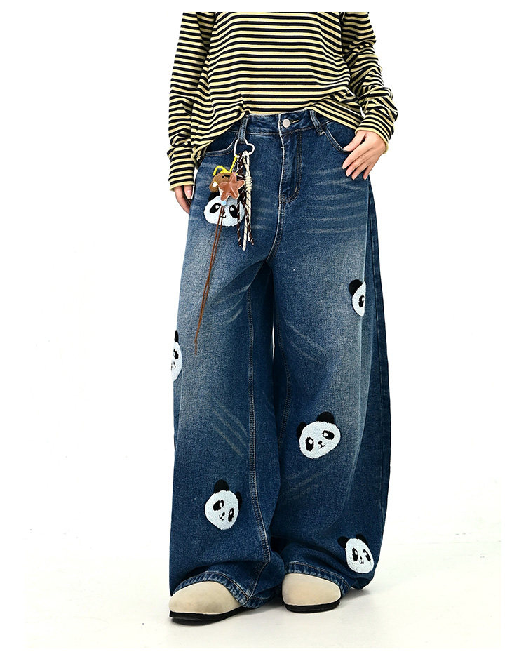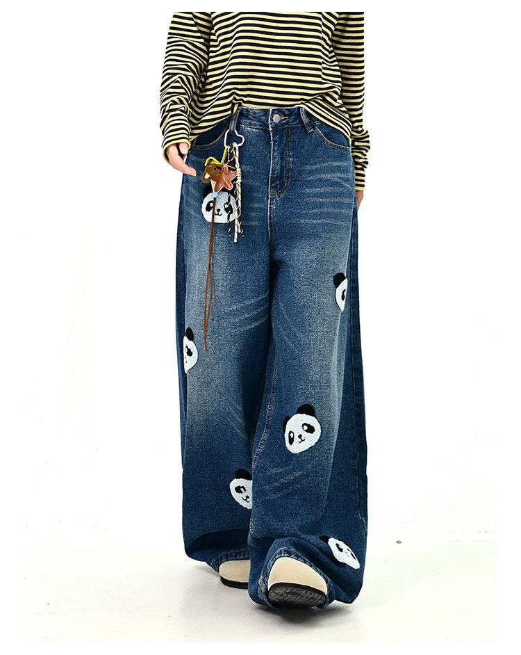 🎁ご注文でチャームプレゼント!【ボトムス】アメリカンスタイル 🐼パンダ刺繍 裏起毛 デニム パンツ【FCシリーズ】