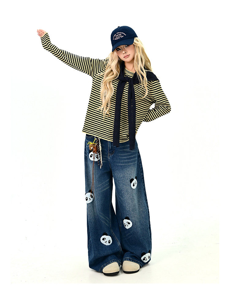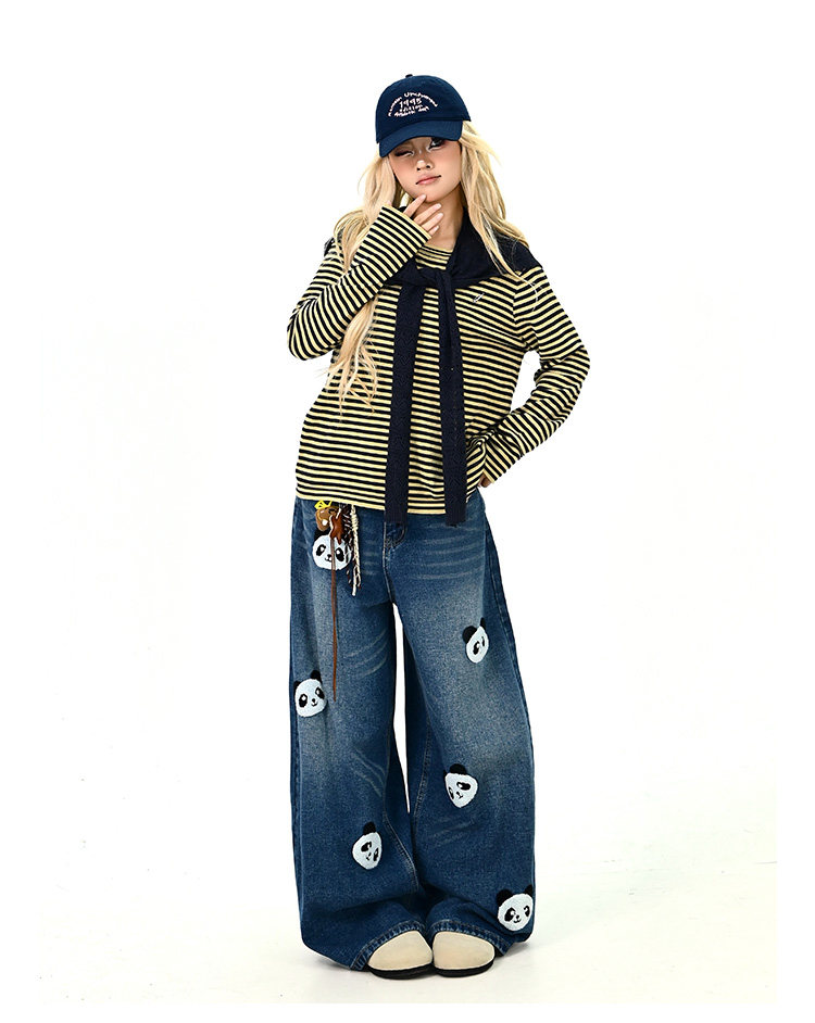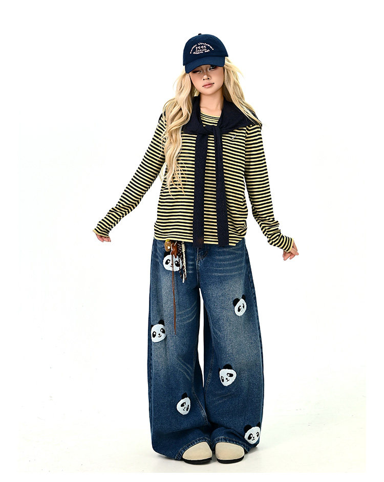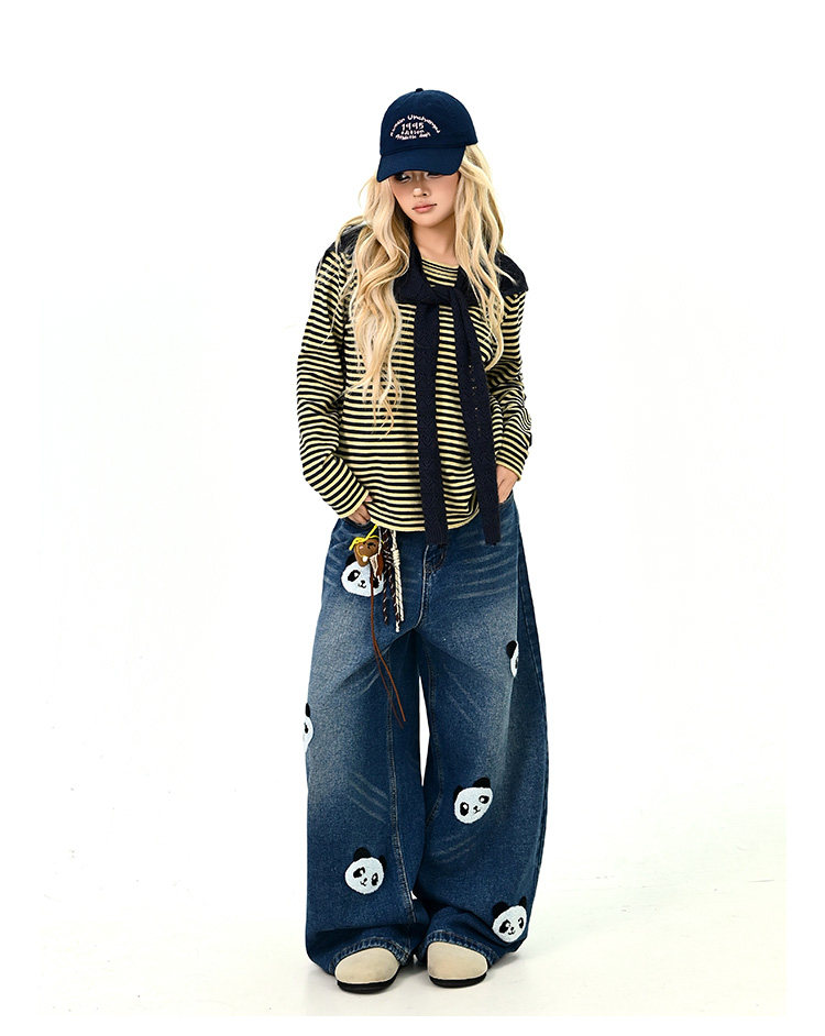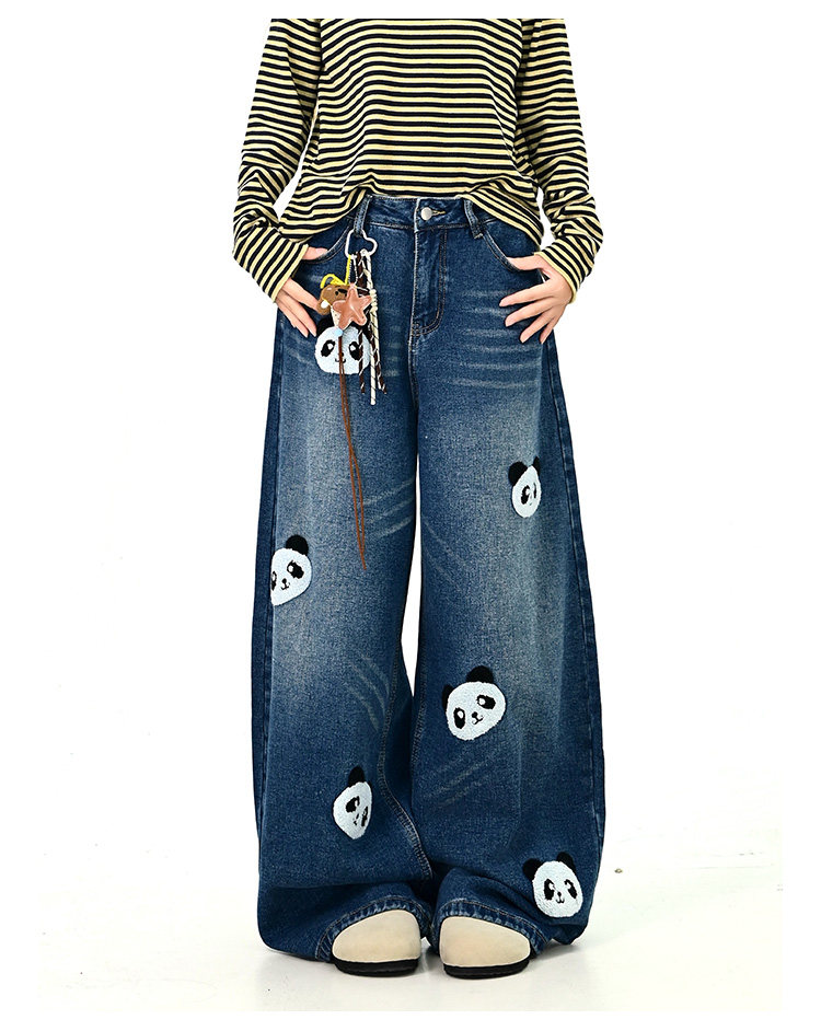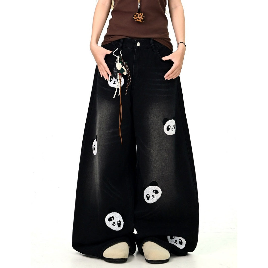 🎁ご注文でチャームプレゼント!【ボトムス】アメリカンスタイル 🐼パンダ刺繍 裏起毛 デニム パンツ【FCシリーズ】