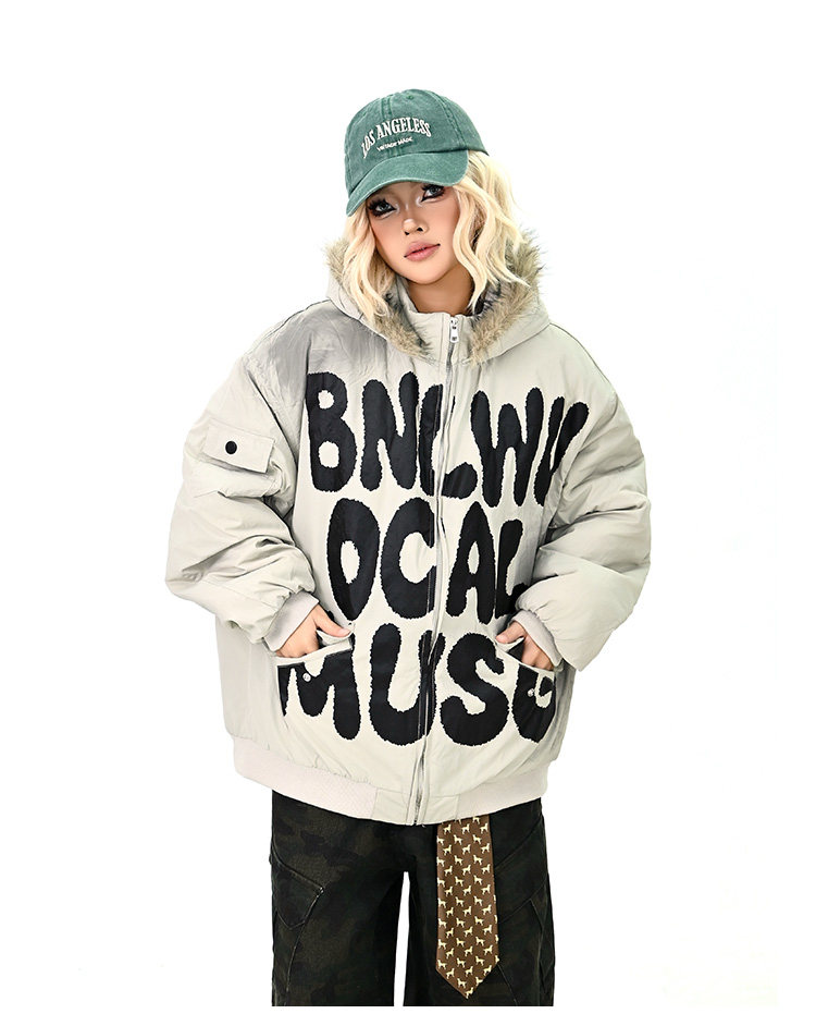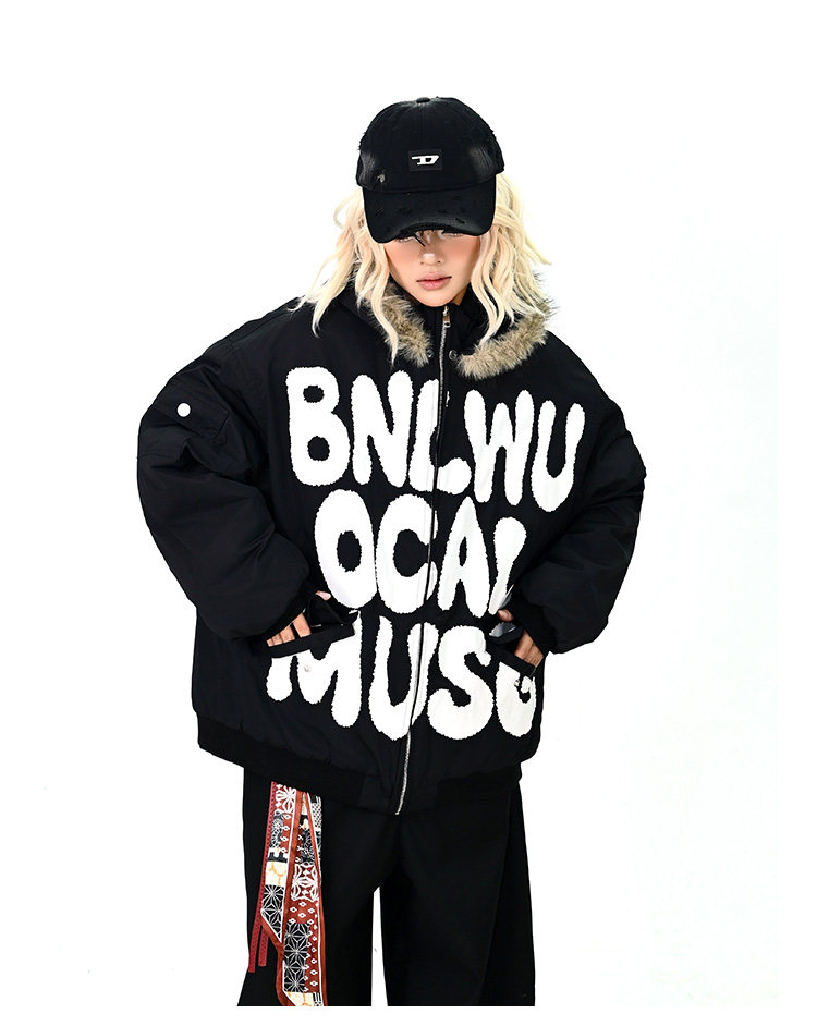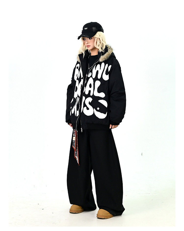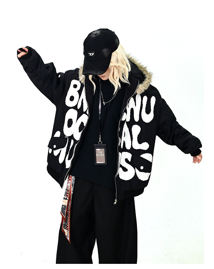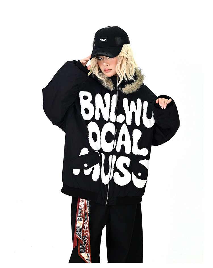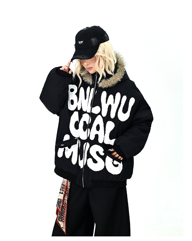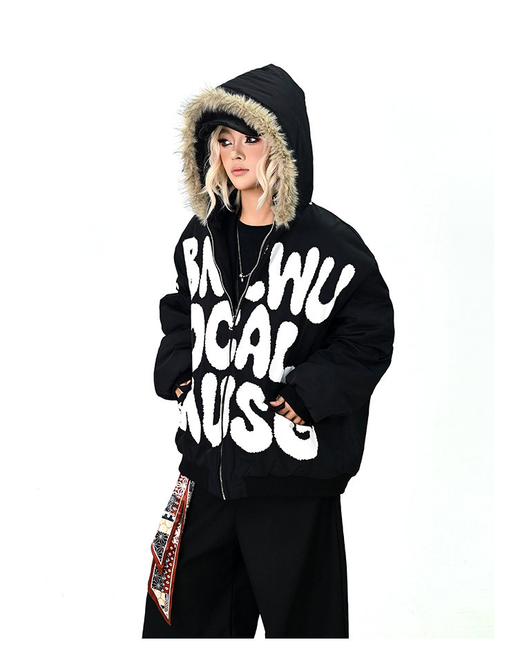 【アウター】ロゴ入り ファー付きフードコート レディース 冬 ゆったりBF風 韓国風 学院風 綿入れコート【FCシリーズ】