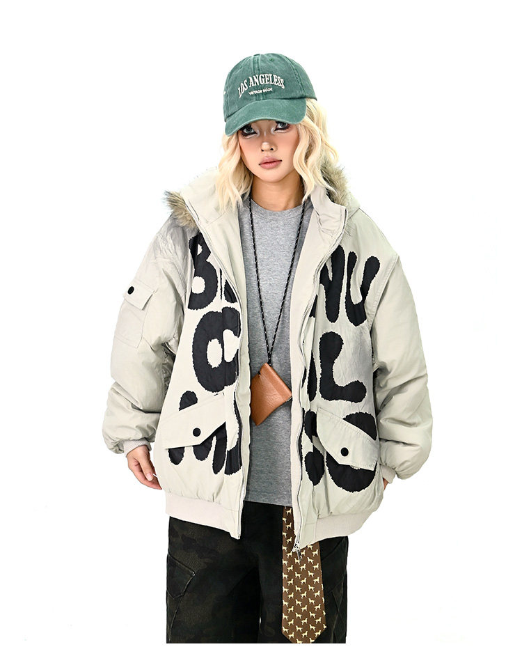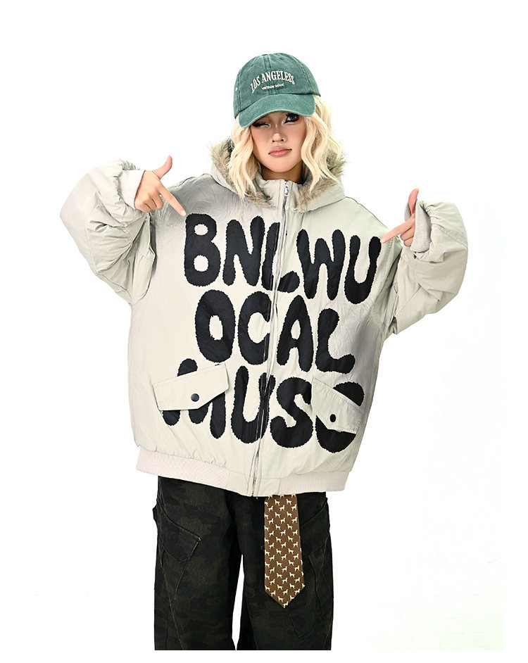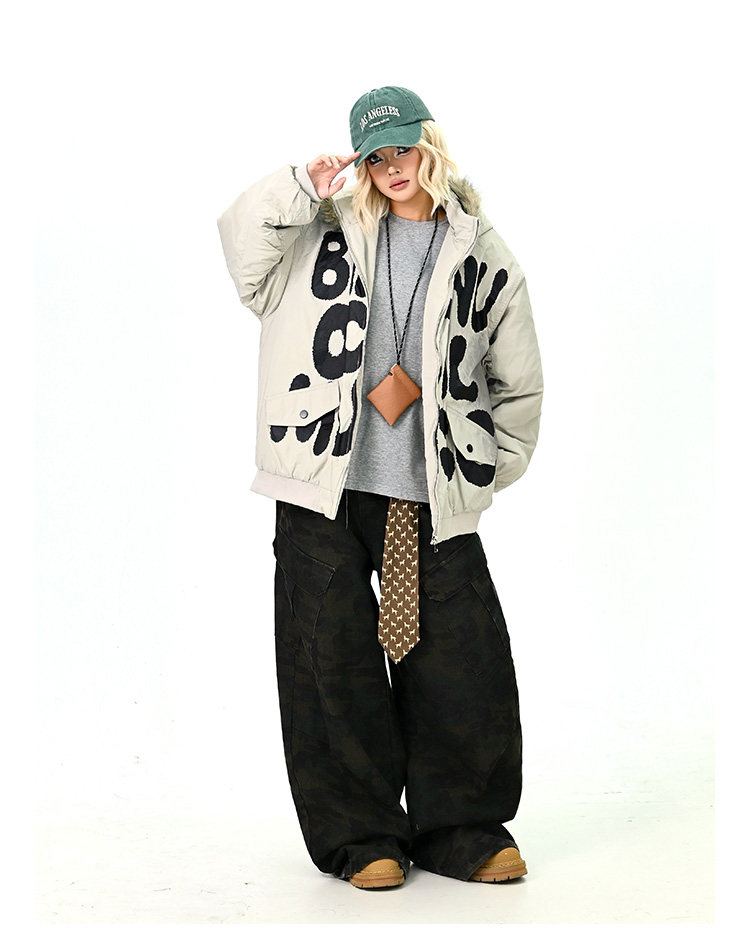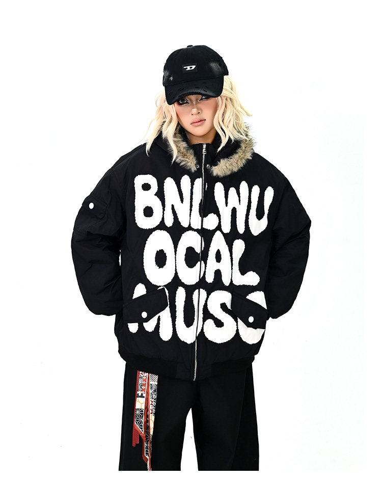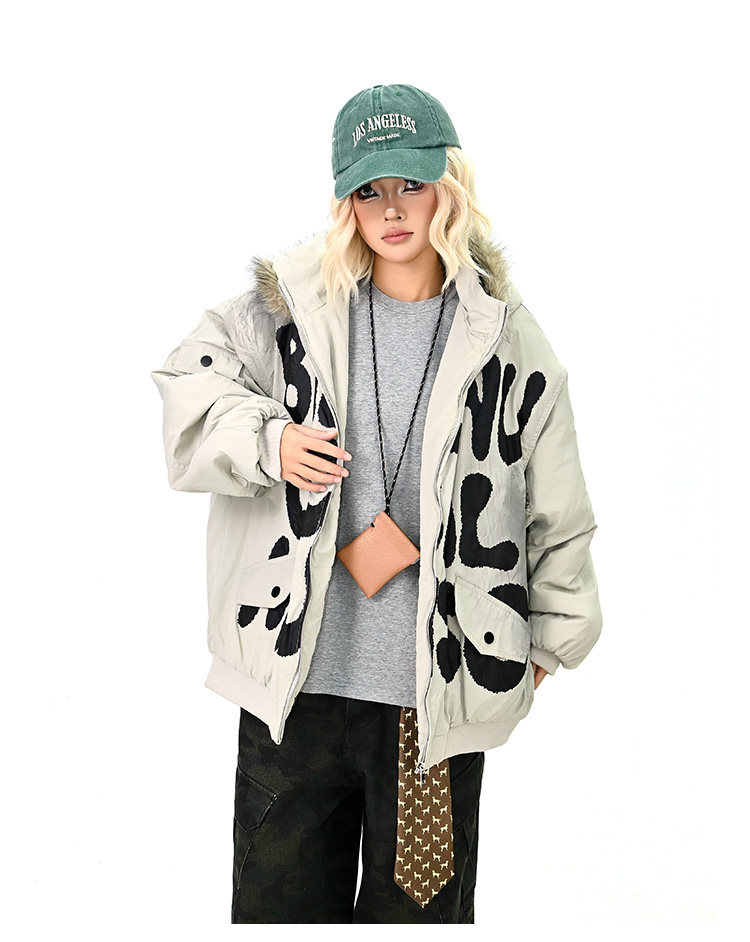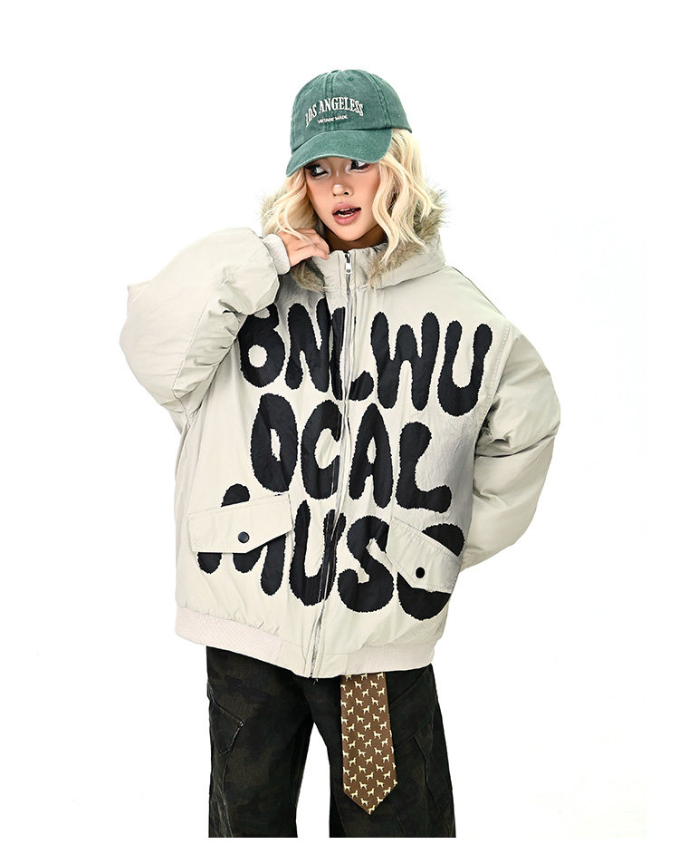【アウター】ロゴ入り ファー付きフードコート レディース 冬 ゆったりBF風 韓国風 学院風 綿入れコート【FCシリーズ】