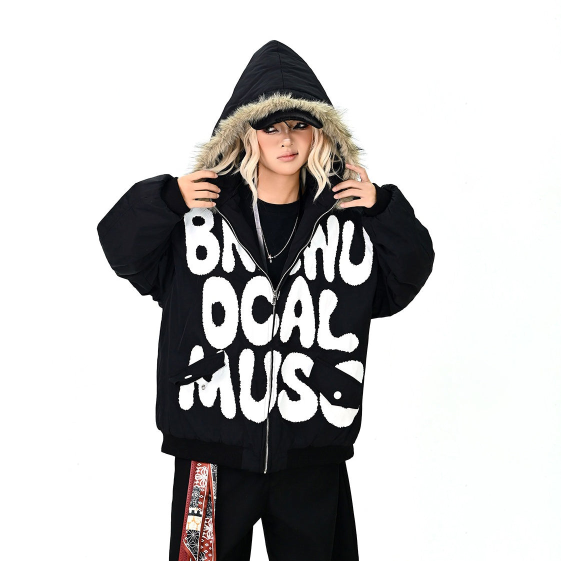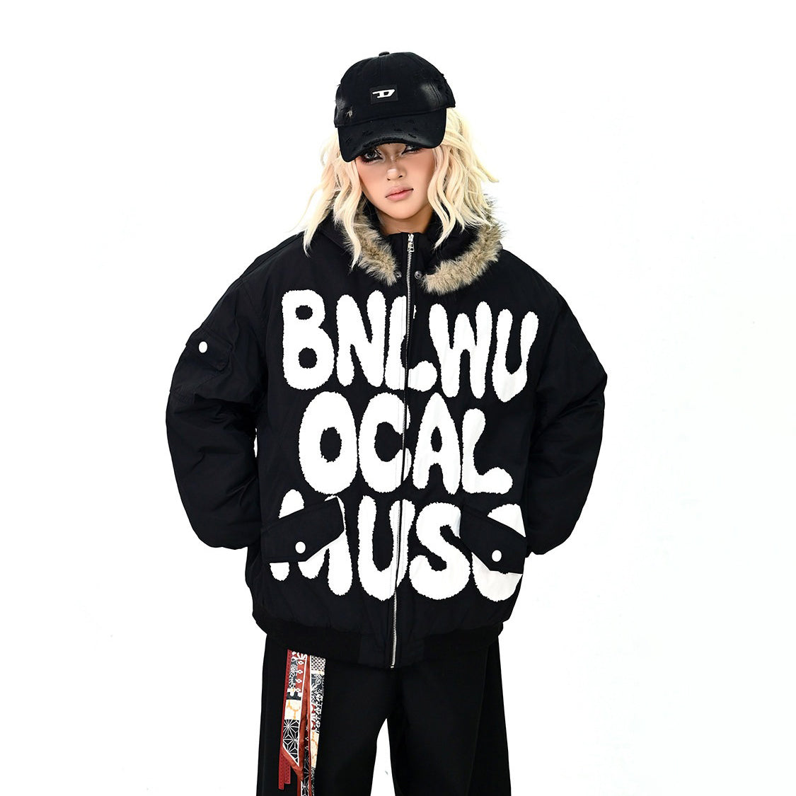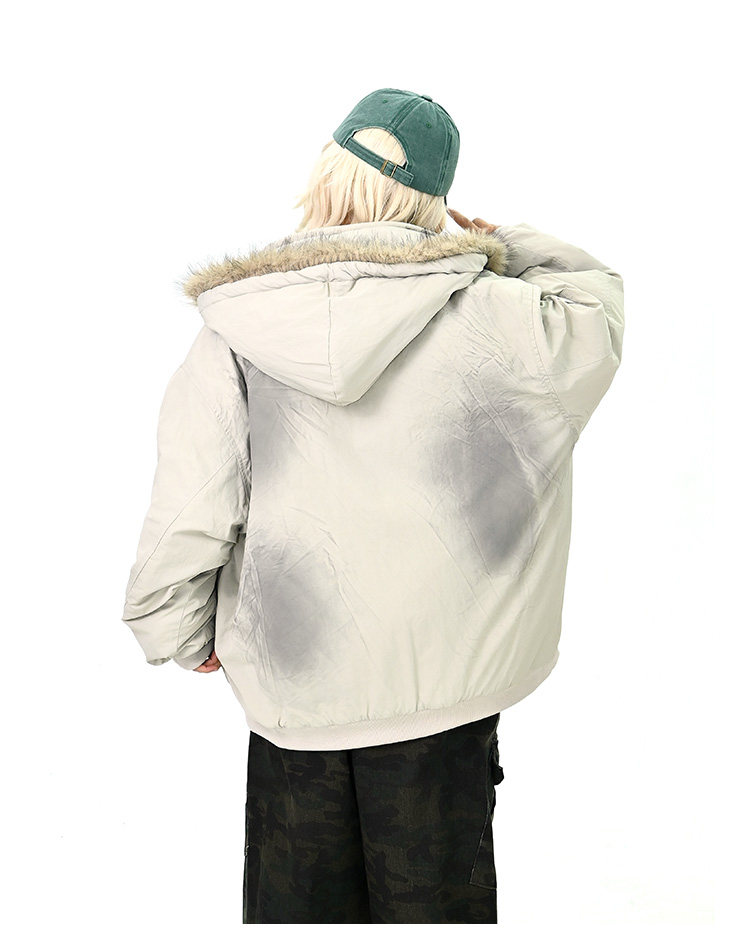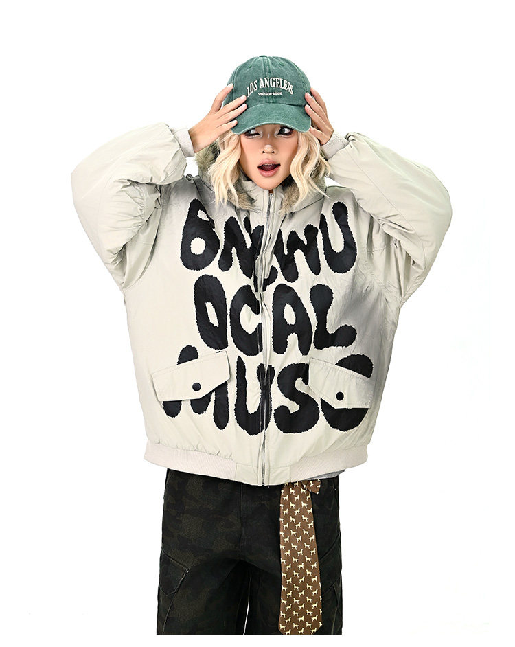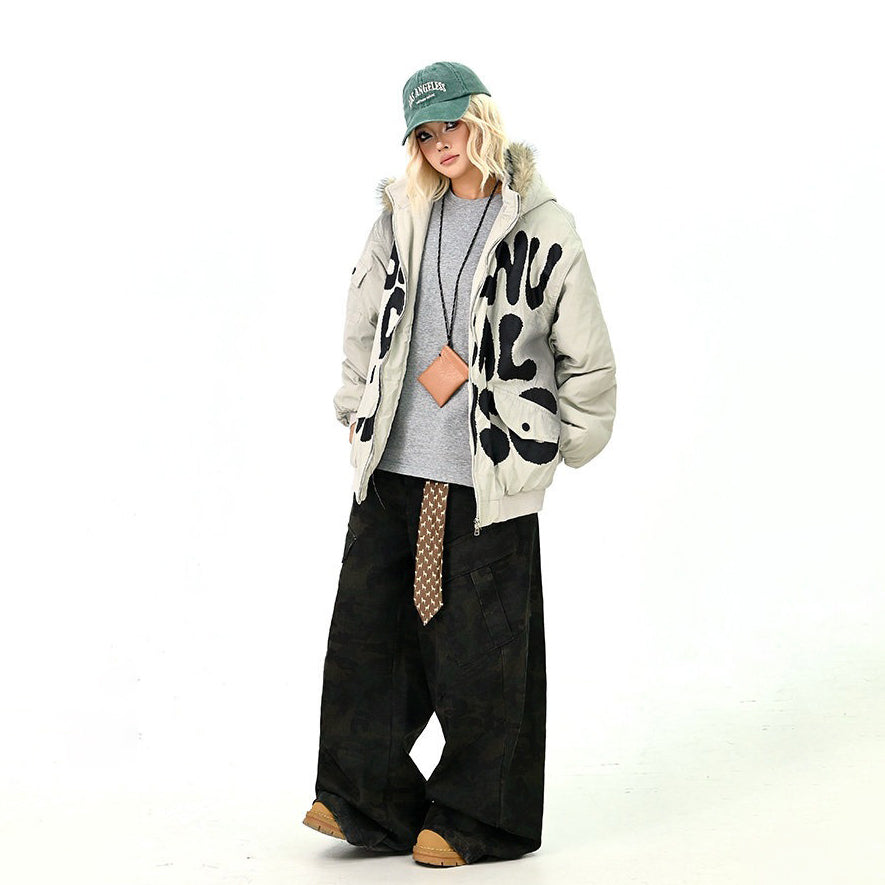 【アウター】ロゴ入り ファー付きフードコート レディース 冬 ゆったりBF風 韓国風 学院風 綿入れコート【FCシリーズ】