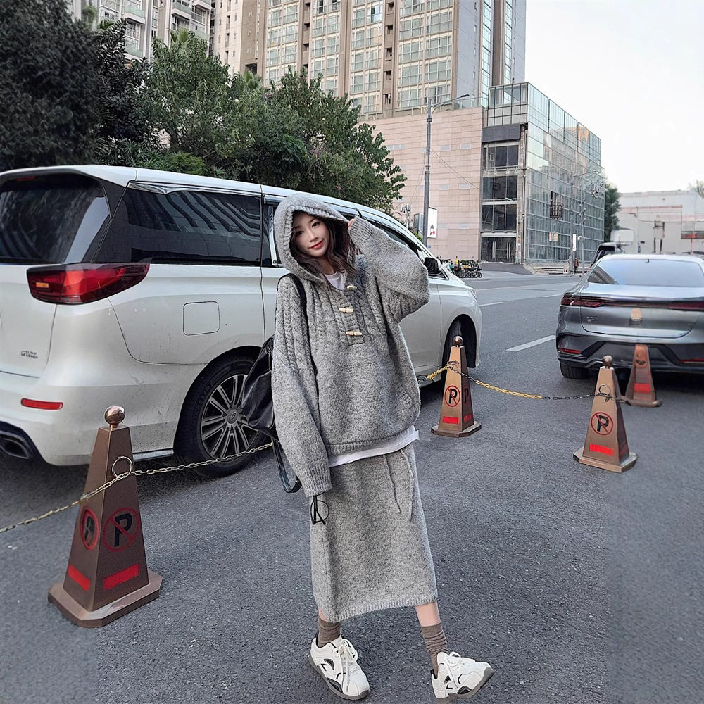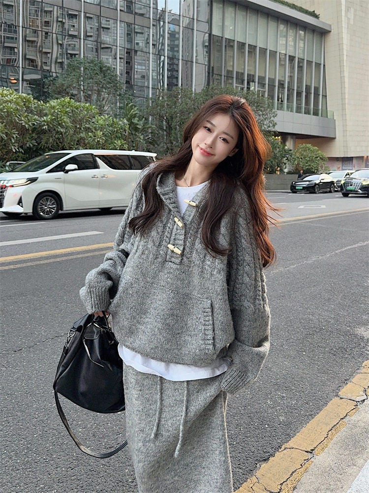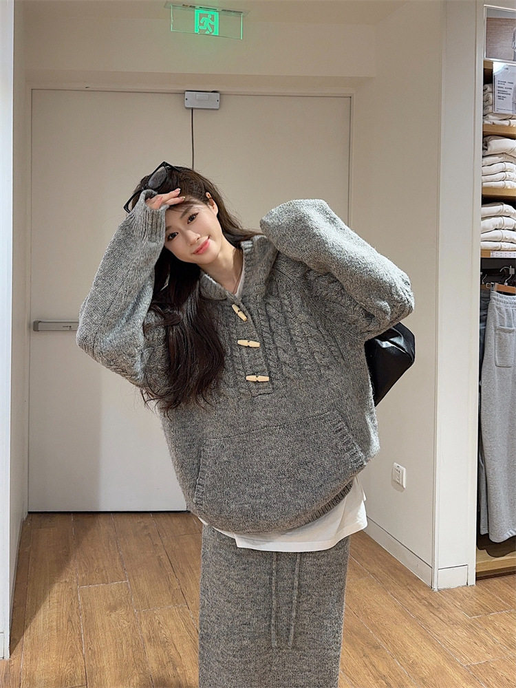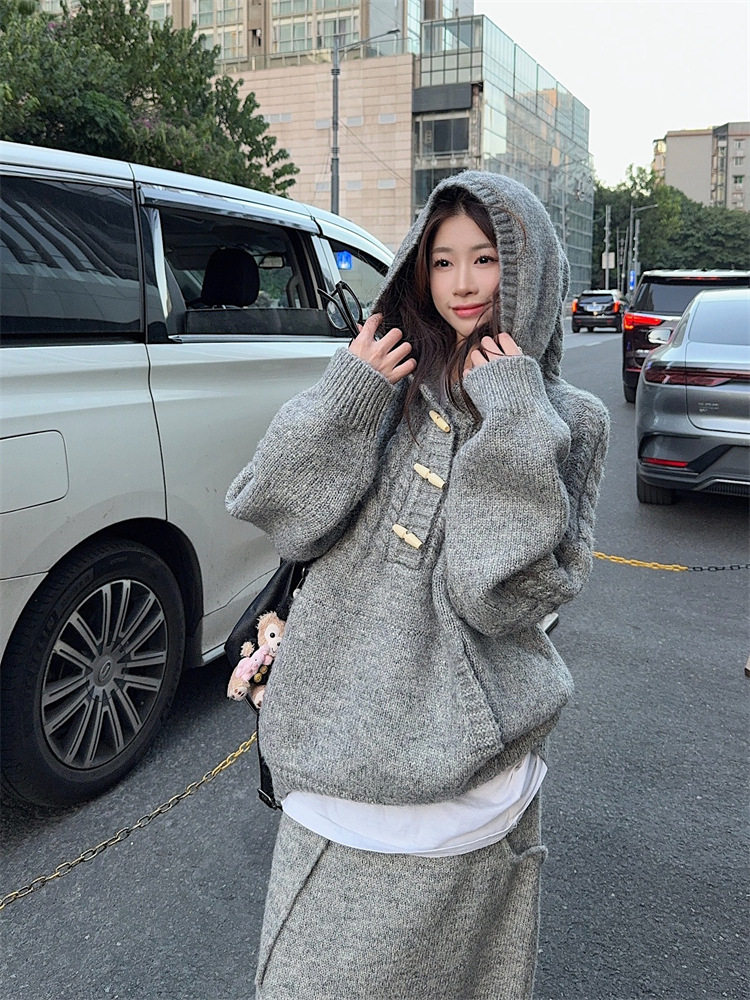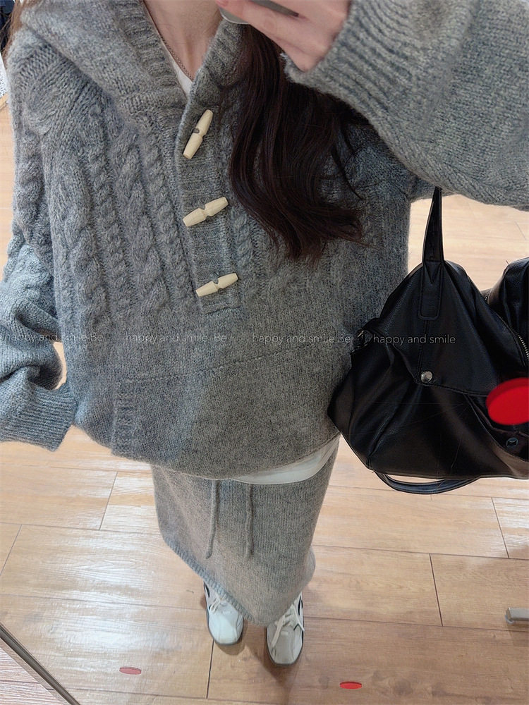 【60%OFF⭐️早い者勝ち】【セットアップ】リラックス感 トグルボタン プルオーバー フード付きニット + スカート 2点上下セット【JZシリーズ】