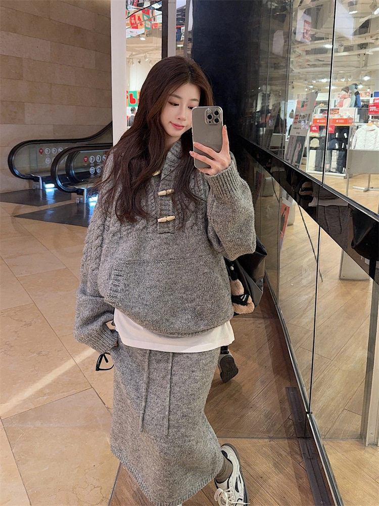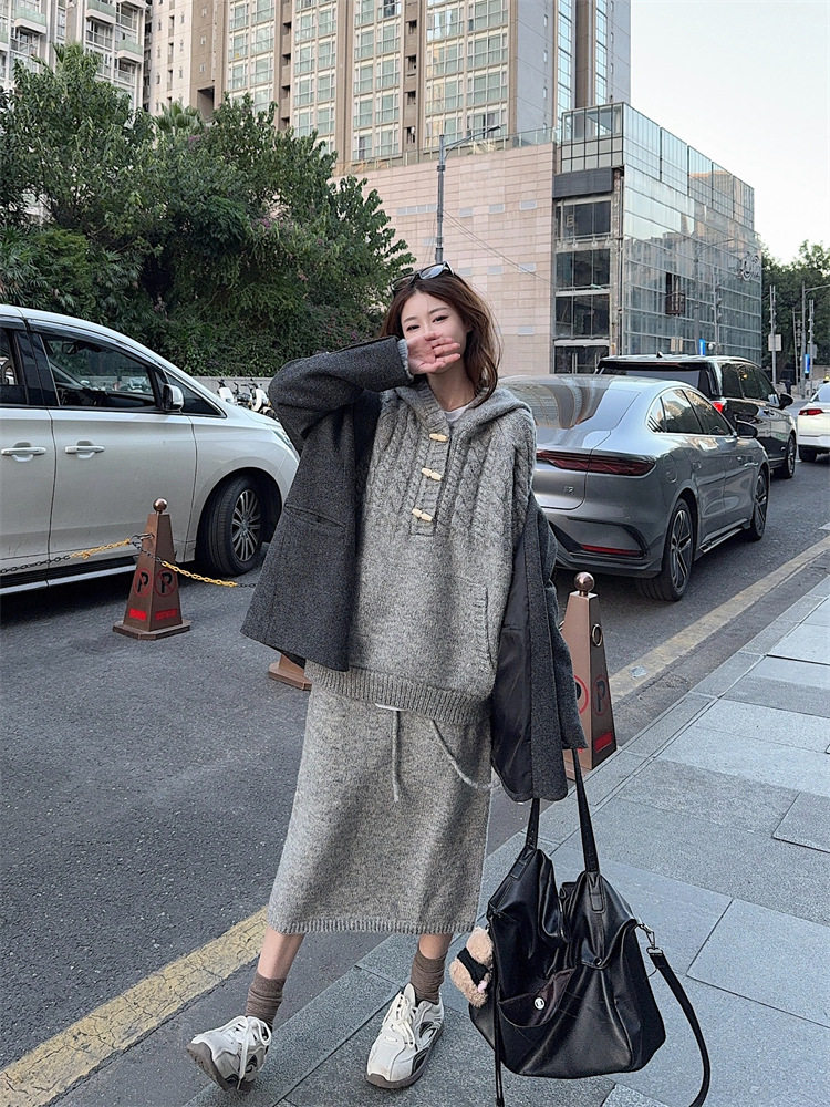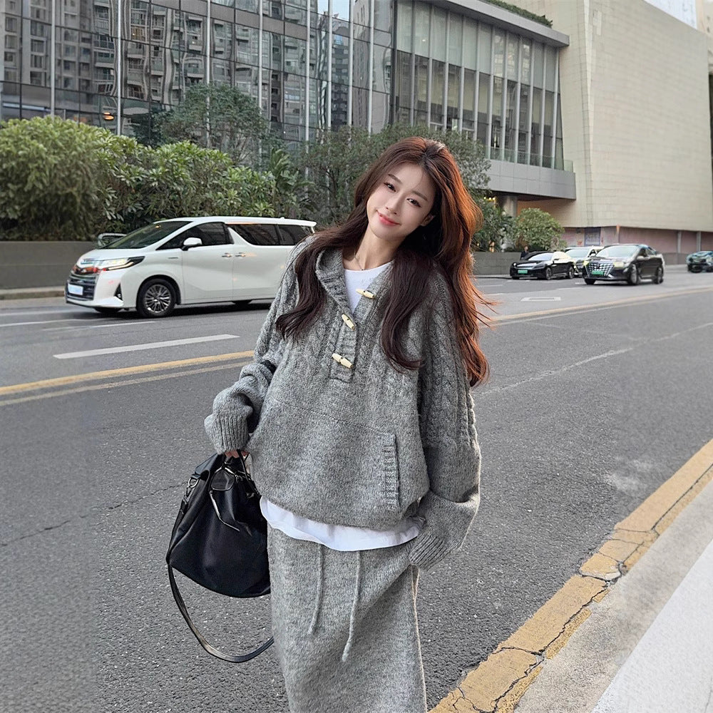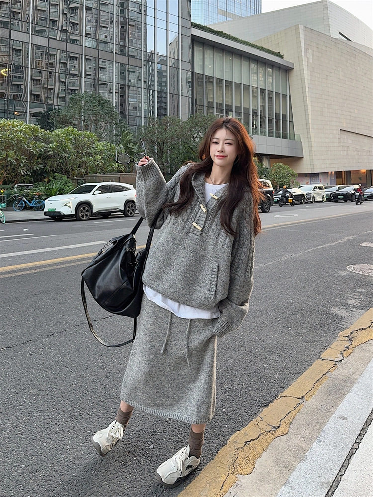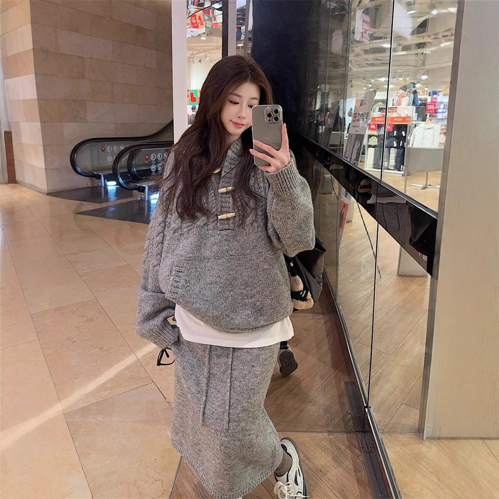 【60%OFF⭐️早い者勝ち】【セットアップ】リラックス感 トグルボタン プルオーバー フード付きニット + スカート 2点上下セット【JZシリーズ】