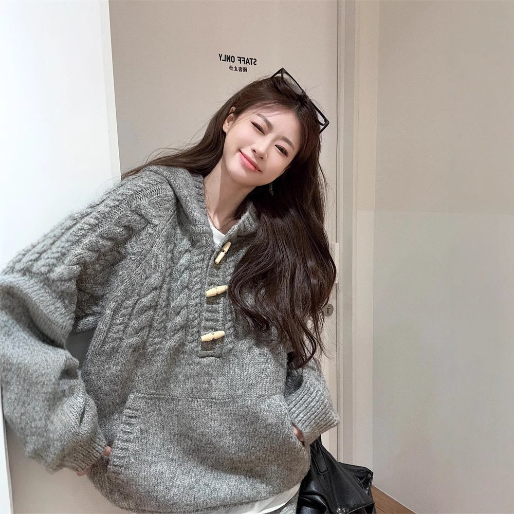 【トップス】ふわふわ カートゥーン柄 フード付きニットセーター レディース 新作 オーバーサイズ BF風 韓国風 ゆるニット【FCシリーズ】