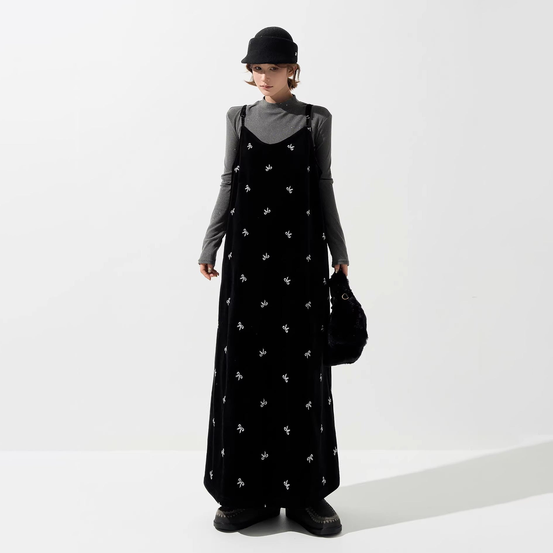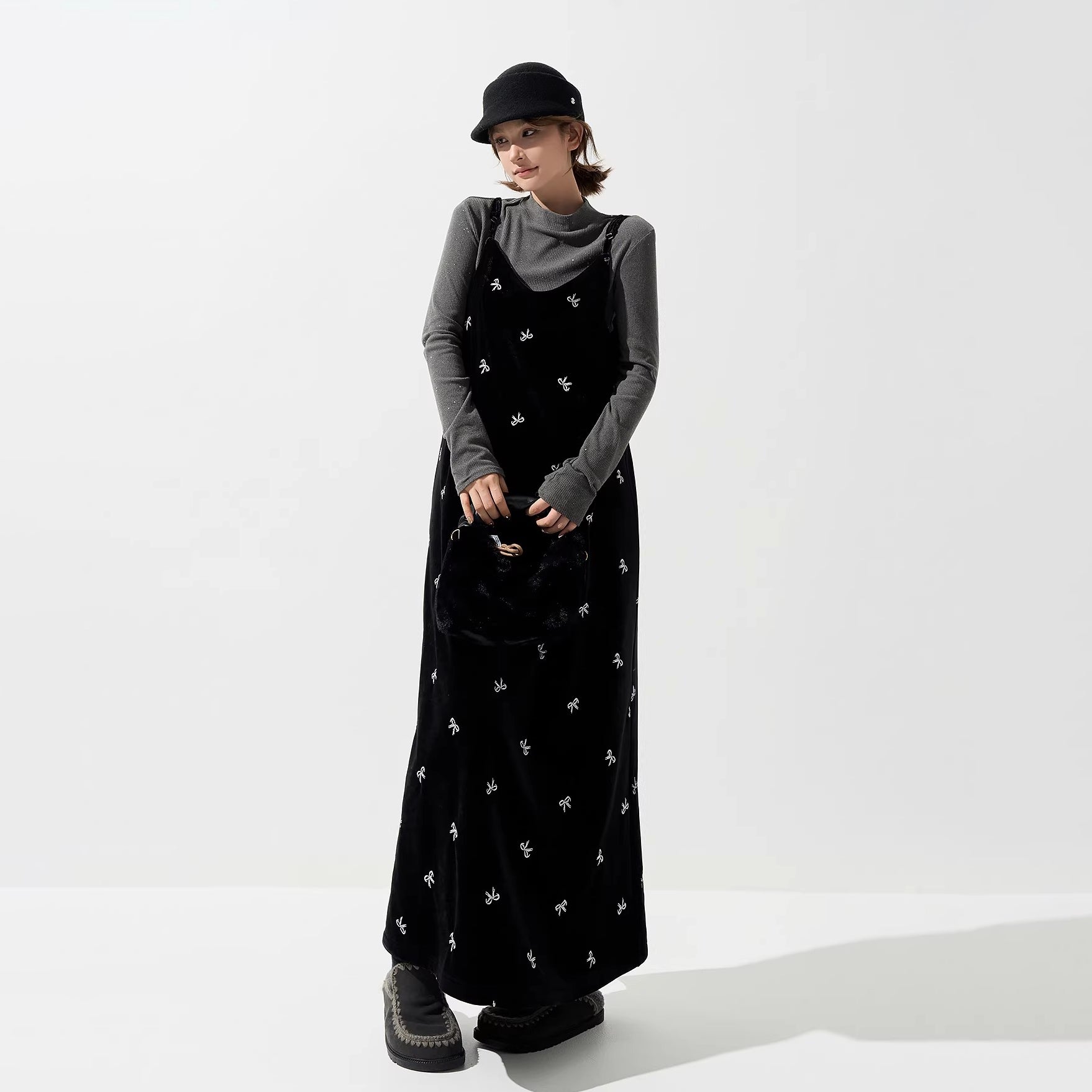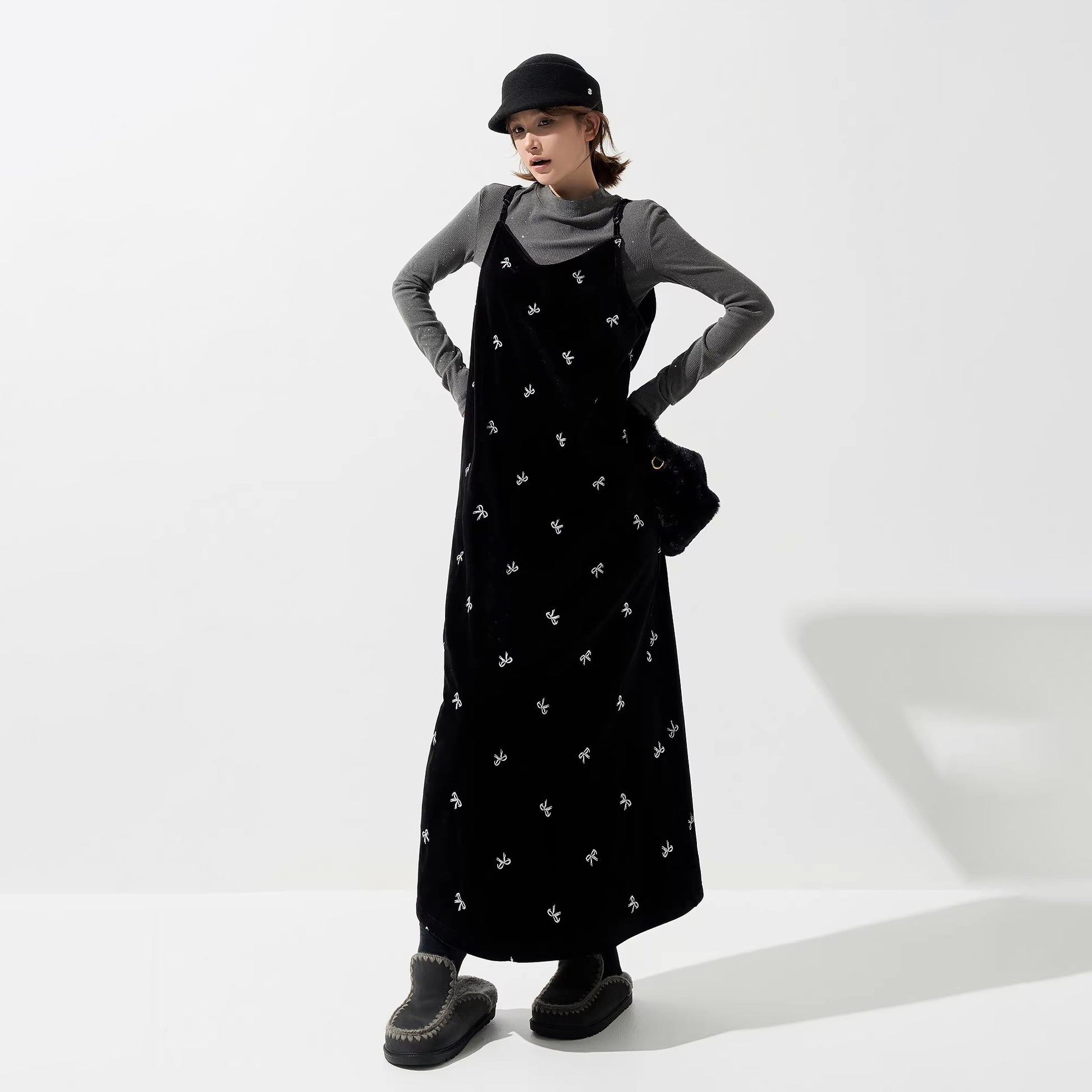 【商品名】【ワンピース】ベロア刺繍 Vネック ノースリーブ ワンピース レディース 秋冬 韓国風 厚手 Aライン ロング丈【SHシリーズ】