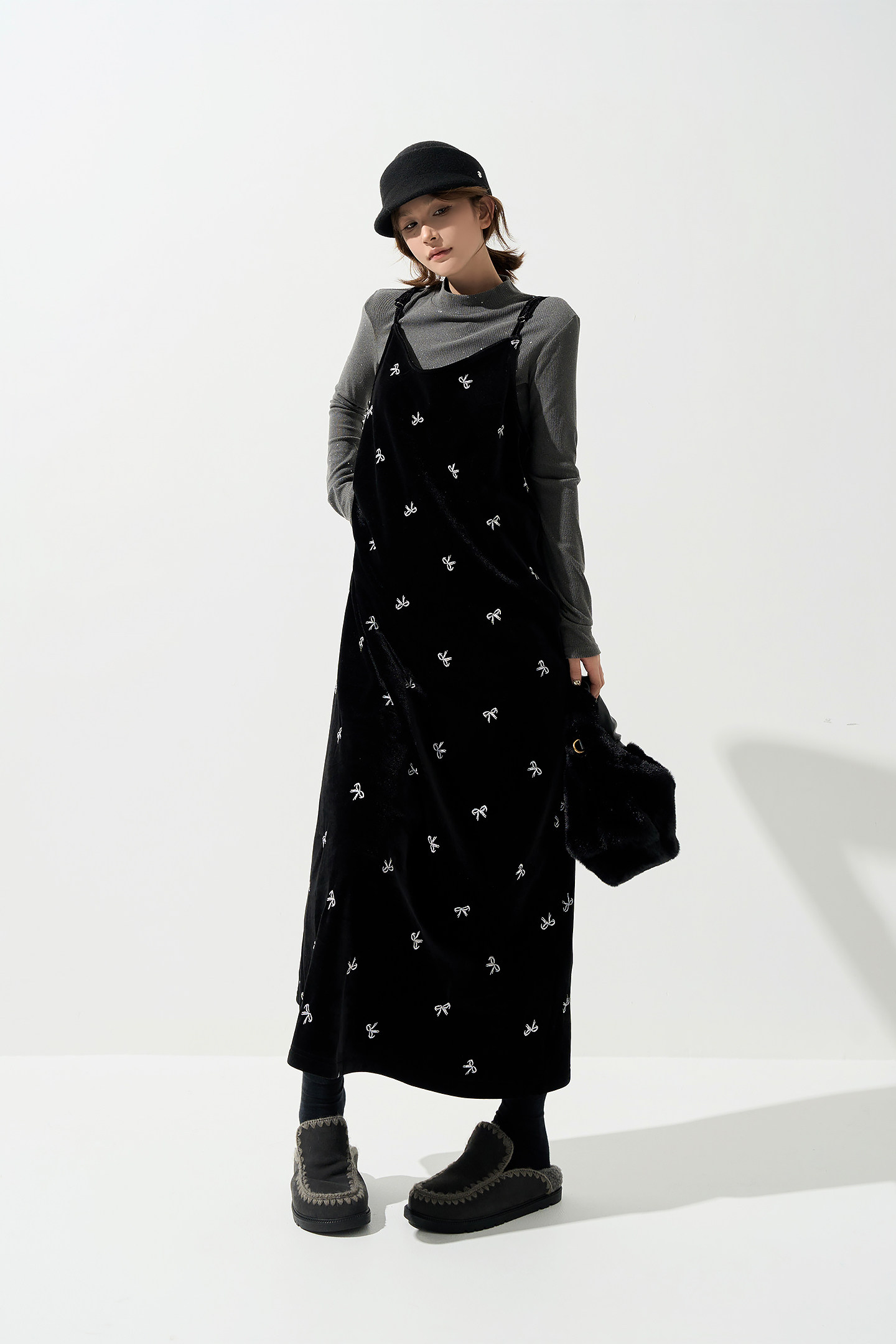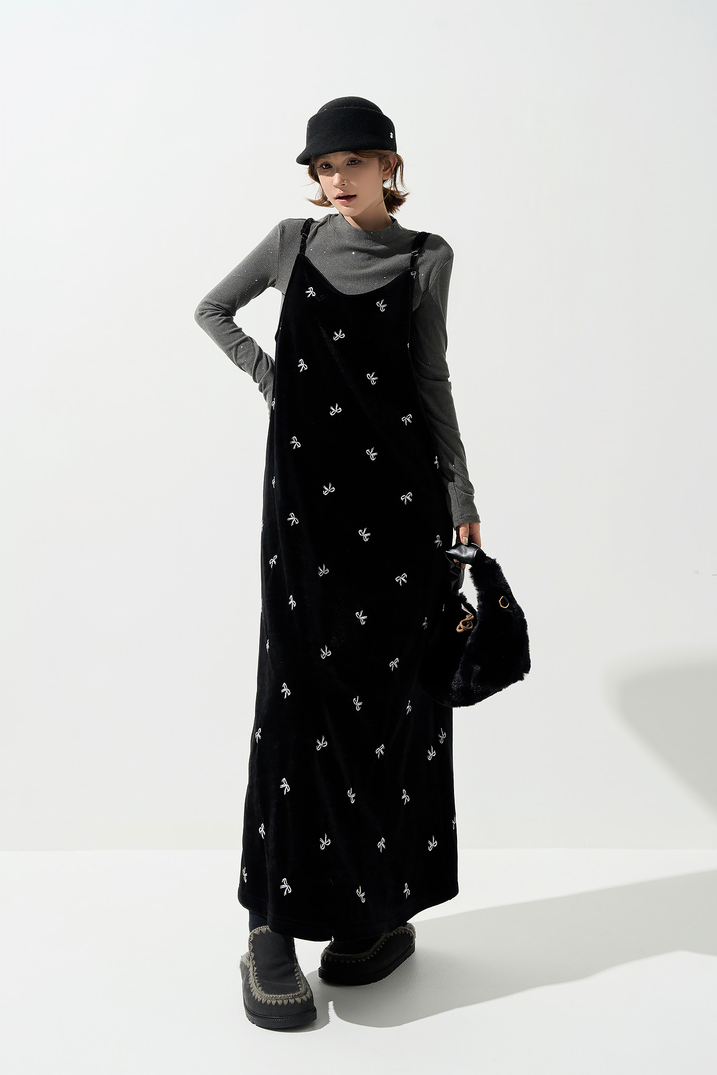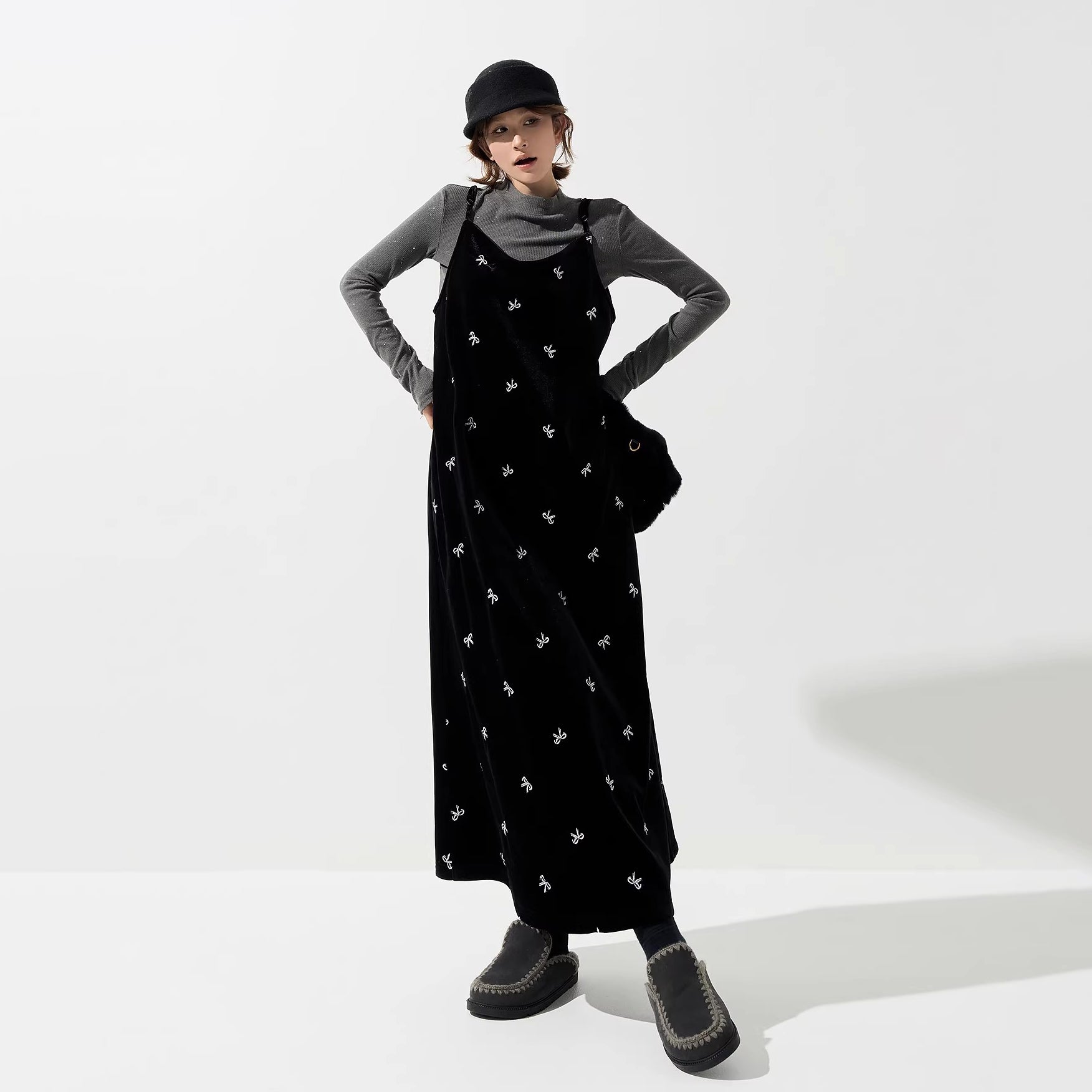【商品名】【ワンピース】ベロア刺繍 Vネック ノースリーブ ワンピース レディース 秋冬 韓国風 厚手 Aライン ロング丈【SHシリーズ】