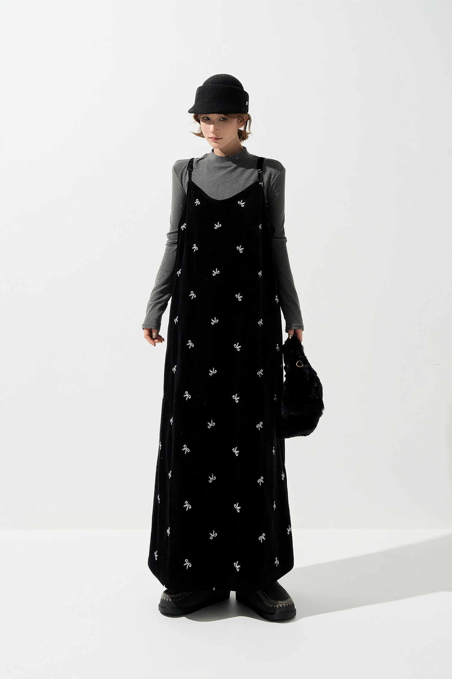 【ワンピース】ベロア刺繍 Vネック ノースリーブ ワンピース レディース 秋冬 韓国風 厚手 Aライン ロング丈【SHシリーズ】