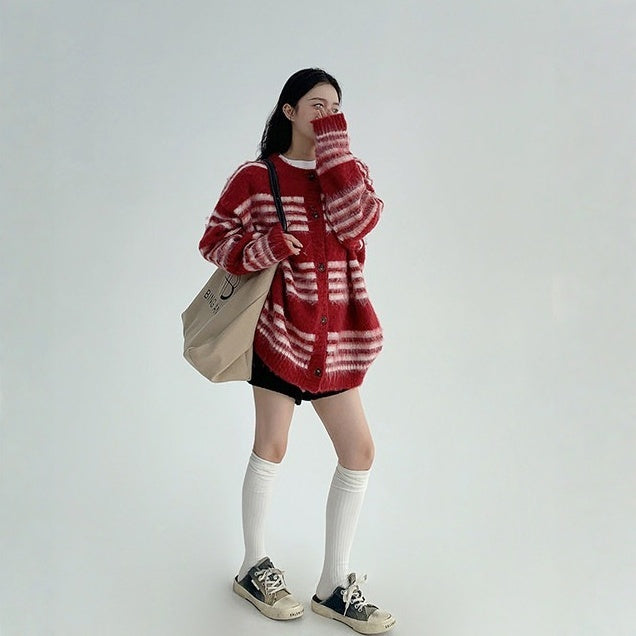 【トップス】ふわふわ カートゥーン柄 フード付きニットセーター レディース 新作 オーバーサイズ BF風 韓国風 ゆるニット【FCシリーズ】
