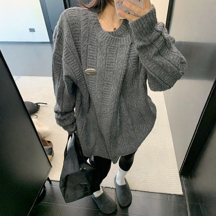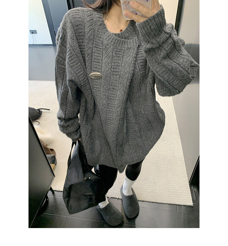 【トップス】ヴィンテージ風 デザイン 犬柄 クルーネック フェイクレイヤード ニットパーカー レディース 秋 ゆったり 着回し トップス【FCシリーズ】