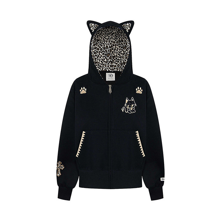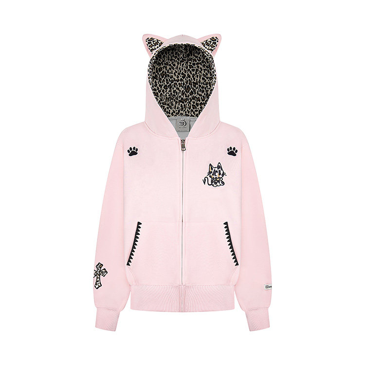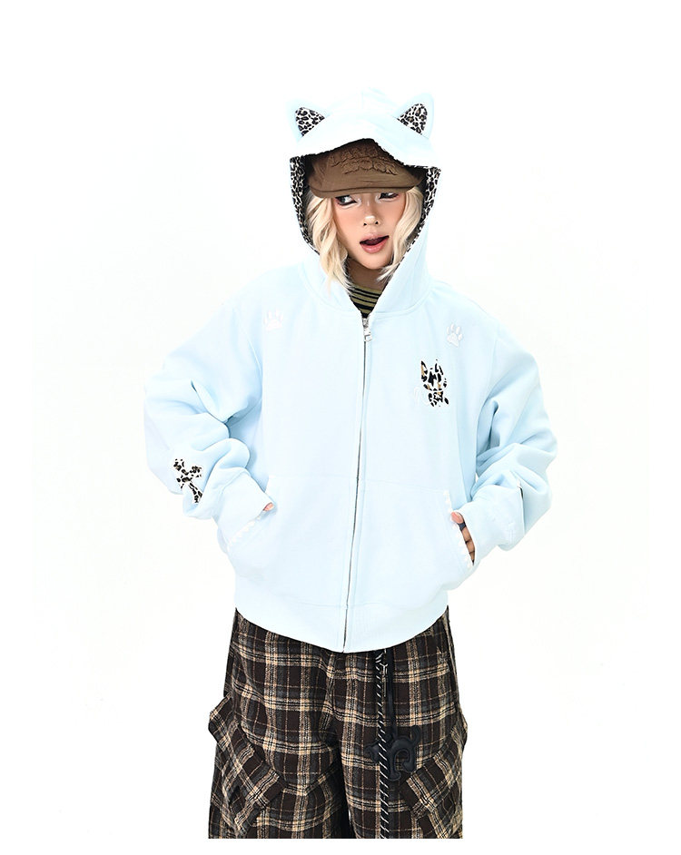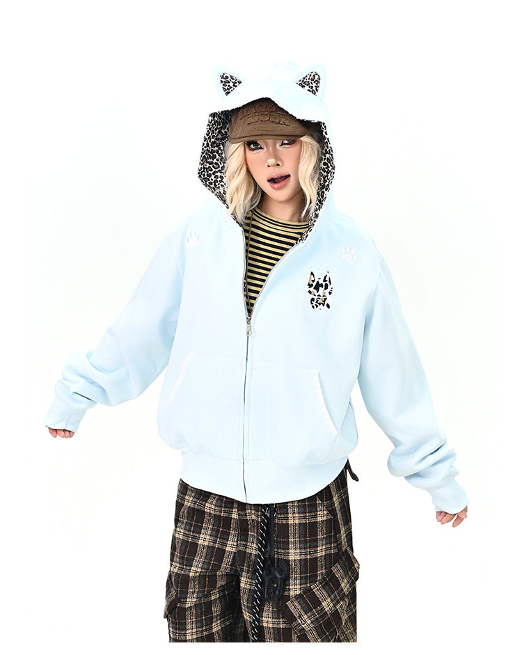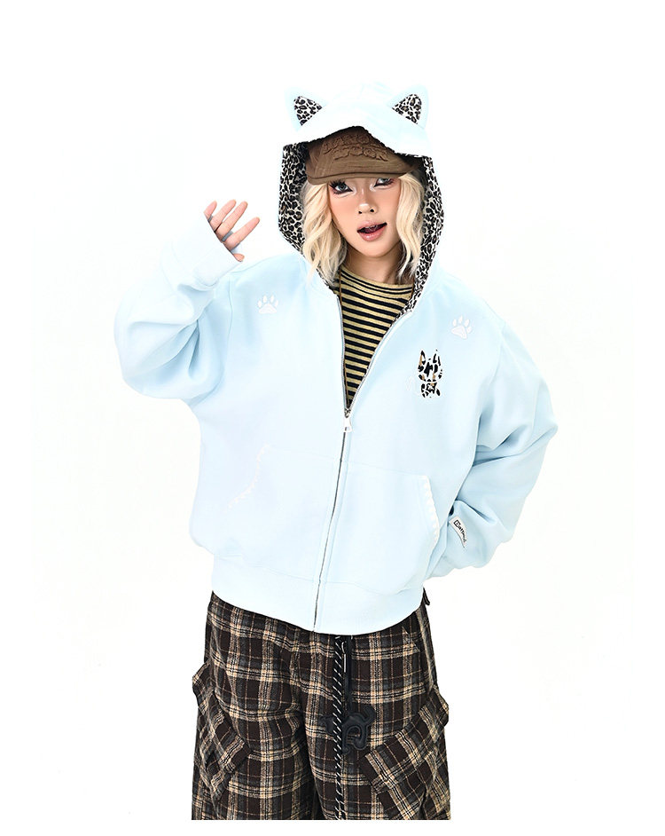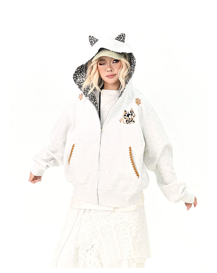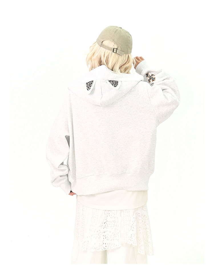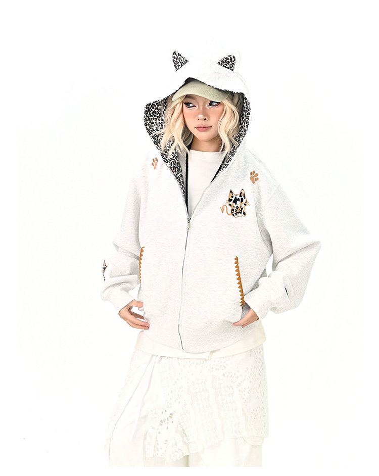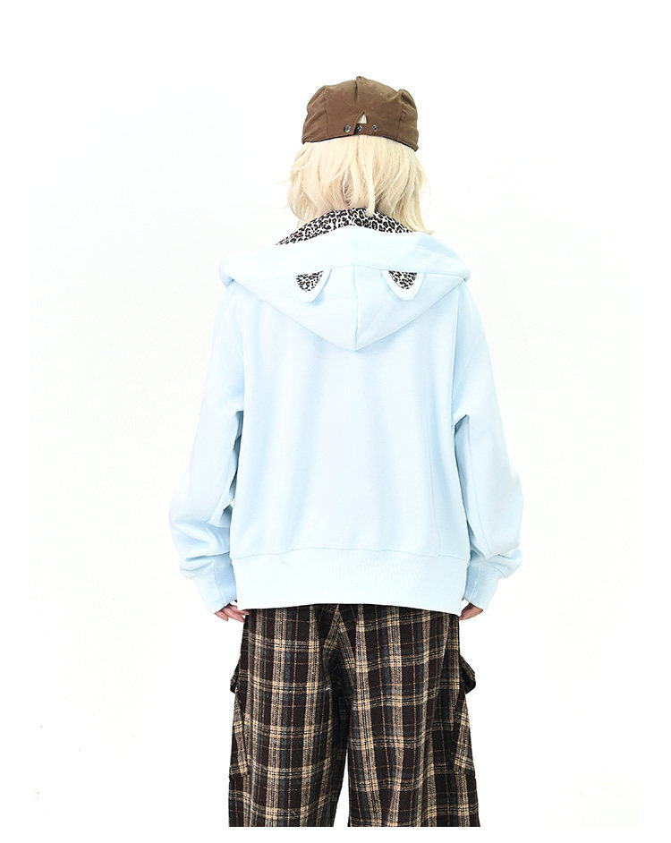 【アウター】レオパード柄 猫耳 フードジップアップ スウェット レディース ゆったりBF風 カジュアルジャケット【シリーズ】