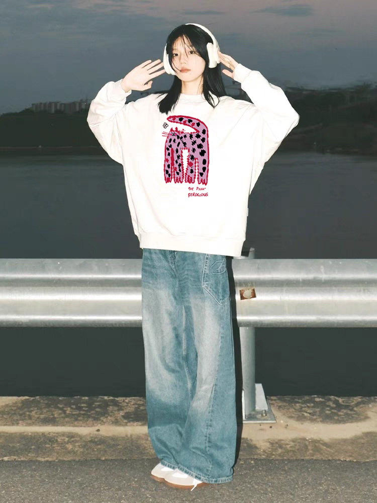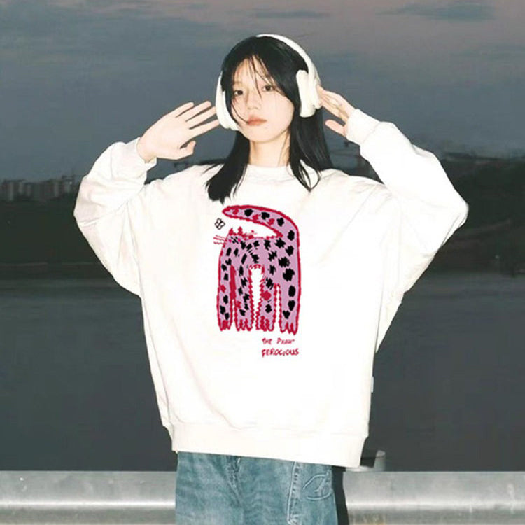 S~2XL【トップス】クルーネック ネコ スウェット レディース 韓国風 ゆったり 学生風 豹柄 猫 秋冬パーカー【FCシリーズ】