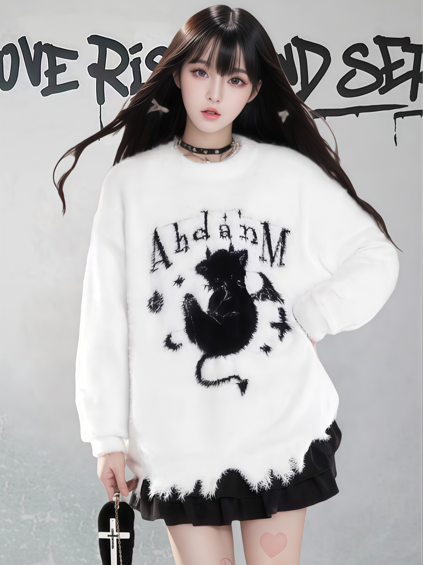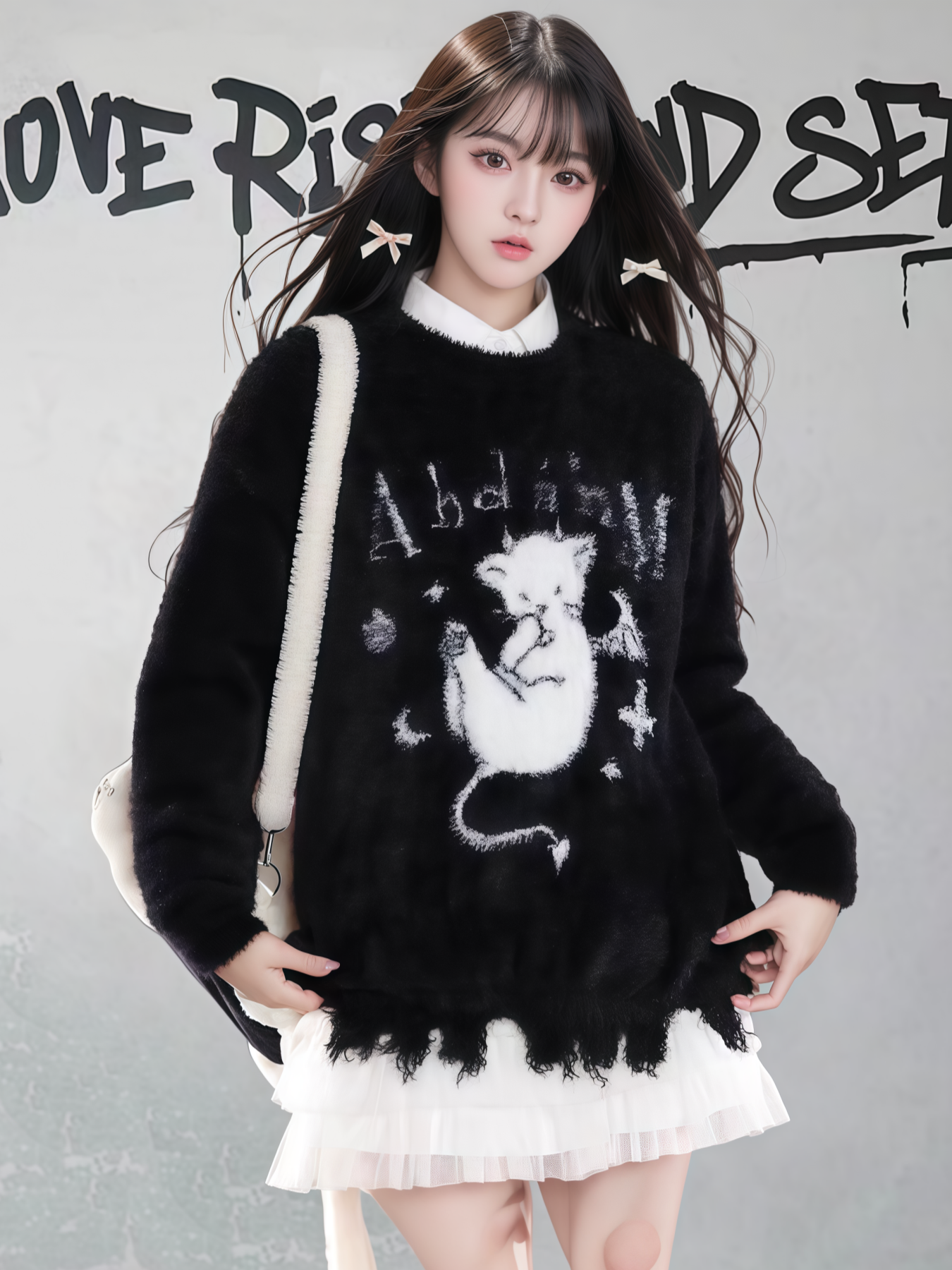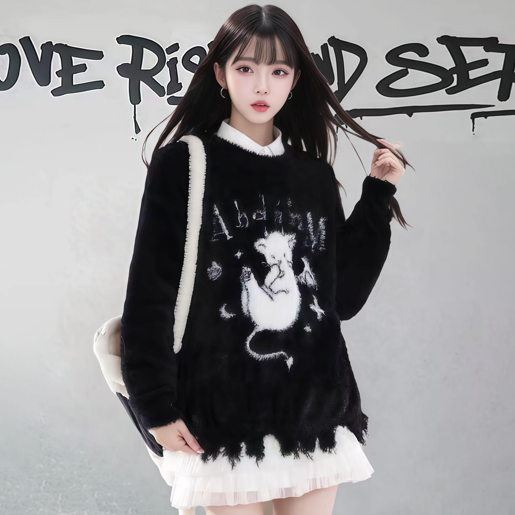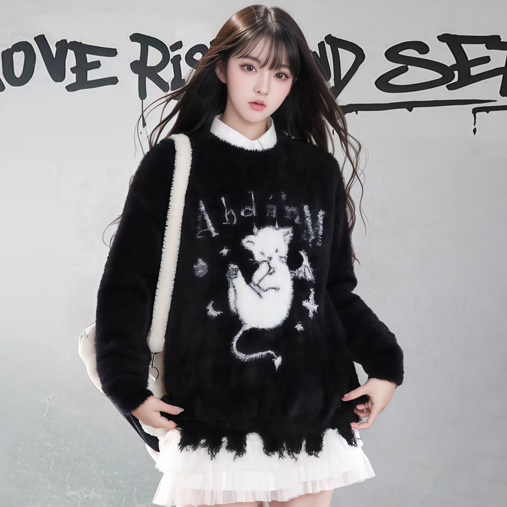 【商品名】【トップス】ダメージ加工 猫モチーフ ニットセーター レディース 秋冬 ゆったり ルーズ カジュアル【FCシリーズ】