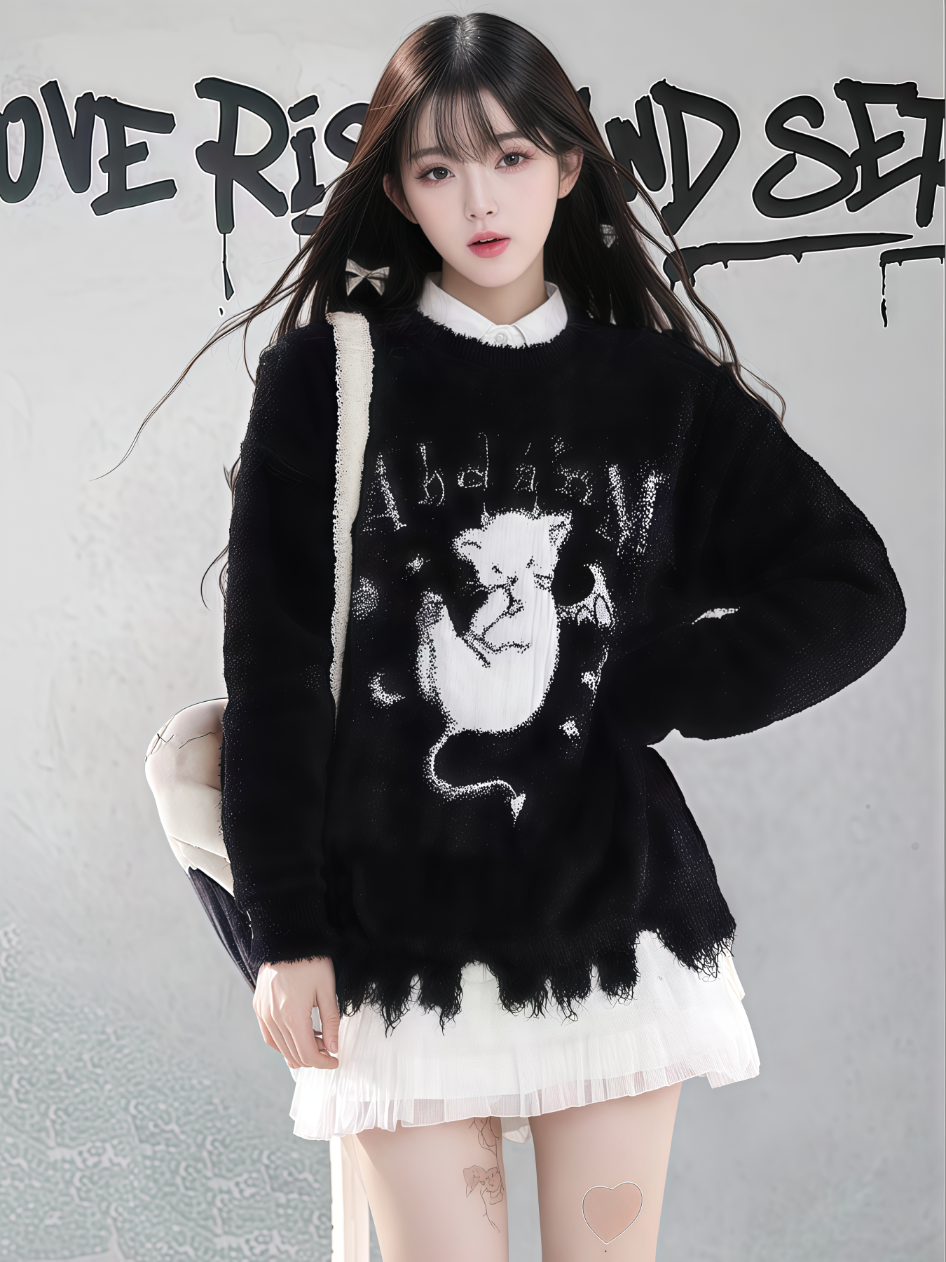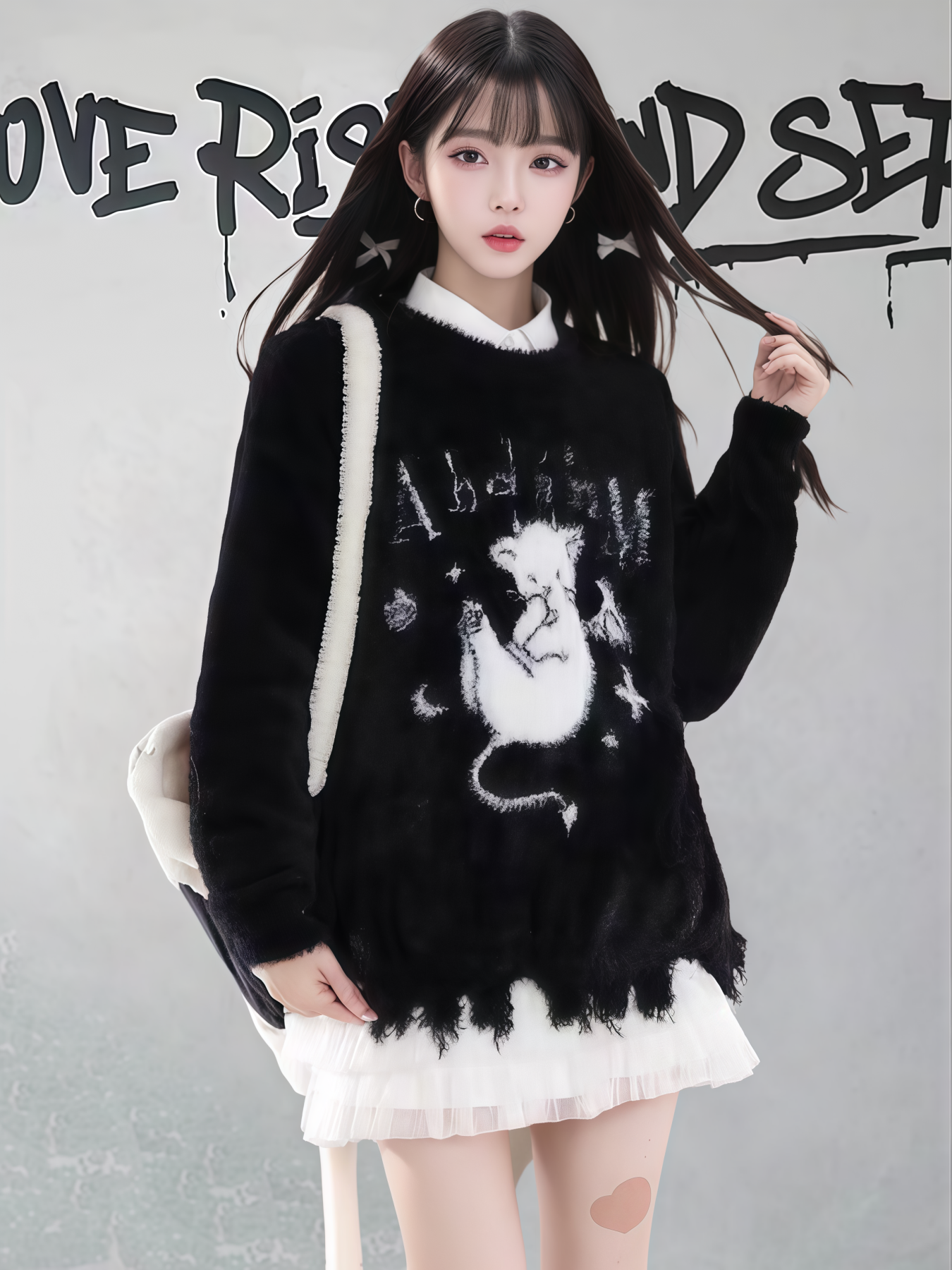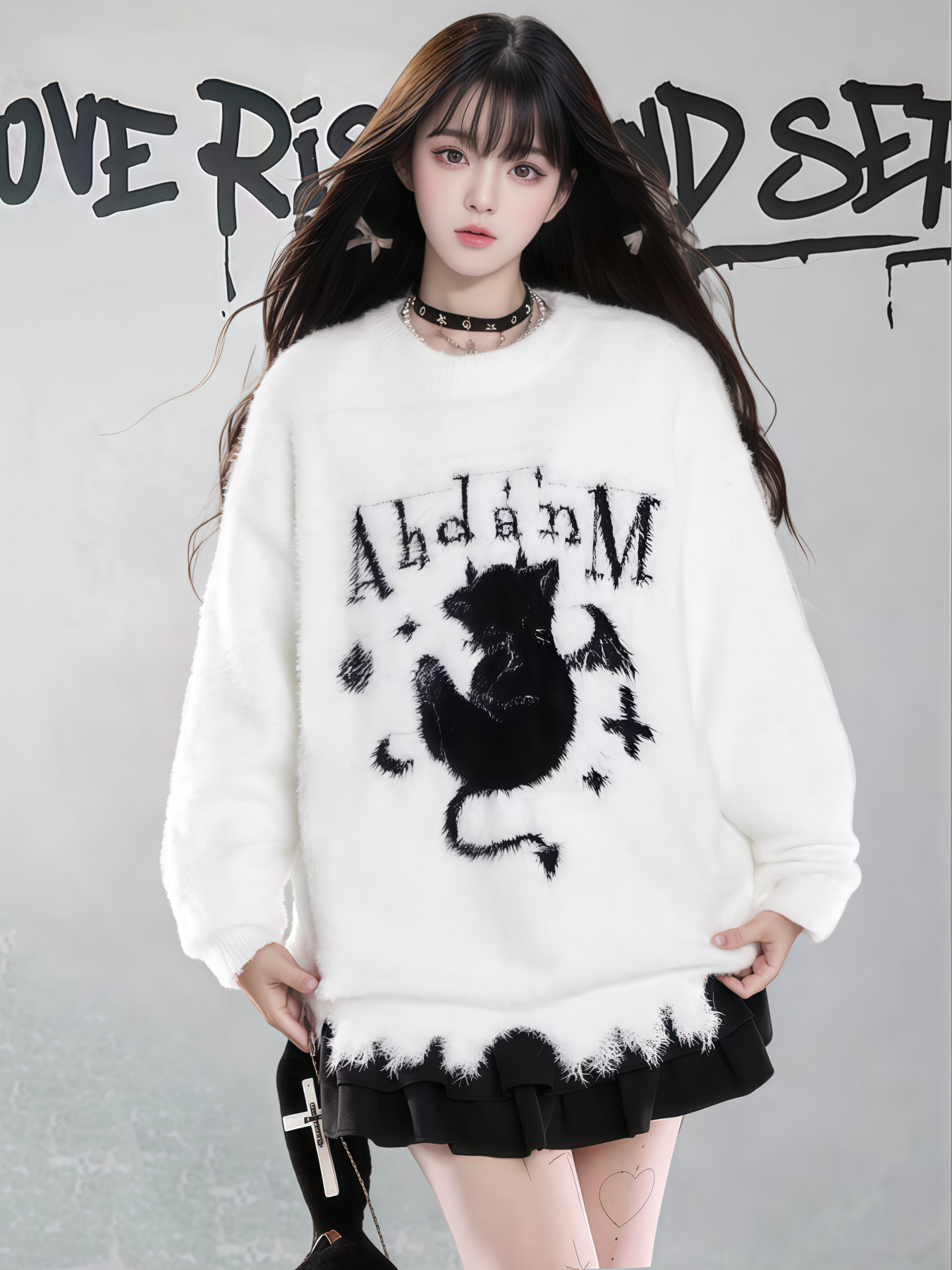 【商品名】【トップス】ダメージ加工 猫モチーフ ニットセーター レディース 秋冬 ゆったり ルーズ カジュアル【FCシリーズ】