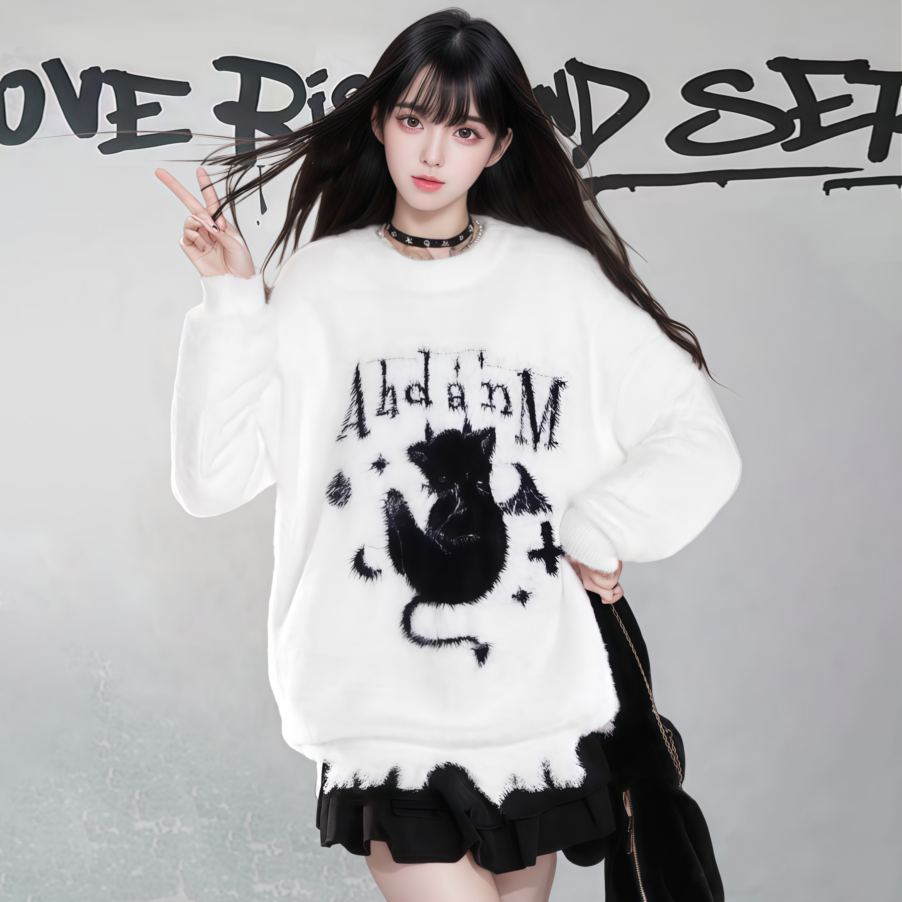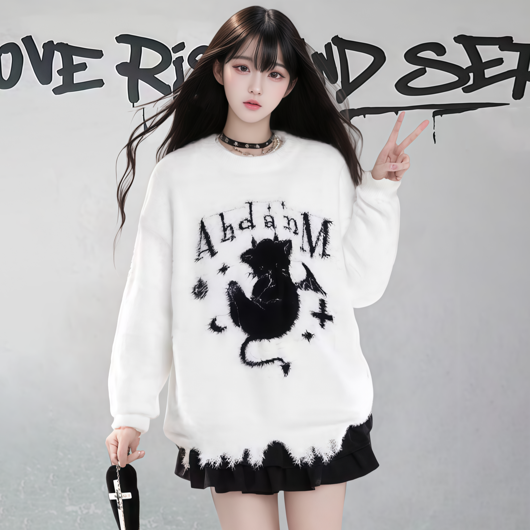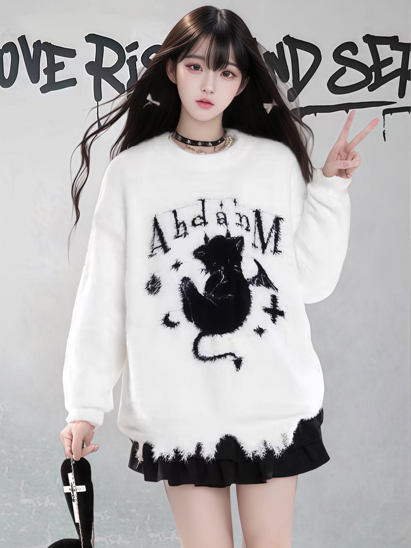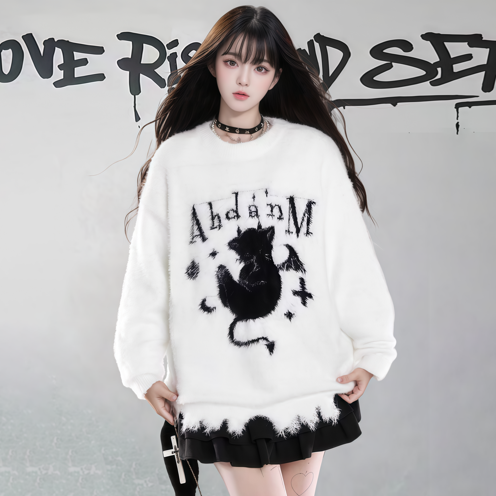 【商品名】【トップス】ダメージ加工 猫モチーフ ニットセーター レディース 秋冬 ゆったり ルーズ カジュアル【FCシリーズ】